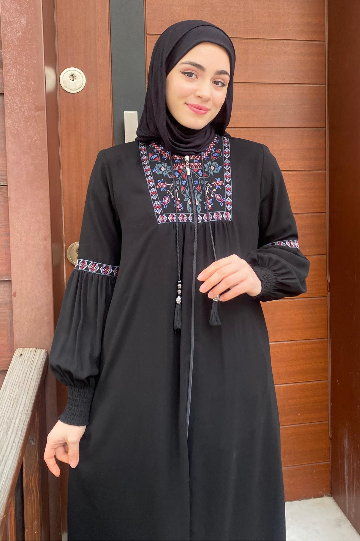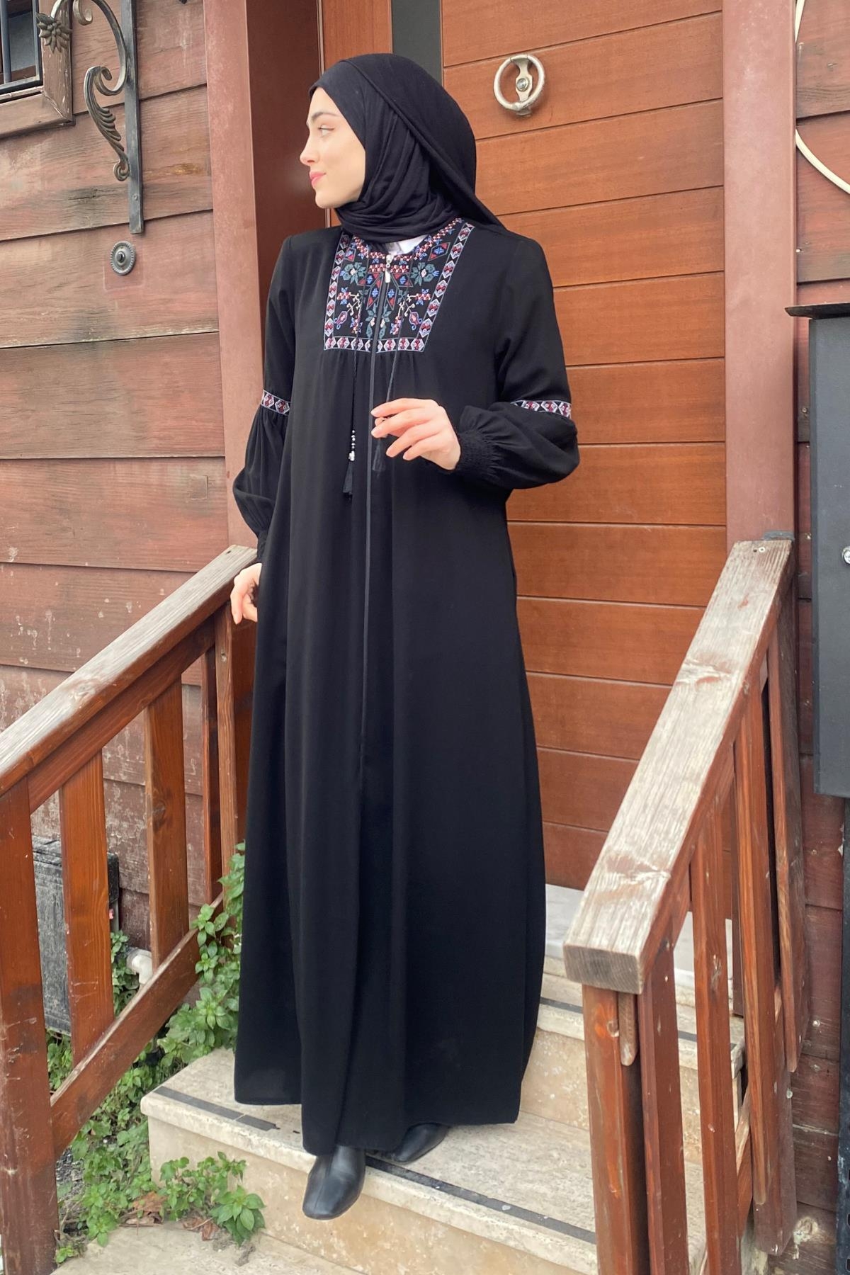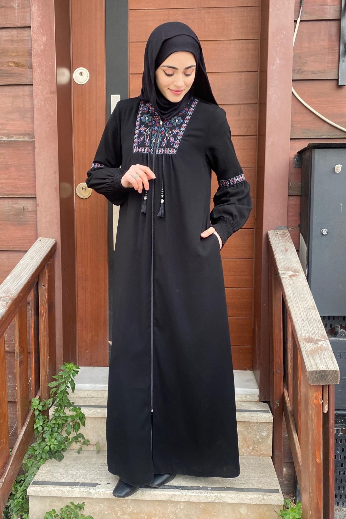 Kilim nakış detayları ve aksesuarlı yaka bağcığı ile özgün bir dokunuş sunan Ahsen Kilim Nakışlı Ferace fermuar ve cepleriyle pratikliği de ön planda tutar.