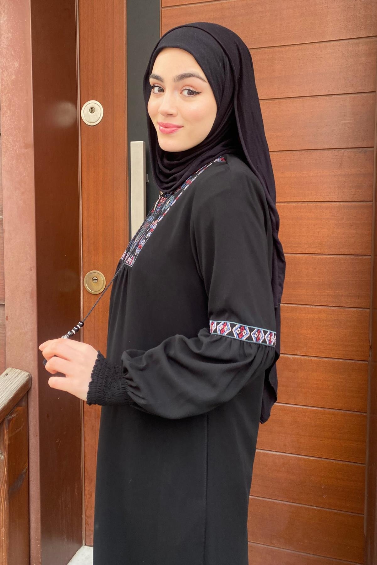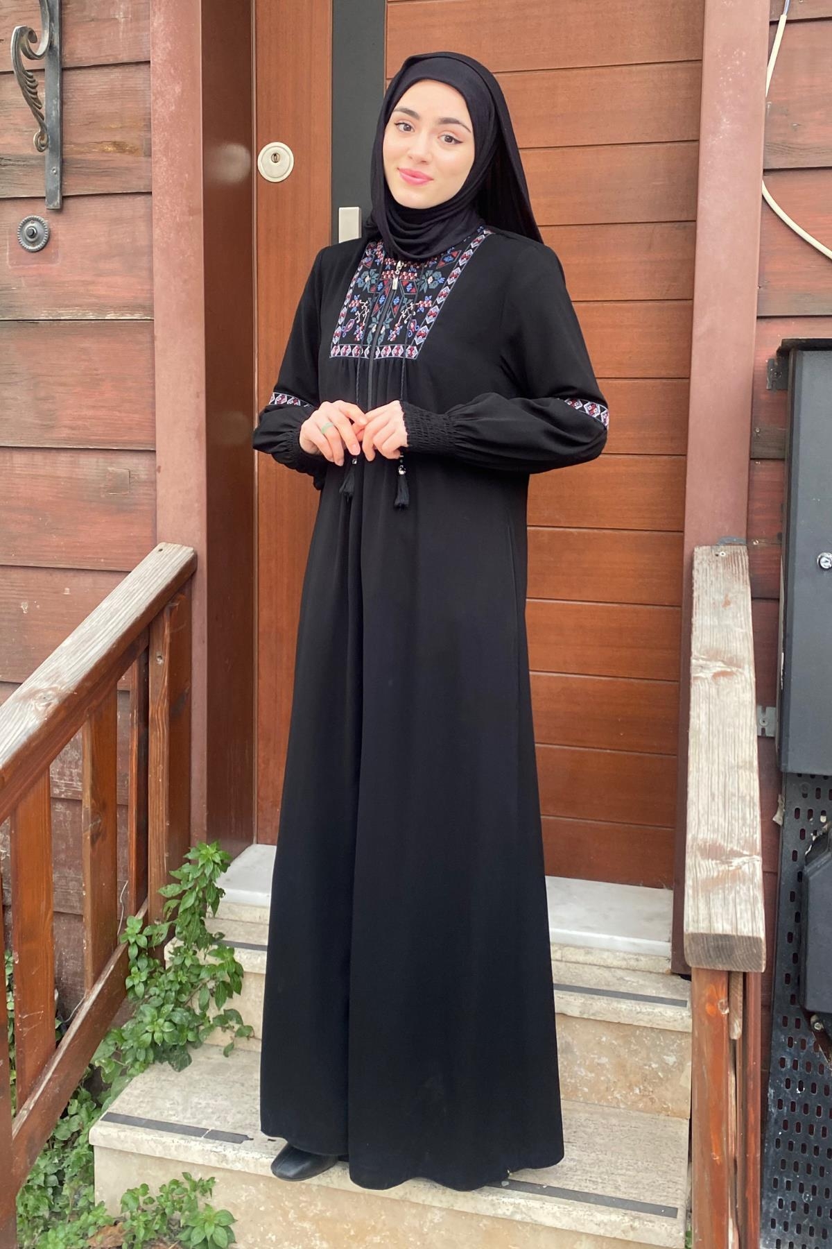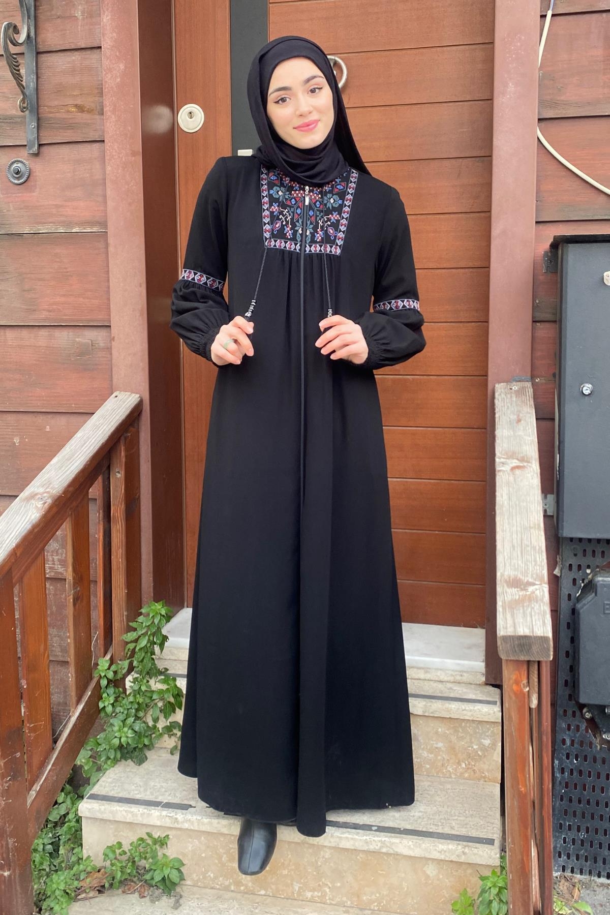 Kilim nakış detayları ve aksesuarlı yaka bağcığı ile özgün bir dokunuş sunan Ahsen Kilim Nakışlı Ferace fermuar ve cepleriyle pratikliği de ön planda tutar.