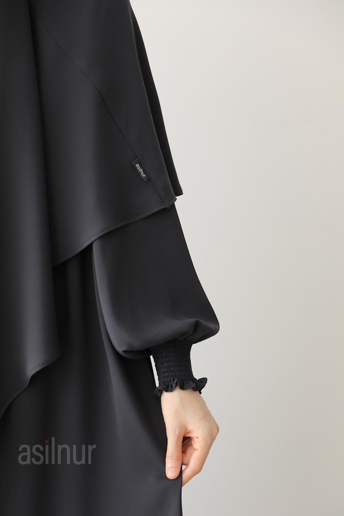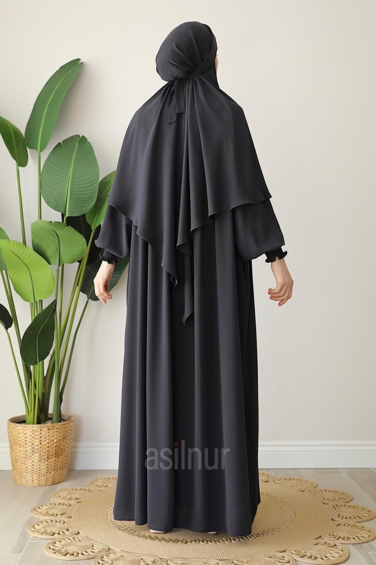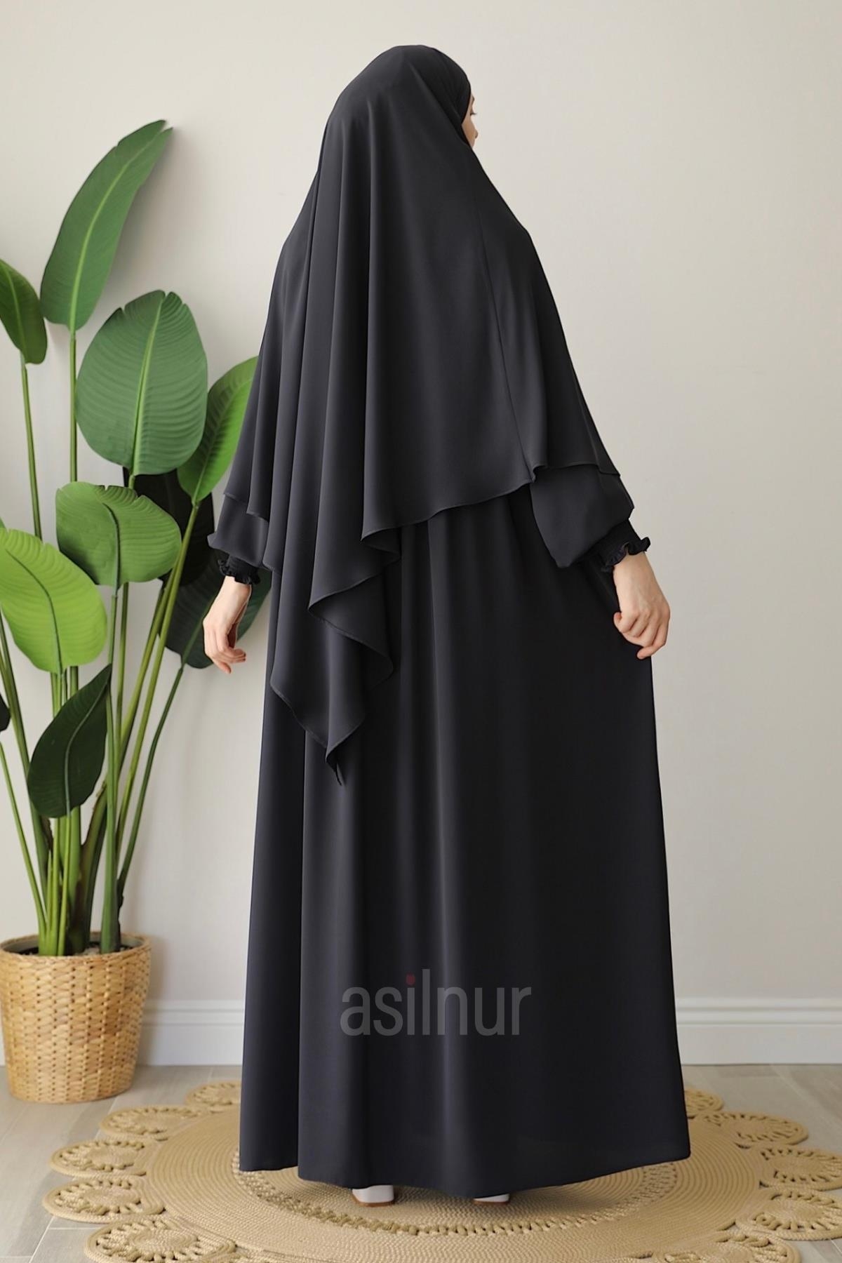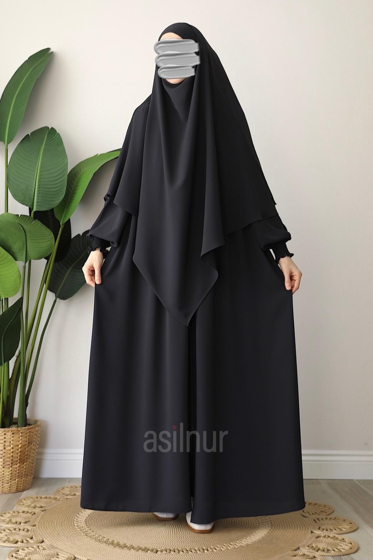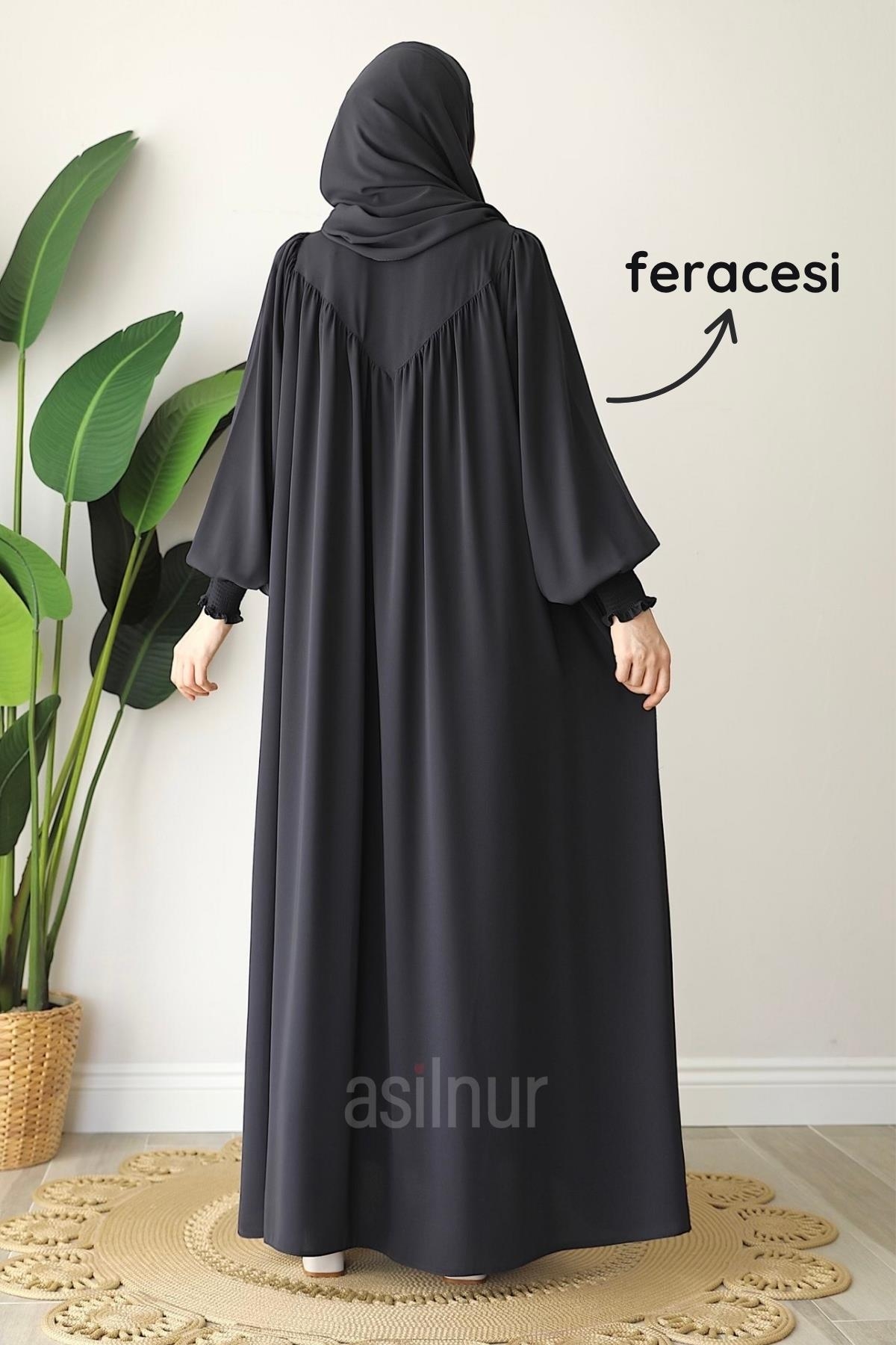 Alya Ferace Sufle Hediyeli Takım, yüksek kaliteli 1. sınıf Mısır Medine ipeği ile üretilmiştir. Kol kısmındaki gipe lastik detayı, kullanım rahatlığının yanı sıra modern bir şıklık da sağlar. Fermuarlı tasarımı sayesinde kolayca giyilip çıkarılabilir. Yan cepleri pratiklik sunarken, takımla uyumlu sufle hediye olarak pakete dahildir.