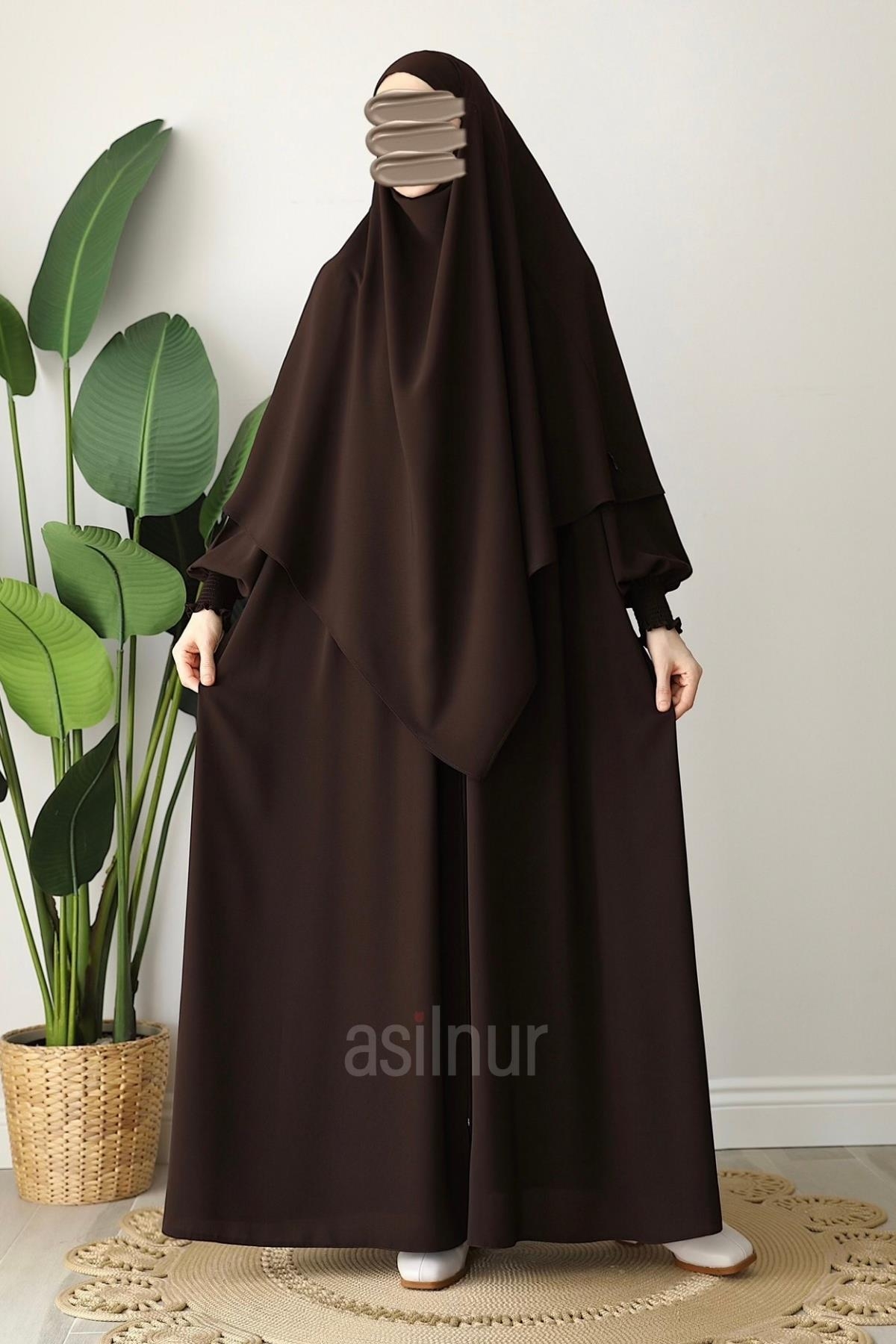 Alya Ferace Sufle Hediyeli Takım, yüksek kaliteli 1. sınıf Mısır Medine ipeği ile üretilmiştir. Kol kısmındaki gipe lastik detayı, kullanım rahatlığının yanı sıra modern bir şıklık da sağlar. Fermuarlı tasarımı sayesinde kolayca giyilip çıkarılabilir. Yan cepleri pratiklik sunarken, takımla uyumlu sufle hediye olarak pakete dahildir.