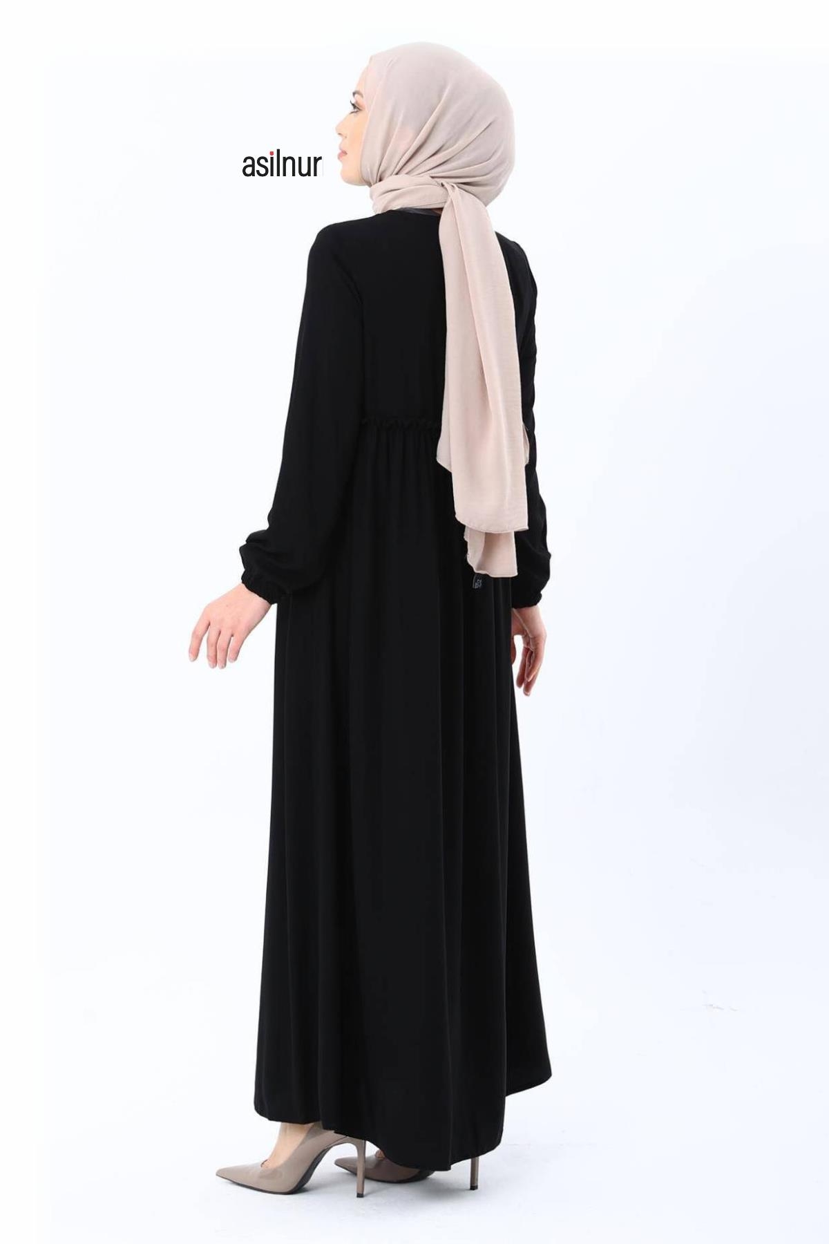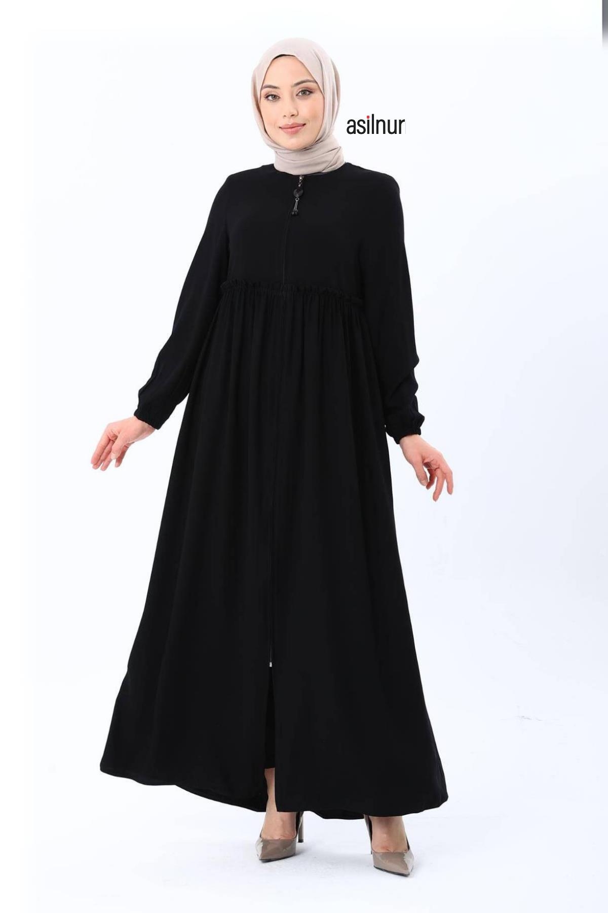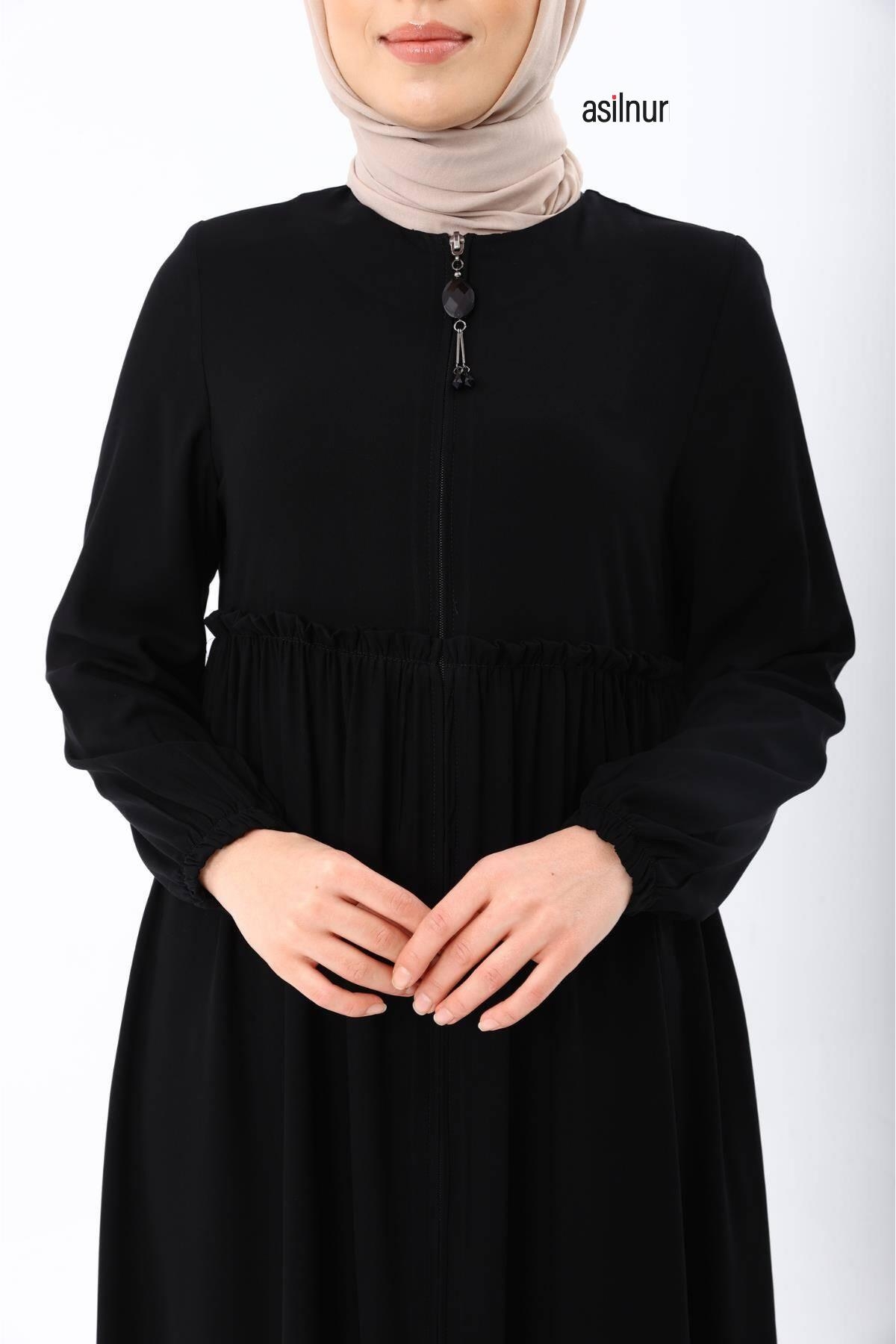 Erva Ferace Rabia krep kumaşıyla dört mevsim şıklık sunar. Tam kalıbı ve beli büzgülü tasarımıyla zarif bir siluet oluşturan bu model, lastikli manşetleriyle rahat bir kullanım sağlar.