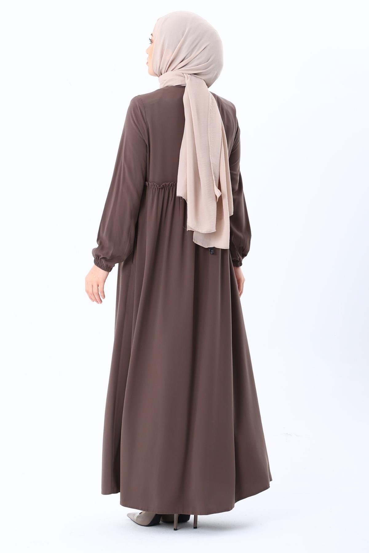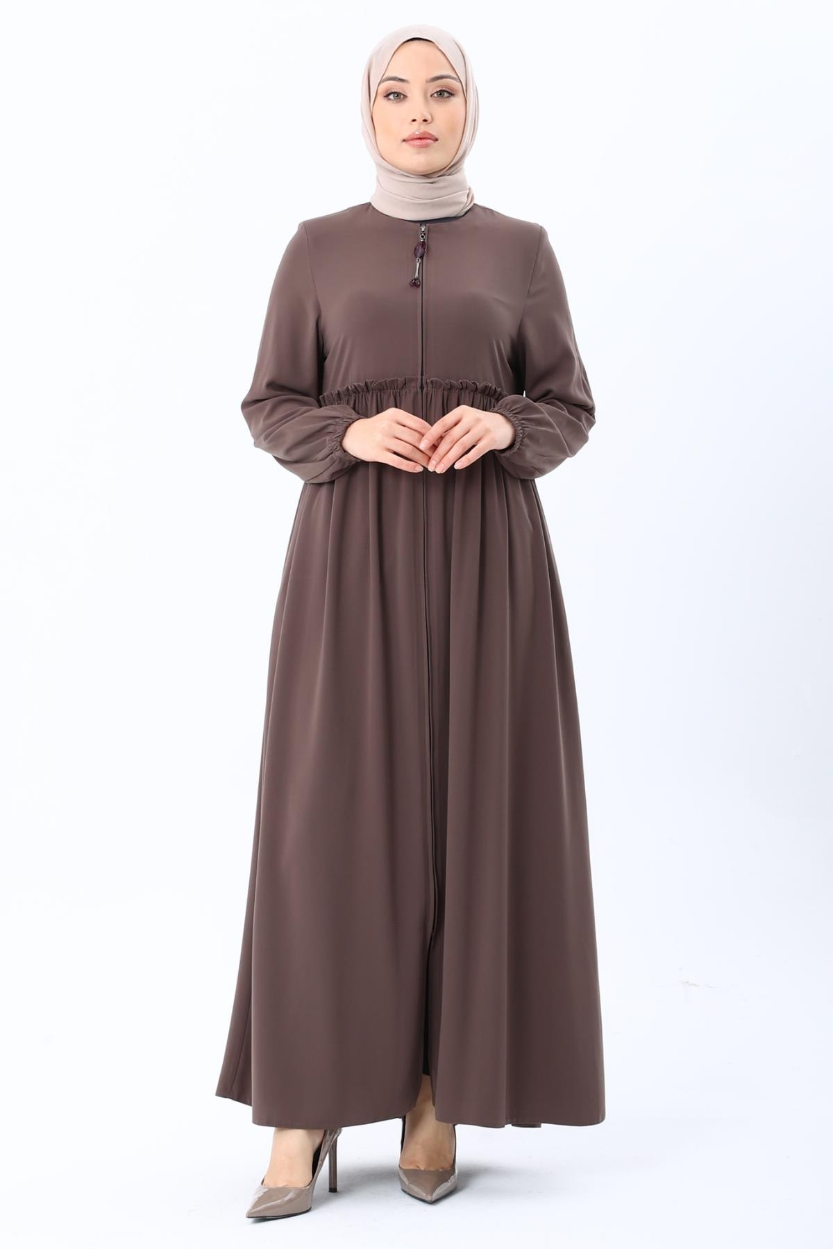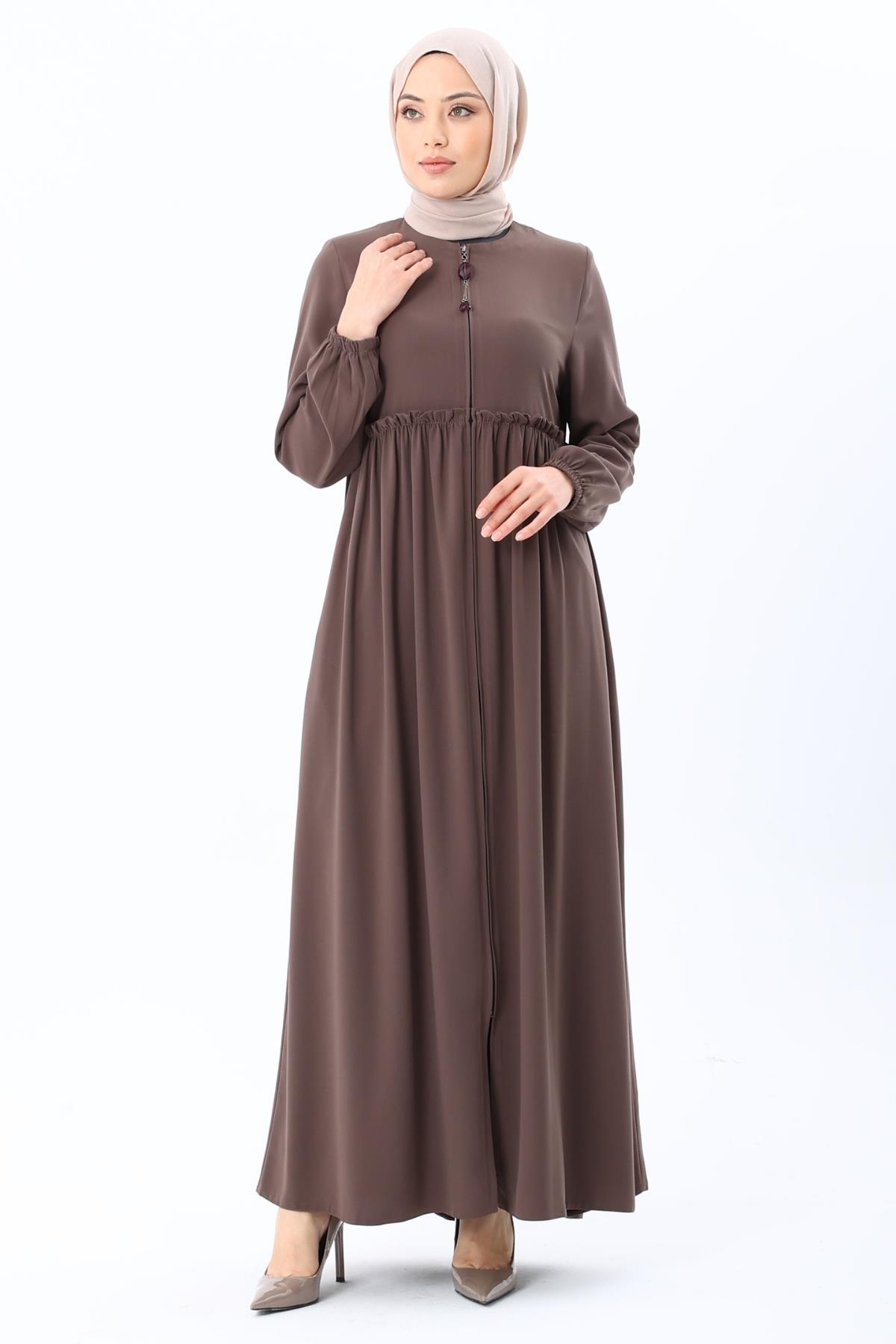 Erva Ferace Rabia krep kumaşıyla dört mevsim şıklık sunar. Tam kalıbı ve beli büzgülü tasarımıyla zarif bir siluet oluşturan bu model, lastikli manşetleriyle rahat bir kullanım sağlar.