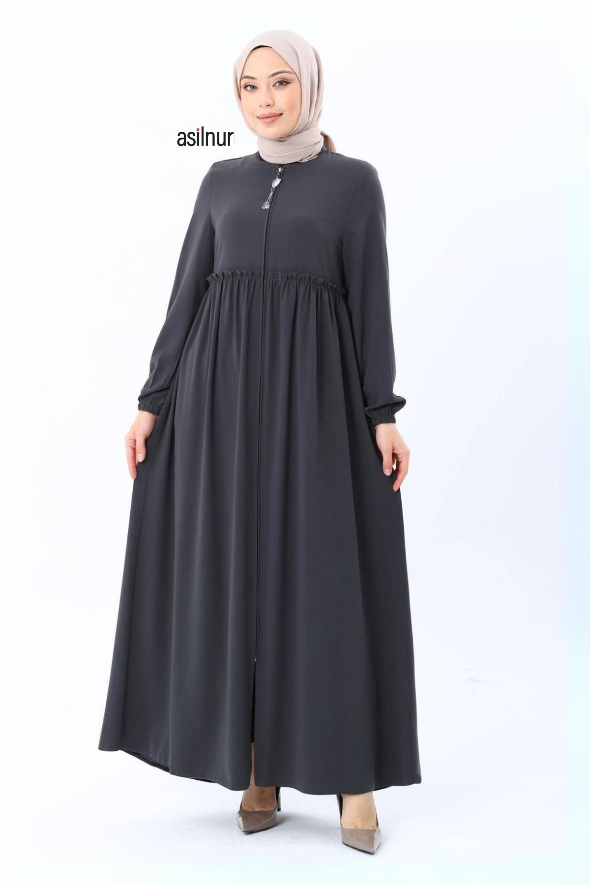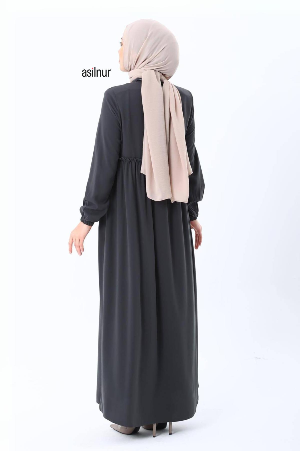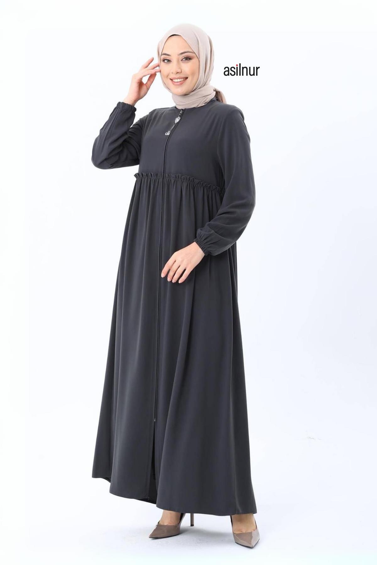 Erva Ferace Rabia krep kumaşıyla dört mevsim şıklık sunar. Tam kalıbı ve beli büzgülü tasarımıyla zarif bir siluet oluşturan bu model, lastikli manşetleriyle rahat bir kullanım sağlar.
