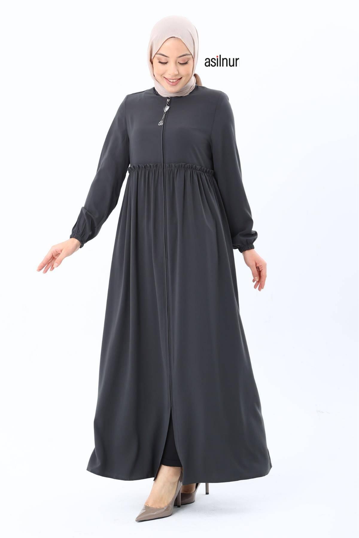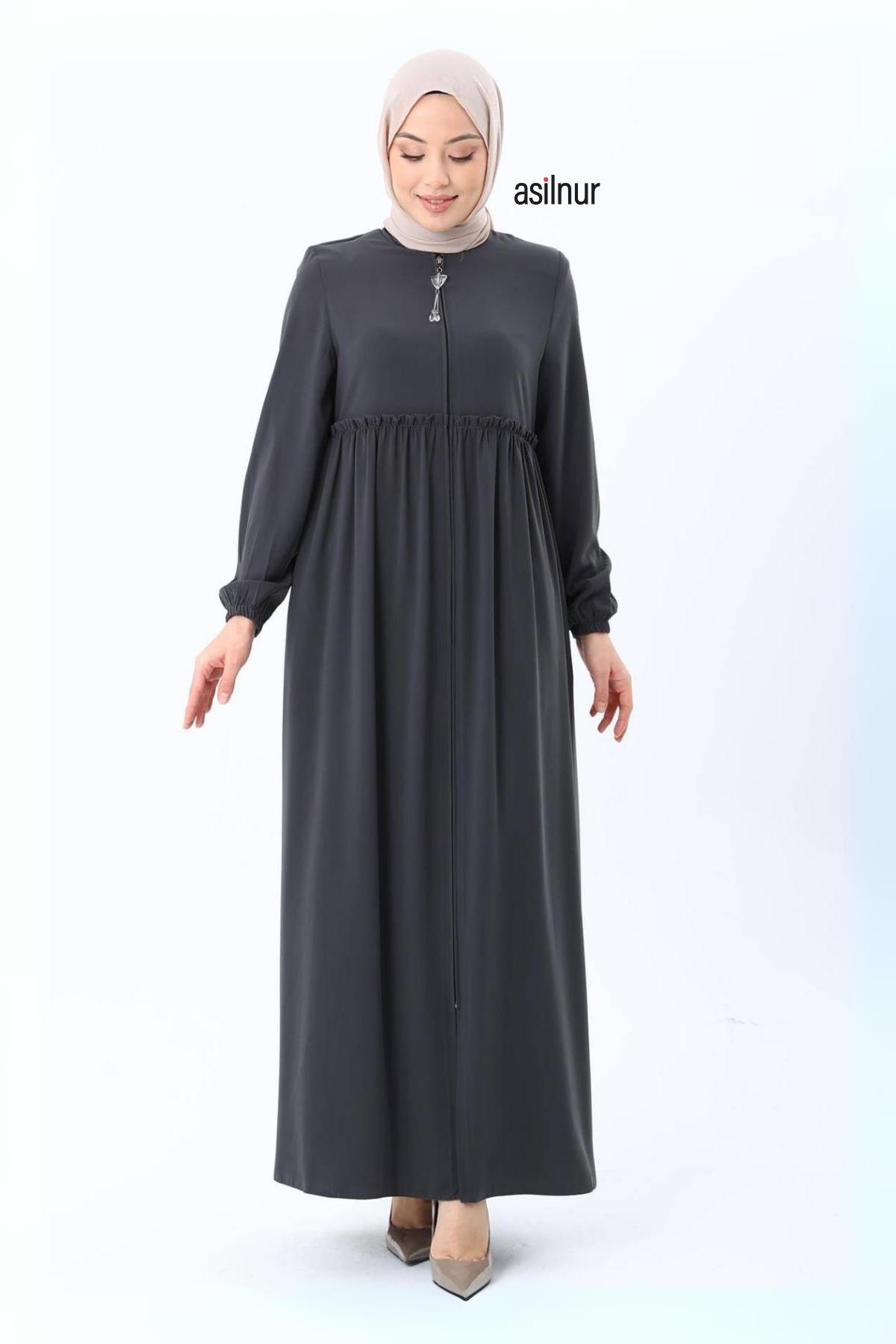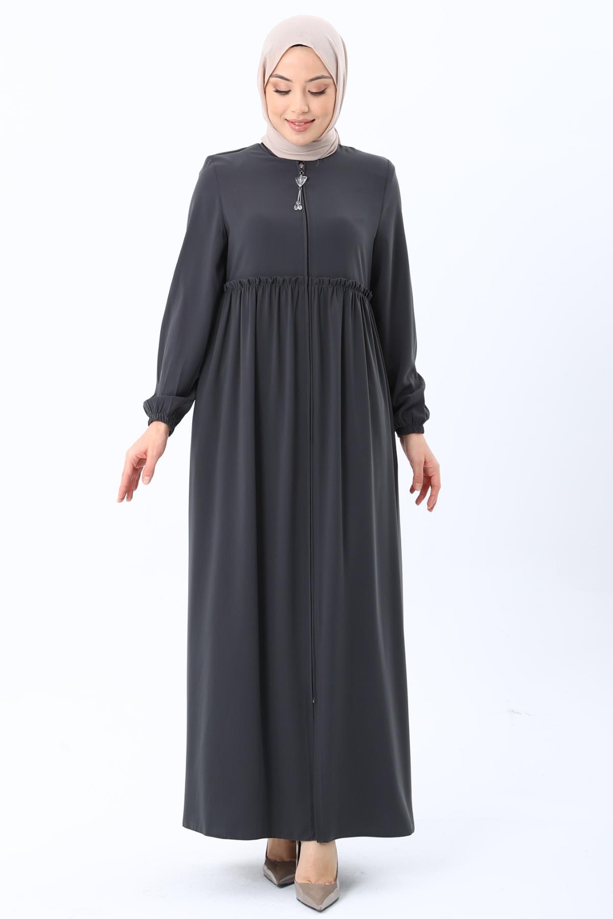 Erva Ferace Rabia krep kumaşıyla dört mevsim şıklık sunar. Tam kalıbı ve beli büzgülü tasarımıyla zarif bir siluet oluşturan bu model, lastikli manşetleriyle rahat bir kullanım sağlar.