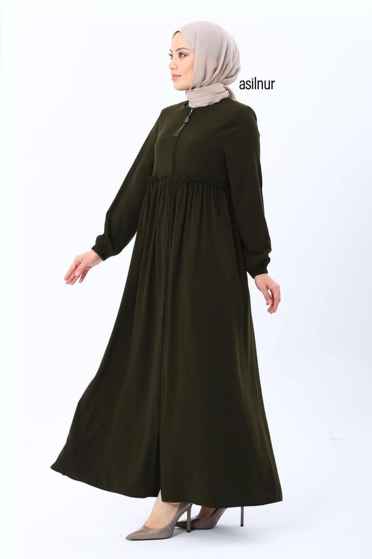 Erva Ferace Rabia krep kumaşıyla dört mevsim şıklık sunar. Tam kalıbı ve beli büzgülü tasarımıyla zarif bir siluet oluşturan bu model, lastikli manşetleriyle rahat bir kullanım sağlar.