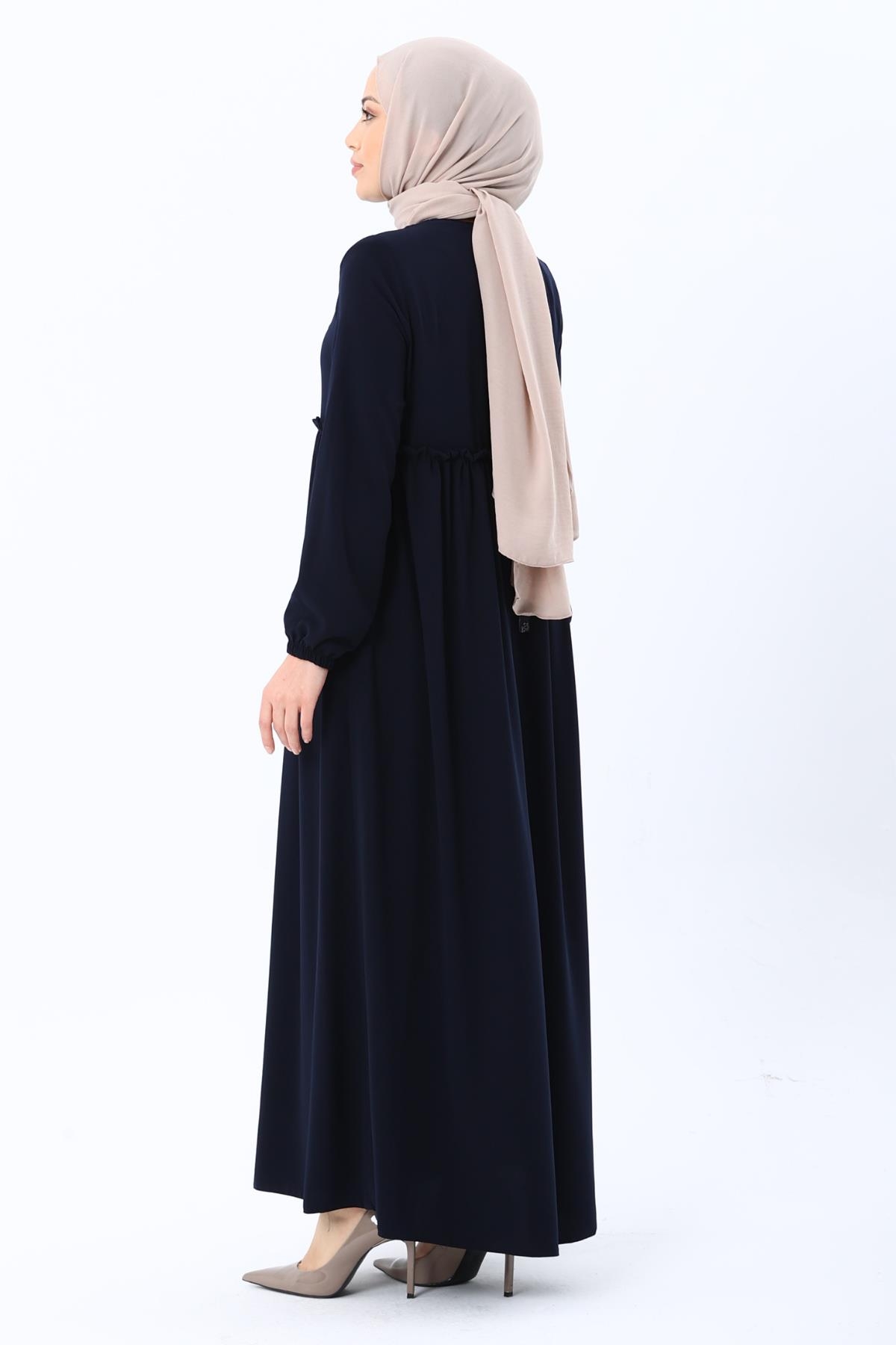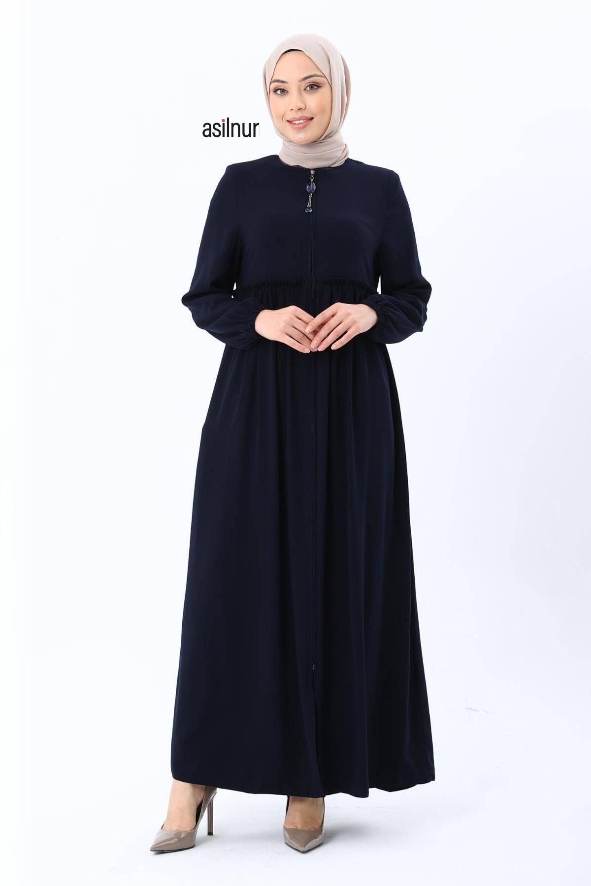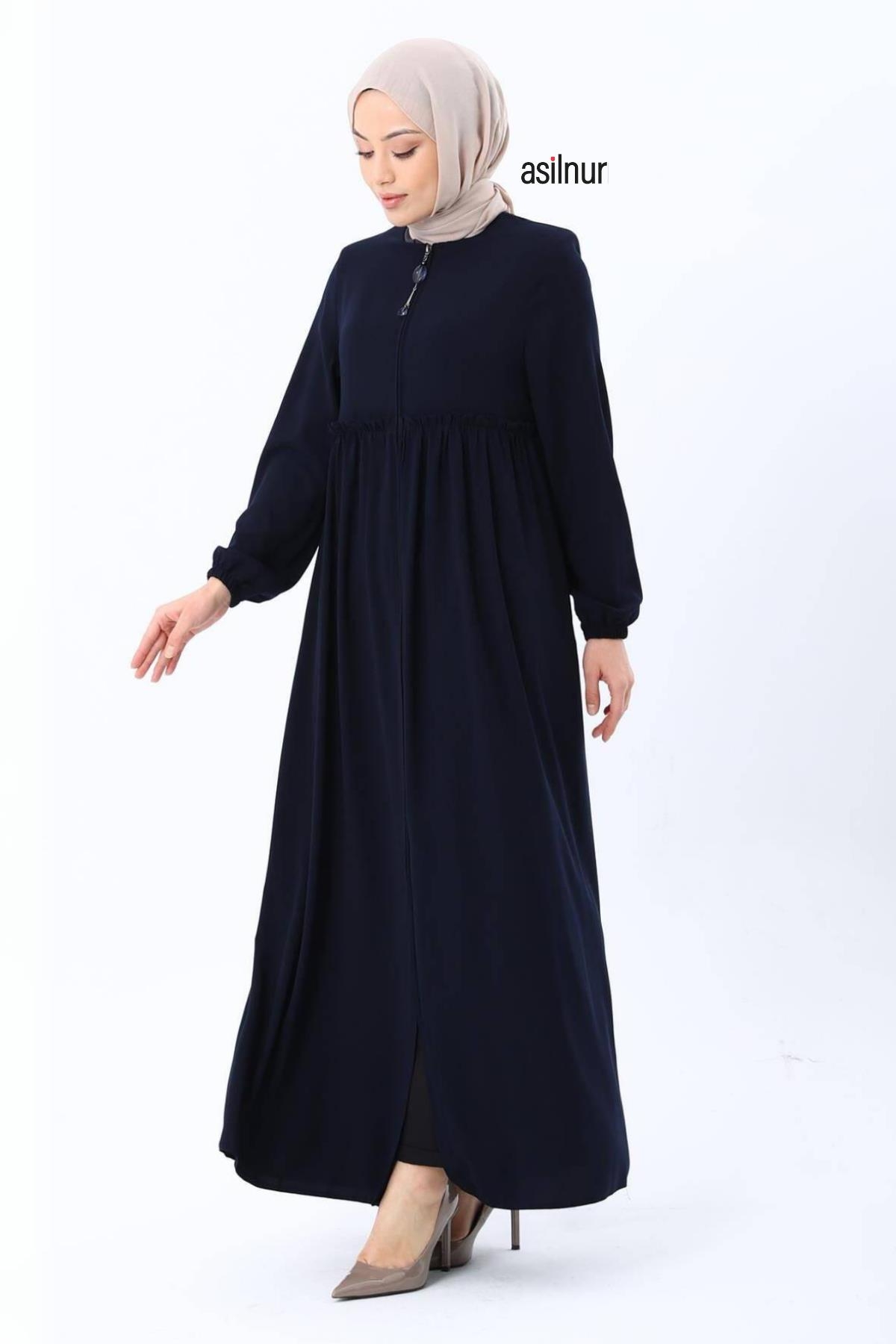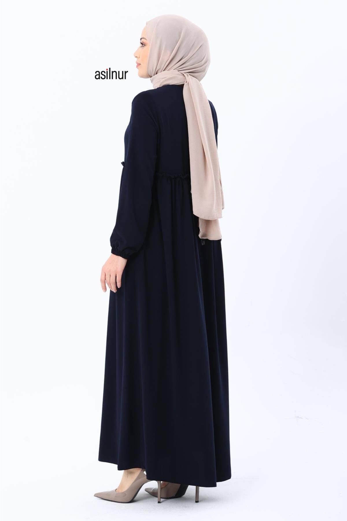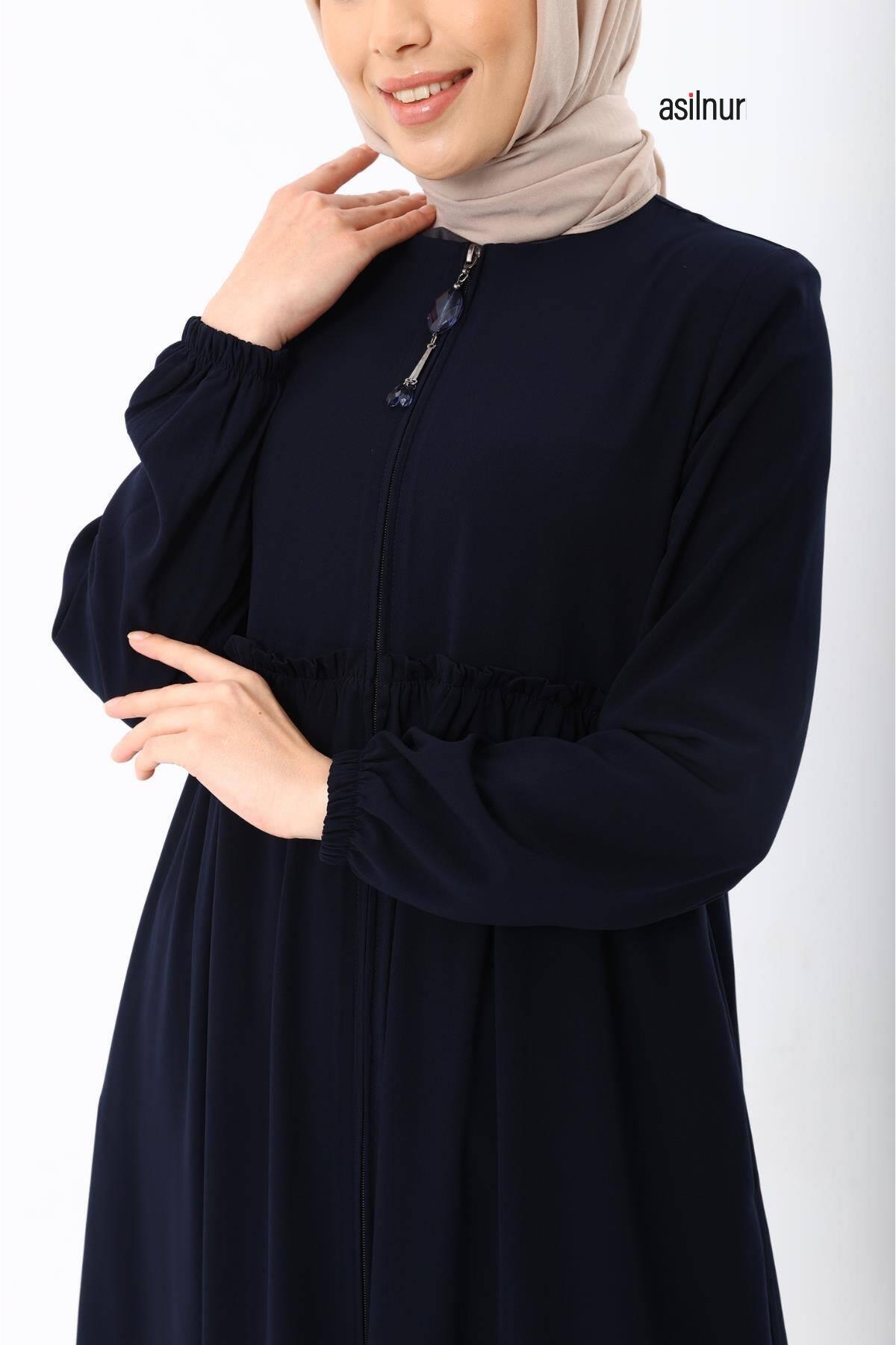Erva Ferace Rabia krep kumaşıyla dört mevsim şıklık sunar. Tam kalıbı ve beli büzgülü tasarımıyla zarif bir siluet oluşturan bu model, lastikli manşetleriyle rahat bir kullanım sağlar.