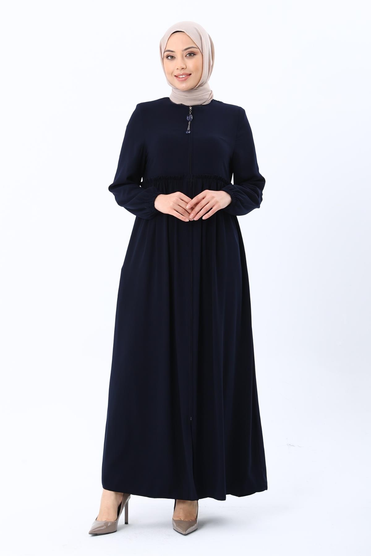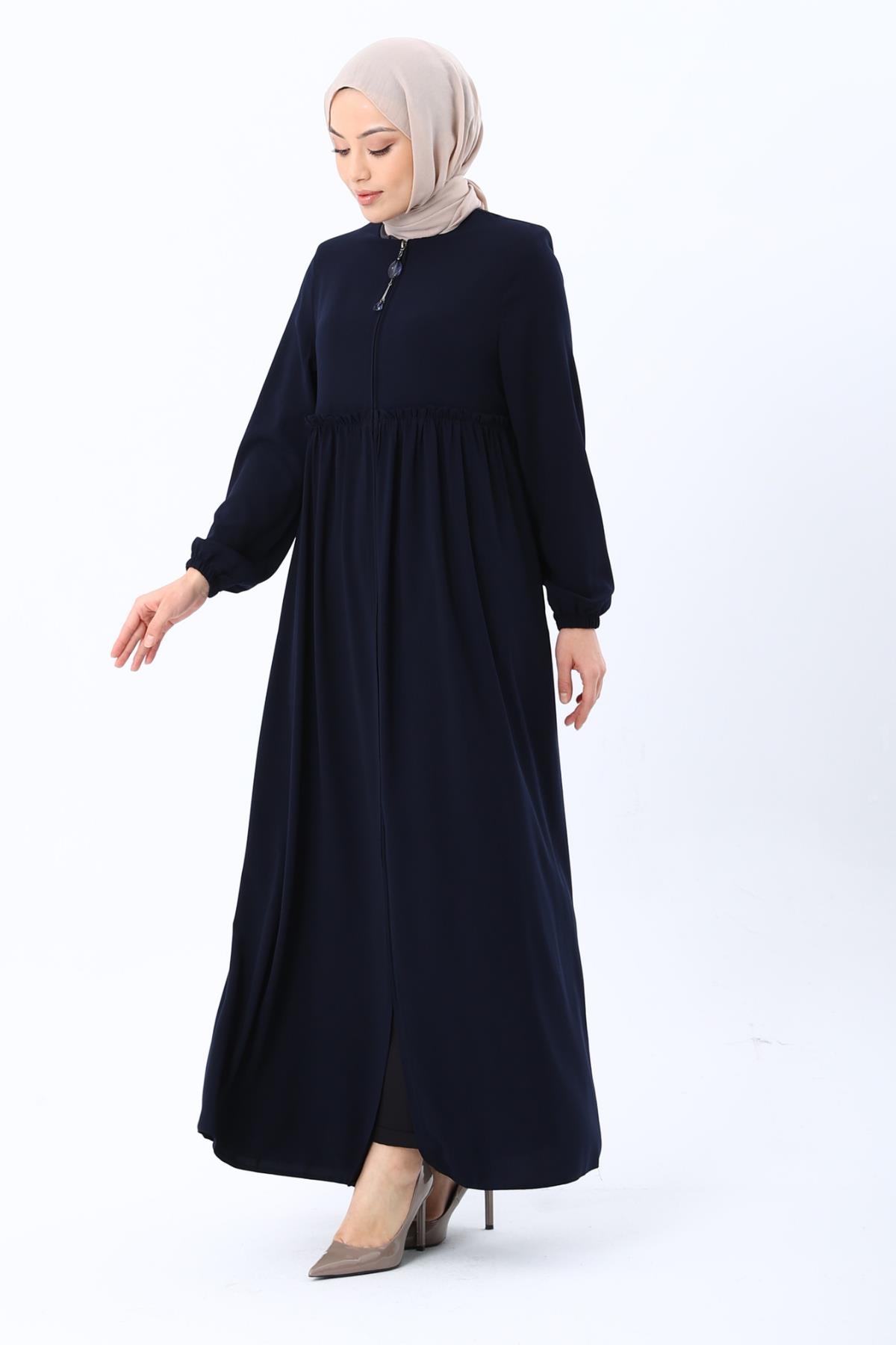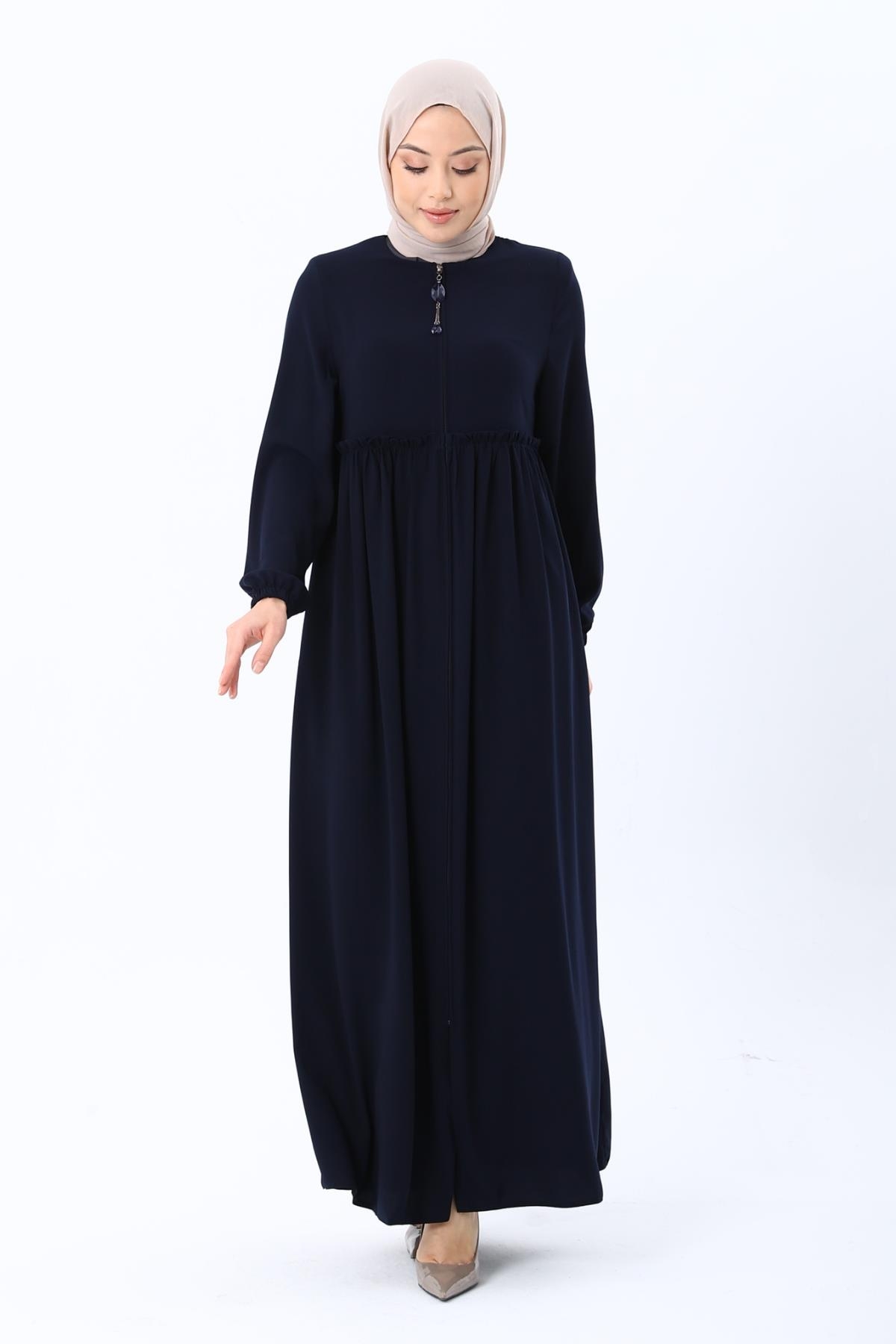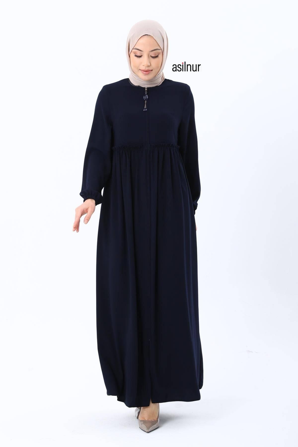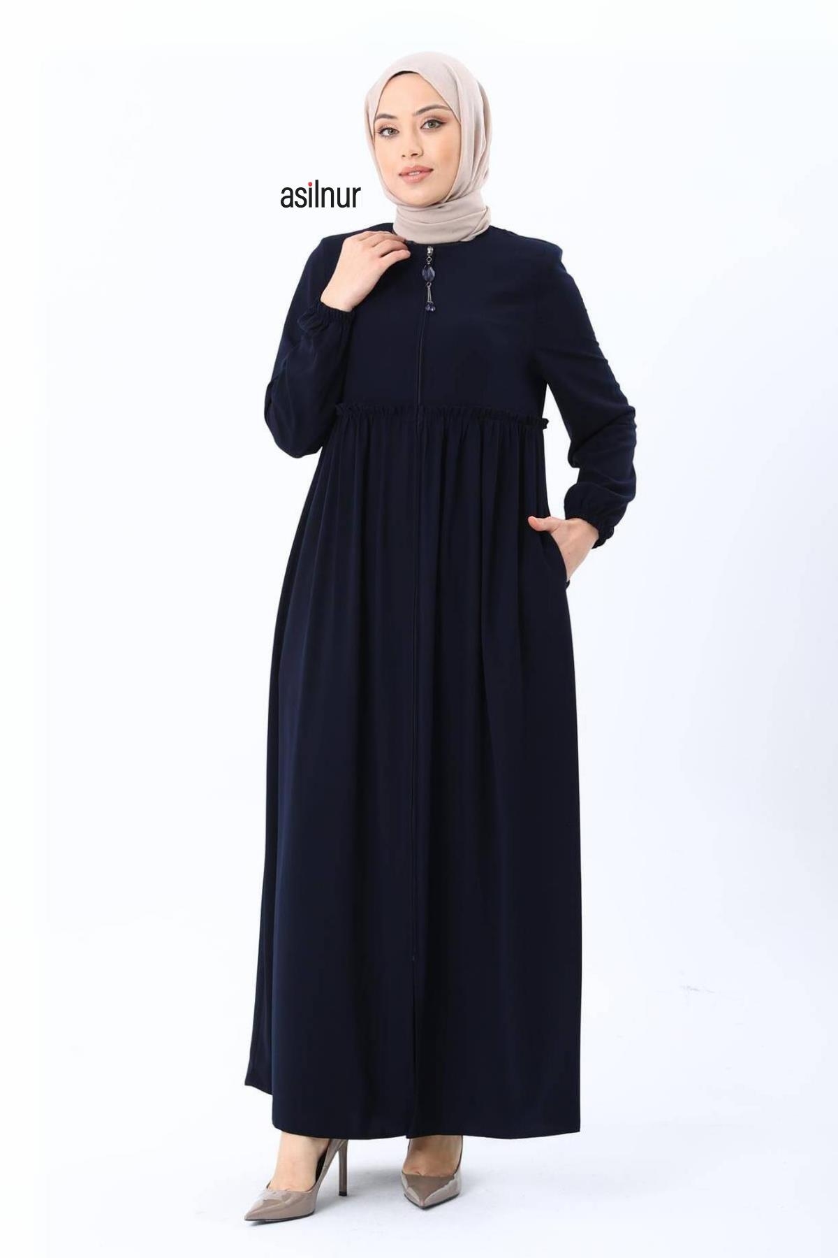 Erva Ferace Rabia krep kumaşıyla dört mevsim şıklık sunar. Tam kalıbı ve beli büzgülü tasarımıyla zarif bir siluet oluşturan bu model, lastikli manşetleriyle rahat bir kullanım sağlar.