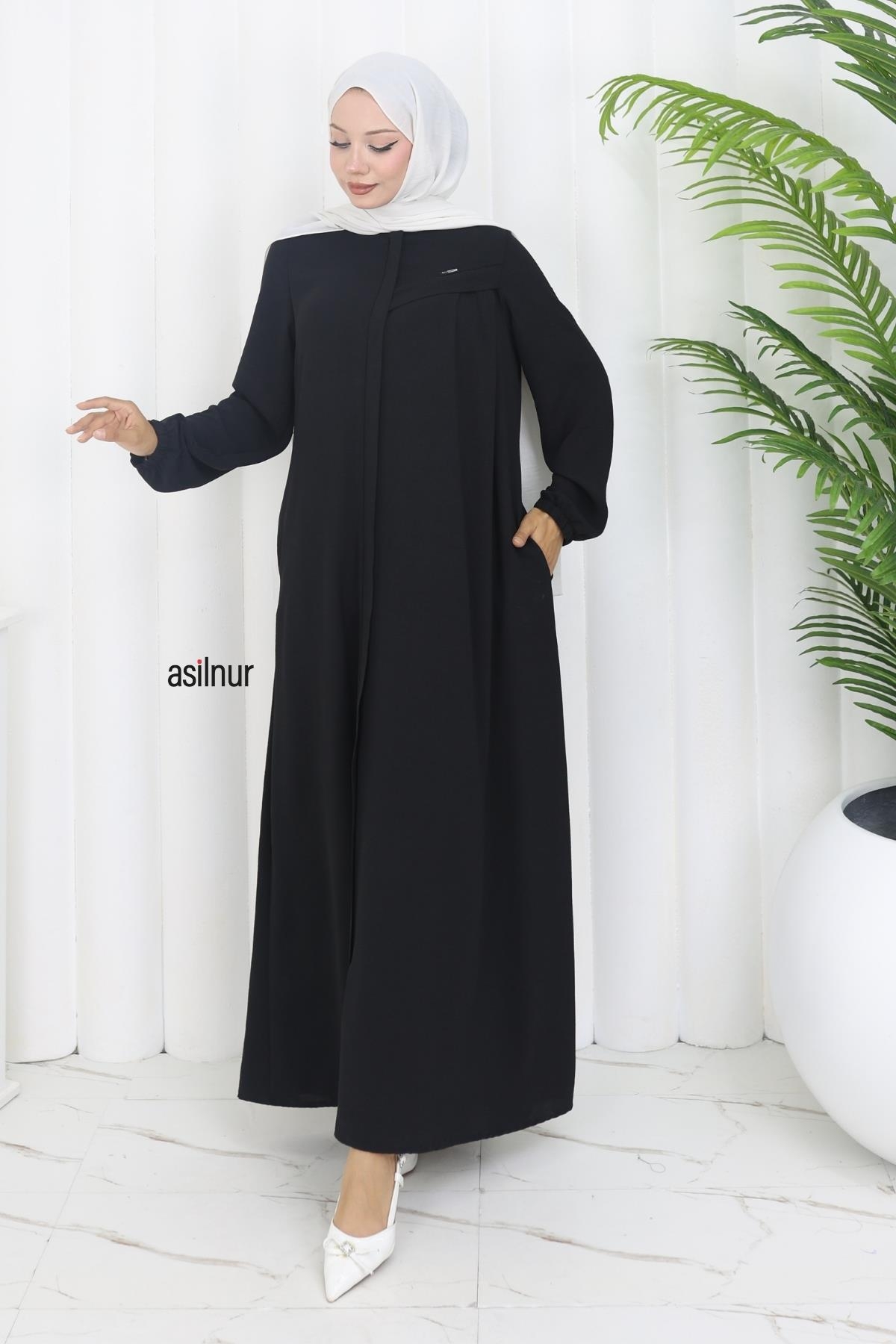 Hafif ve dökümlü ayrobin kumaştan üretilen Dila Ayrobin Biyeli Ferace, rahat kalıbı ve şık detaylarıyla öne çıkar. Lastikli kolları, fermuarlı önü ve cepli tasarımıyla günlük kullanıma uygundur. Biyeli dikişleriyle zarif bir görünüm sunar.