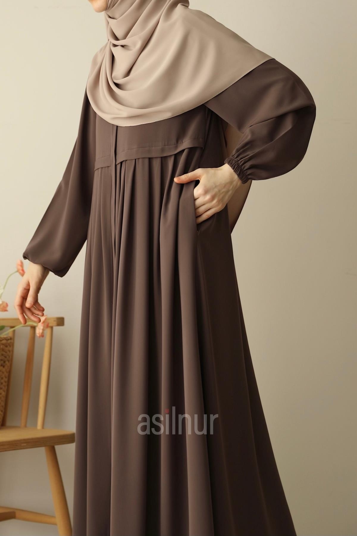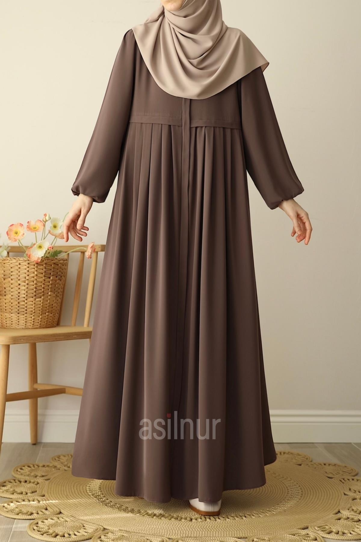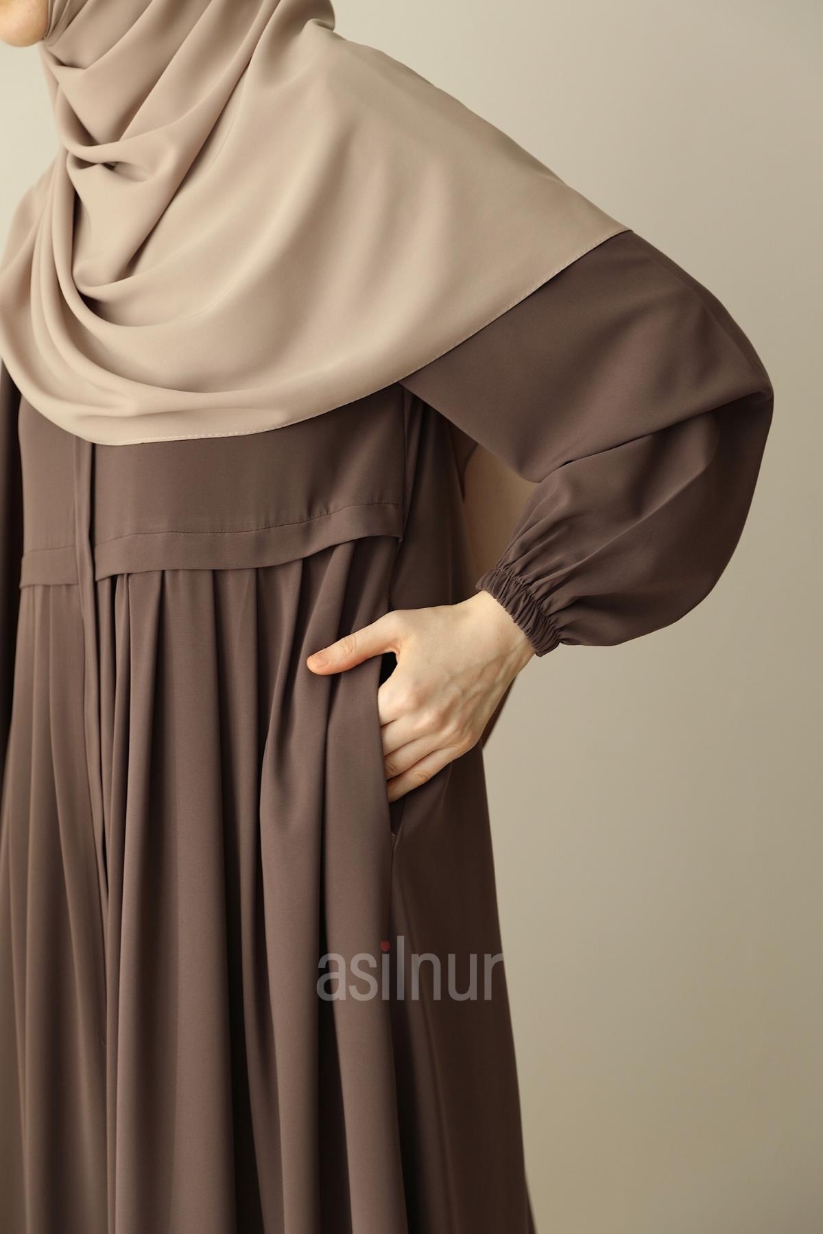 Hareket özgürlüğü ve şıklığı bir arada sunan Ebrar Piliseli Ferace, zarif pilise detaylarıyla ve kaliteli Medine İpeği kumaşıyla dört mevsim kullanım için idealdir. Rahat kalıbı gün boyu konfor sağlar. Dökümlü ve hafiftir. Kullanışlılığı artıran cepli tasarımı, fermuarlı yapısı, bisiklet yaka detayı ve lastikli kolları ile bu piliseli ferace, hem günlük kullanımda hem de özel anlarda konforlu şıklığınızı tamamlayacak.