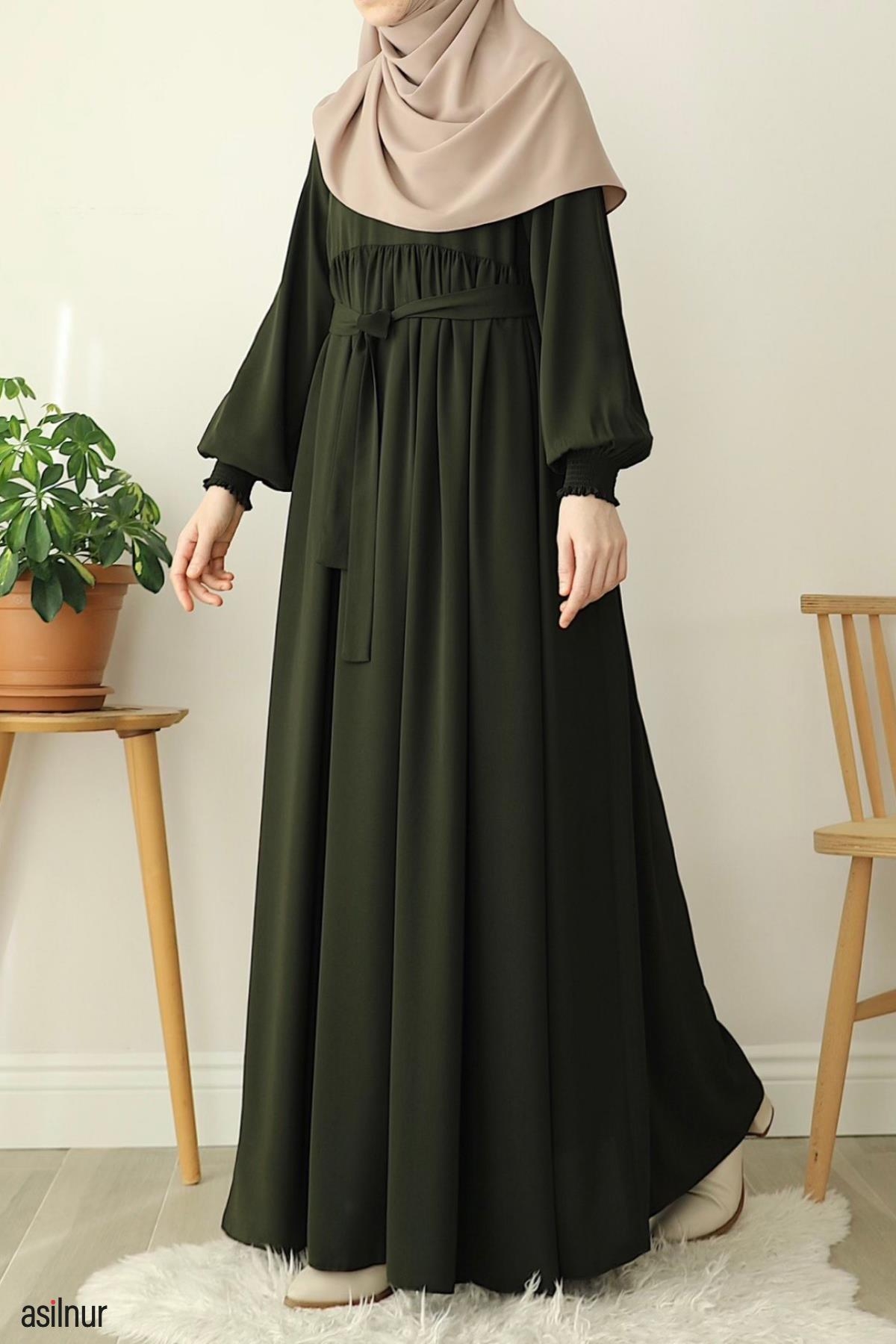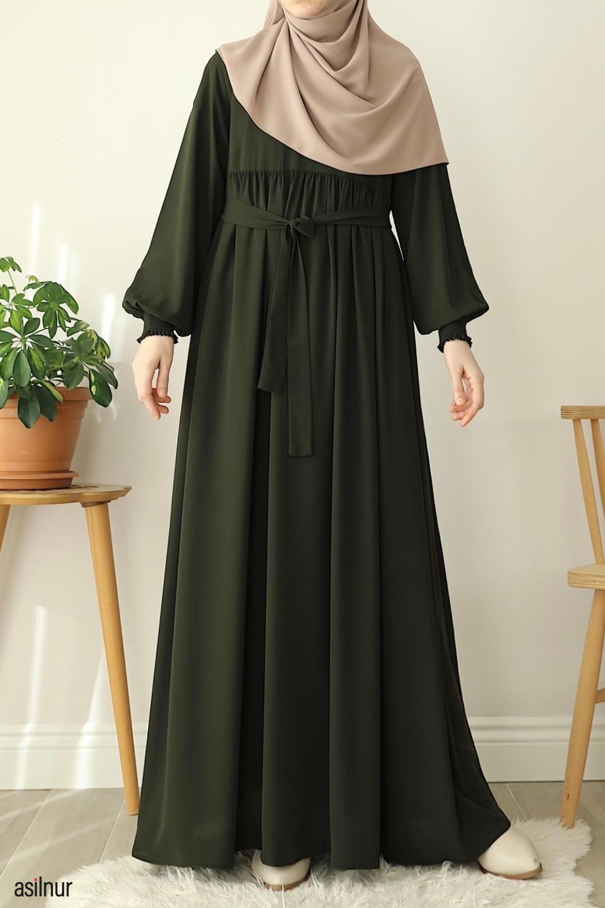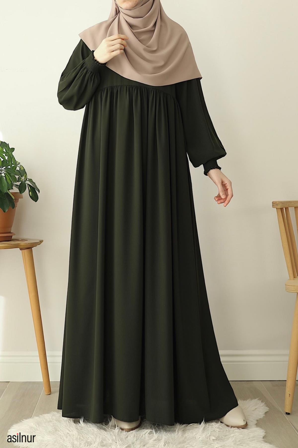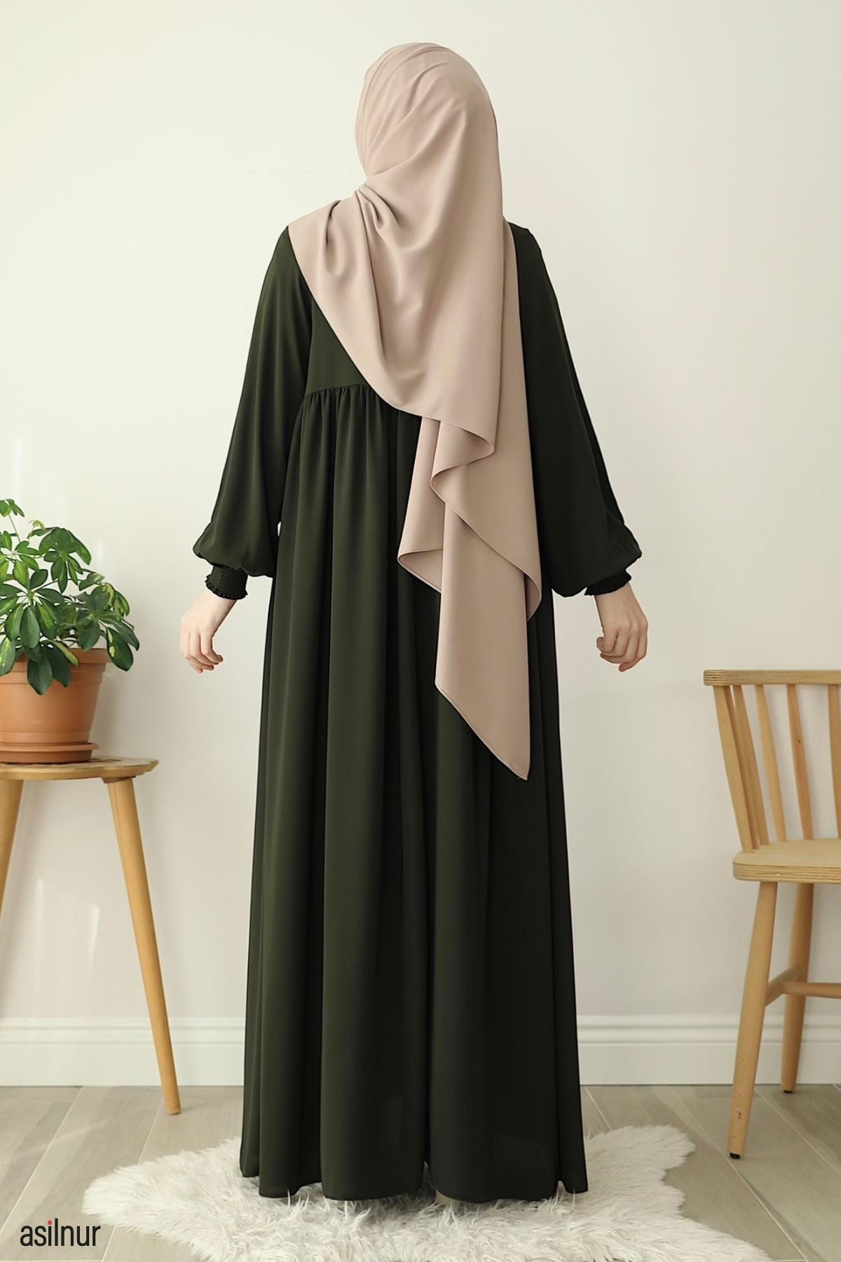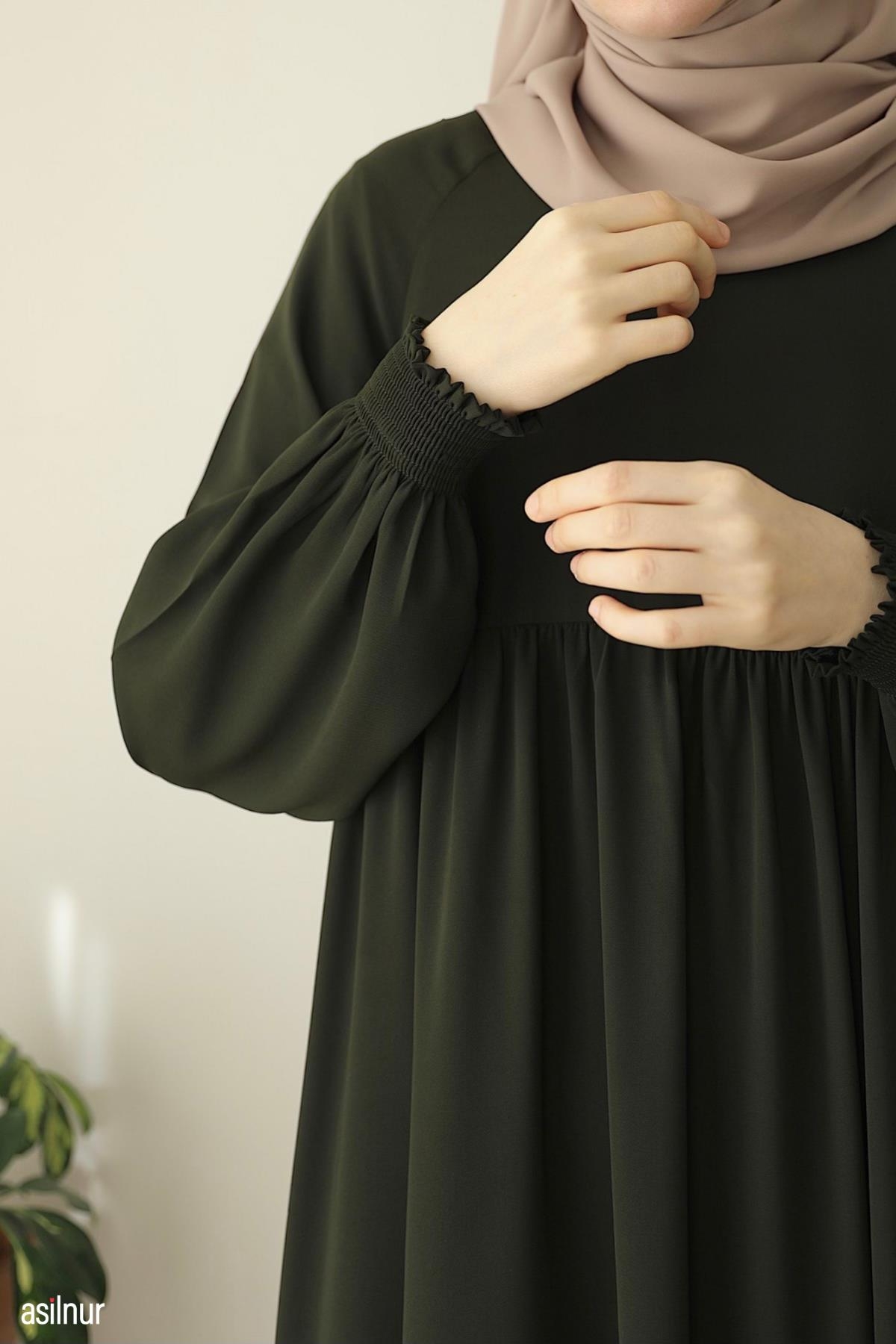 Dört mevsim kullanılabilen, orta kalınlıktaki Medine ipeği kumaştan üretilen bu rahat kalıp elbise, bisiklet yaka ve lastikli kollarıyla gün boyu rahatlık sunar. Ensede küçük fermuar detayı ve kullanışlı cepleriyle şıklığı pratiklikle buluşturur.