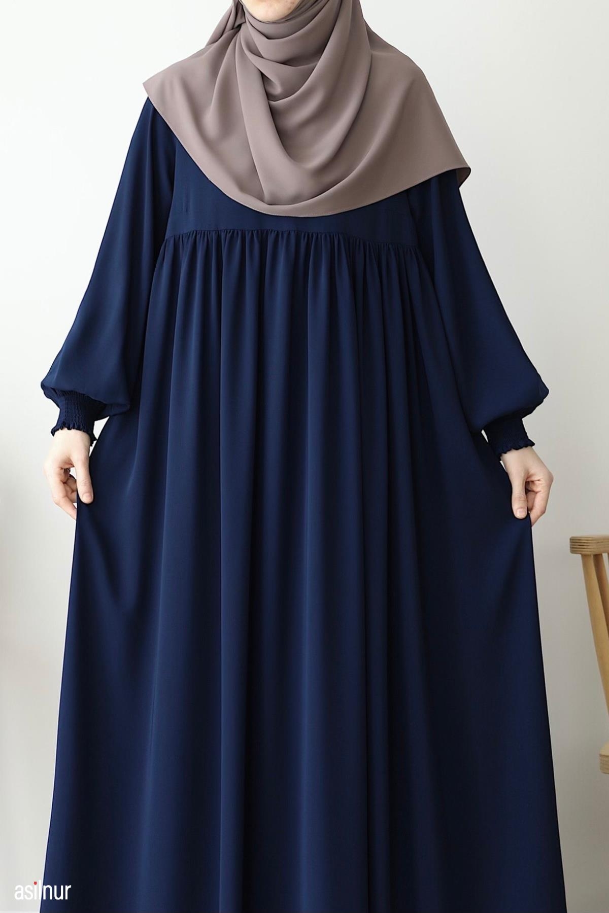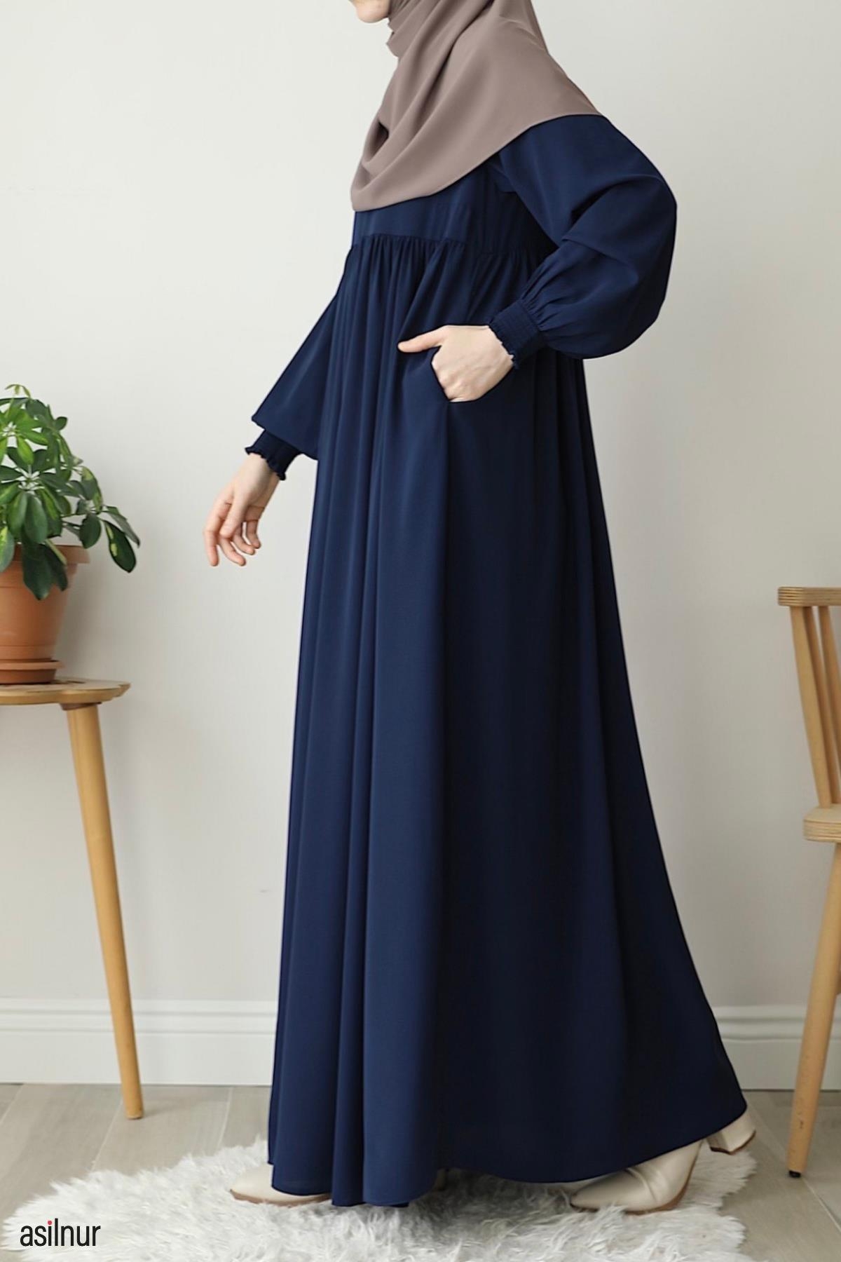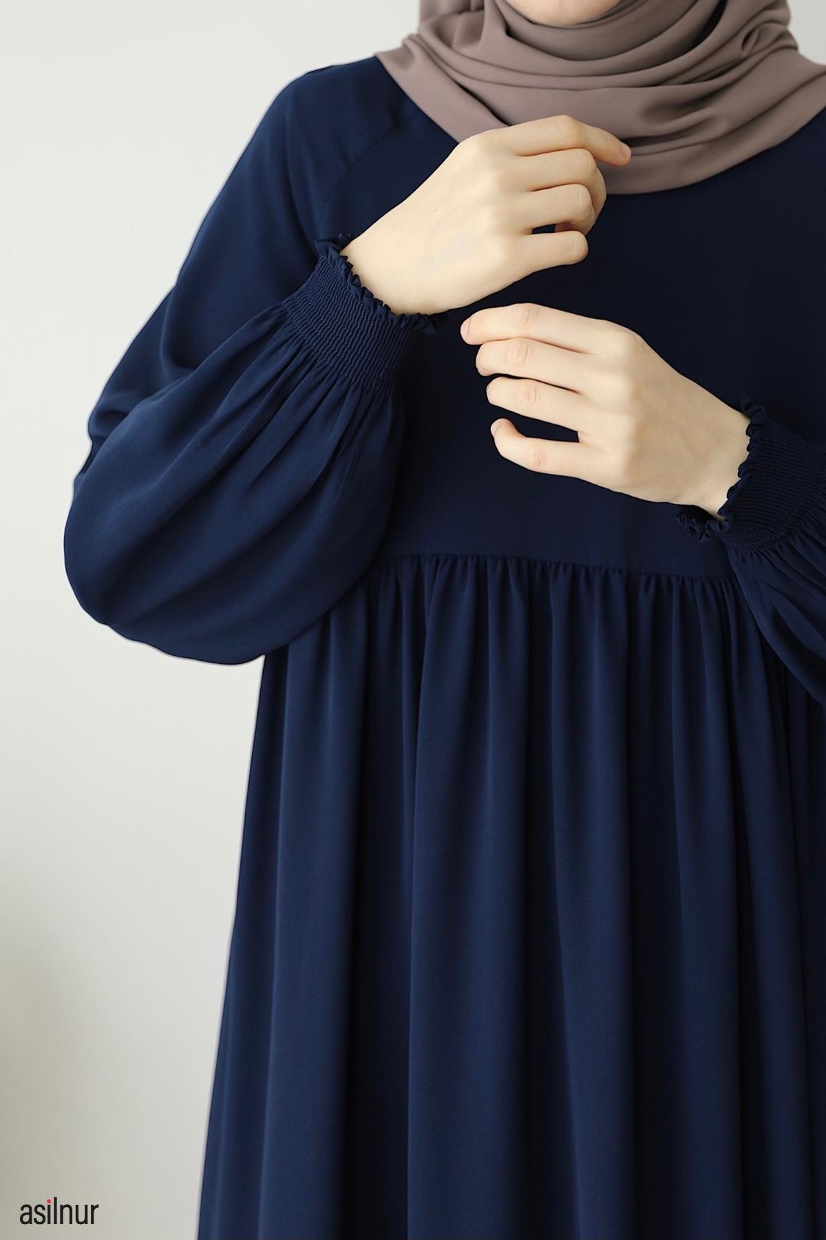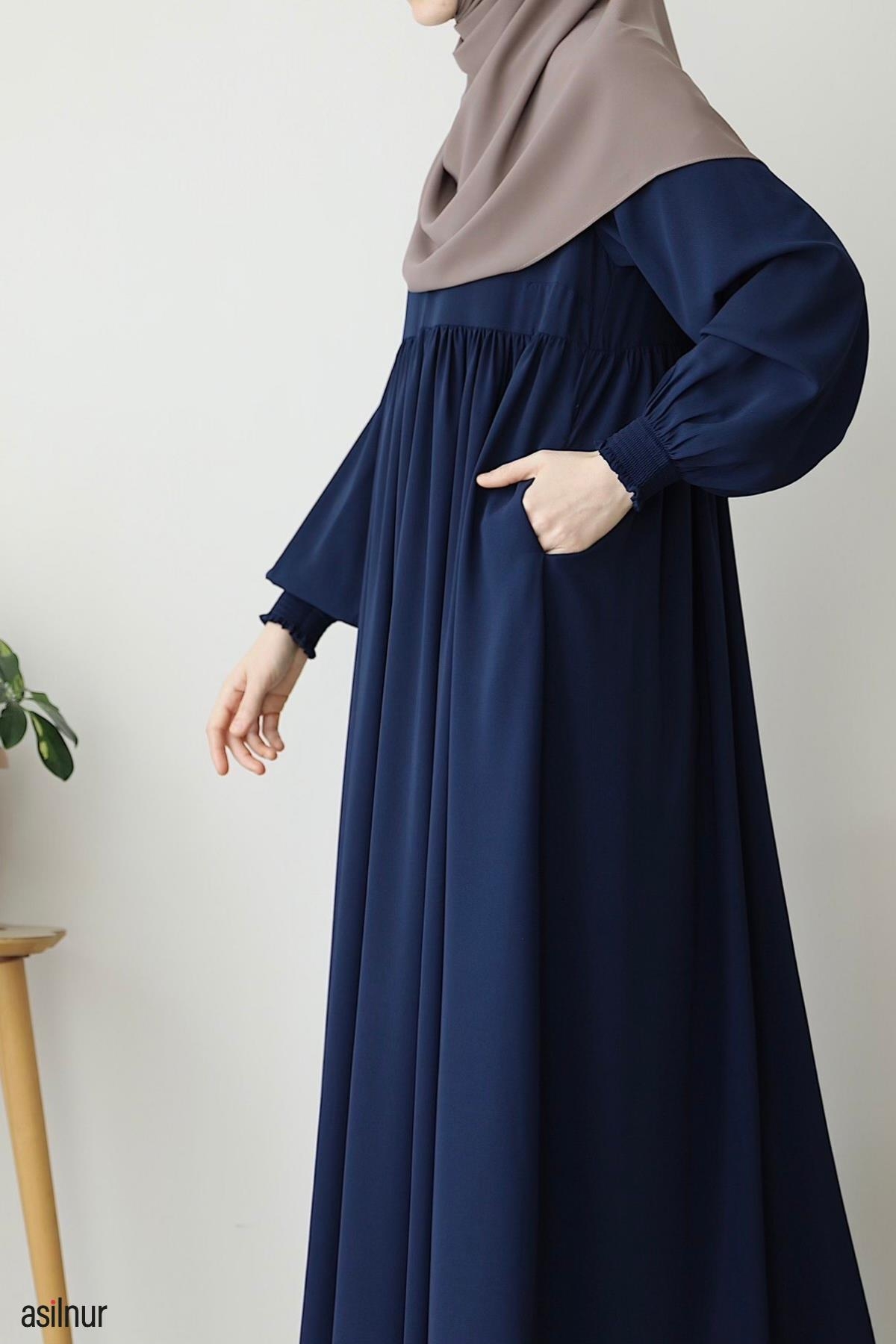 Dört mevsim kullanılabilen, orta kalınlıktaki Medine ipeği kumaştan üretilen bu rahat kalıp elbise, bisiklet yaka ve lastikli kollarıyla gün boyu rahatlık sunar. Ensede küçük fermuar detayı ve kullanışlı cepleriyle şıklığı pratiklikle buluşturur.