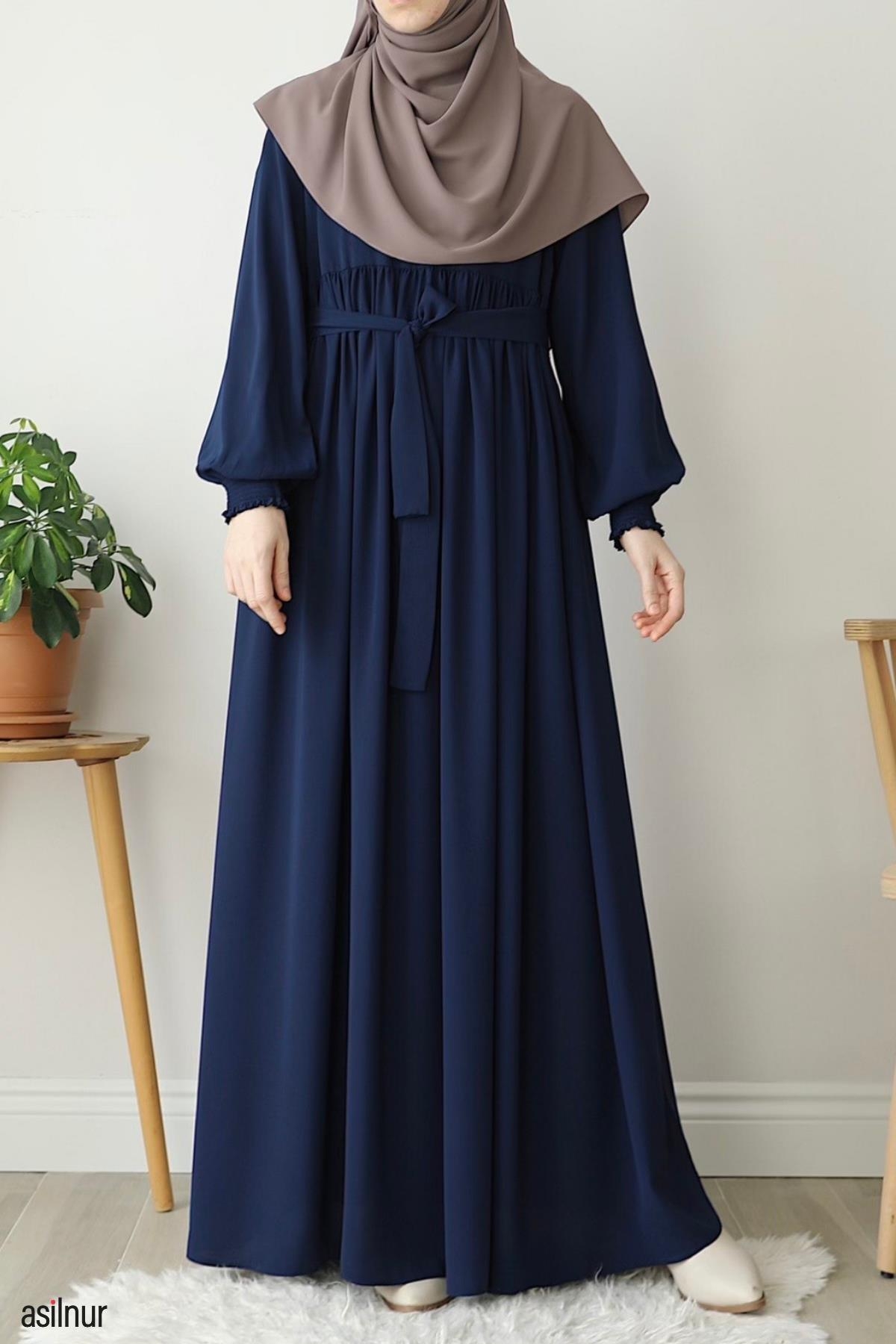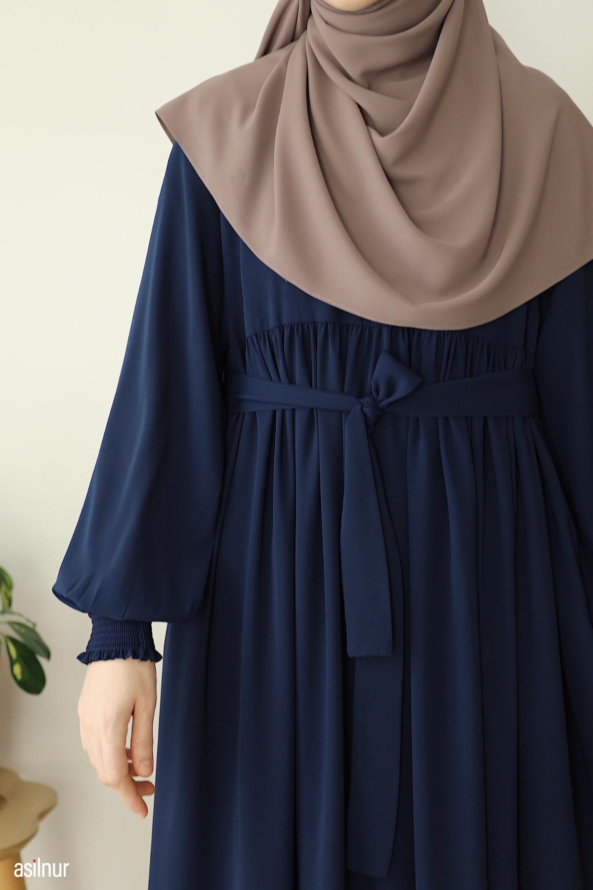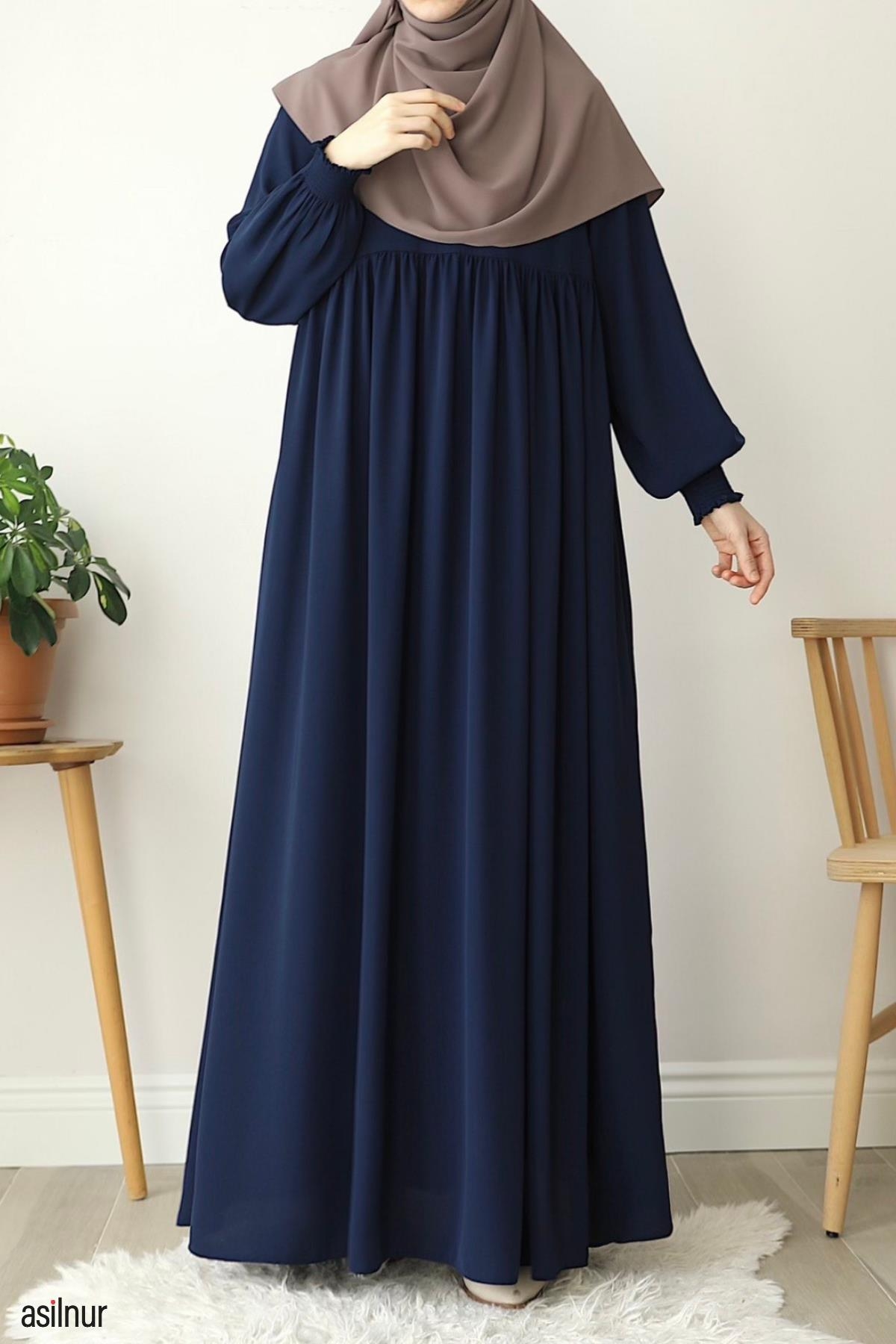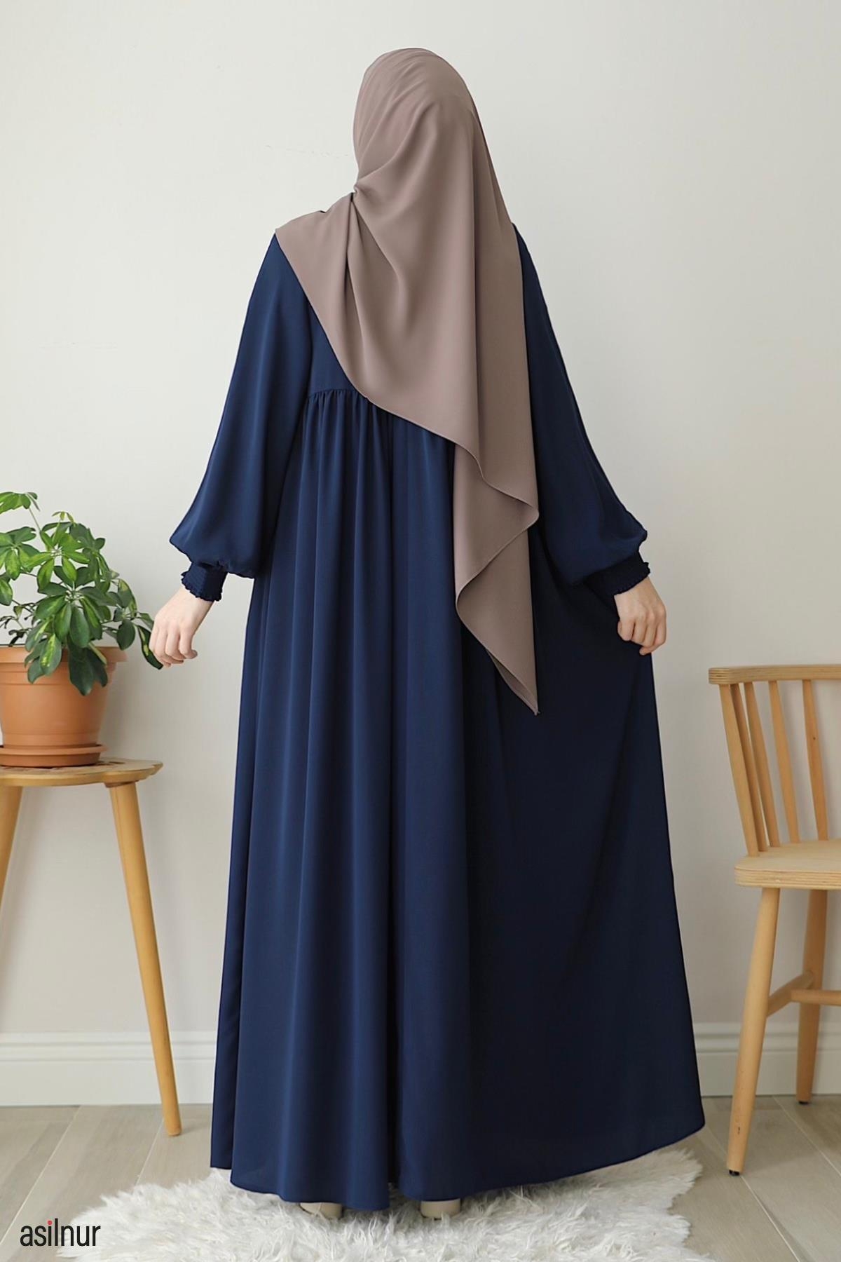 Dört mevsim kullanılabilen, orta kalınlıktaki Medine ipeği kumaştan üretilen bu rahat kalıp elbise, bisiklet yaka ve lastikli kollarıyla gün boyu rahatlık sunar. Ensede küçük fermuar detayı ve kullanışlı cepleriyle şıklığı pratiklikle buluşturur.