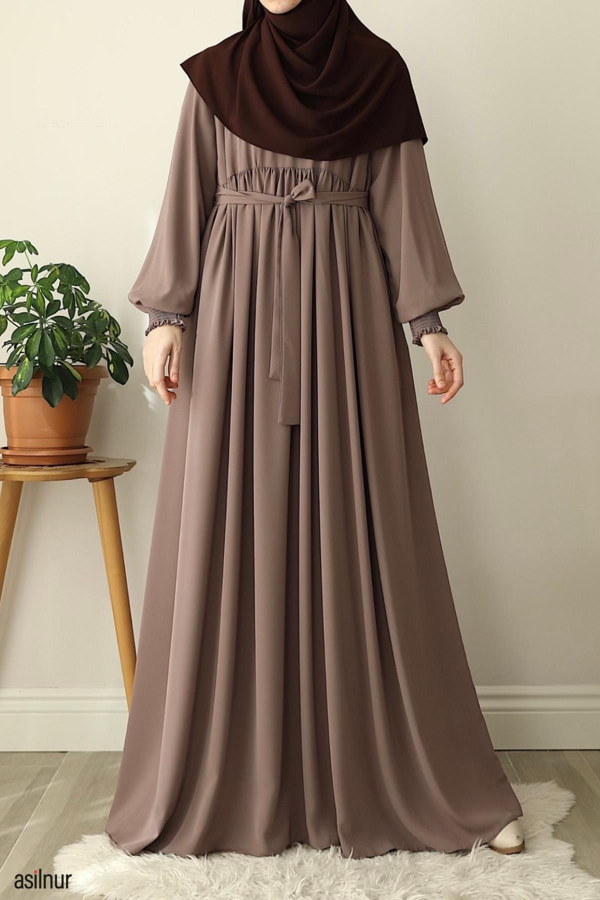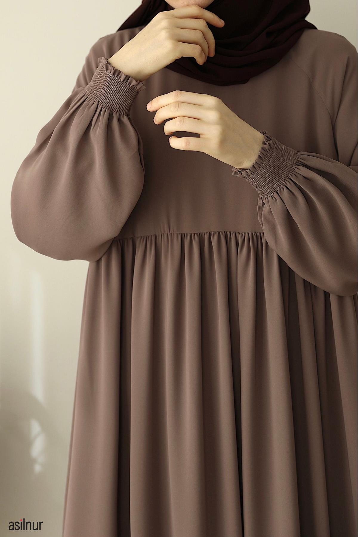 Dört mevsim kullanılabilen, orta kalınlıktaki Medine ipeği kumaştan üretilen bu rahat kalıp elbise, bisiklet yaka ve lastikli kollarıyla gün boyu rahatlık sunar. Ensede küçük fermuar detayı ve kullanışlı cepleriyle şıklığı pratiklikle buluşturur.
