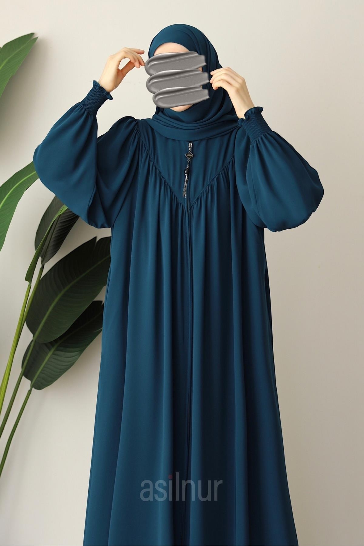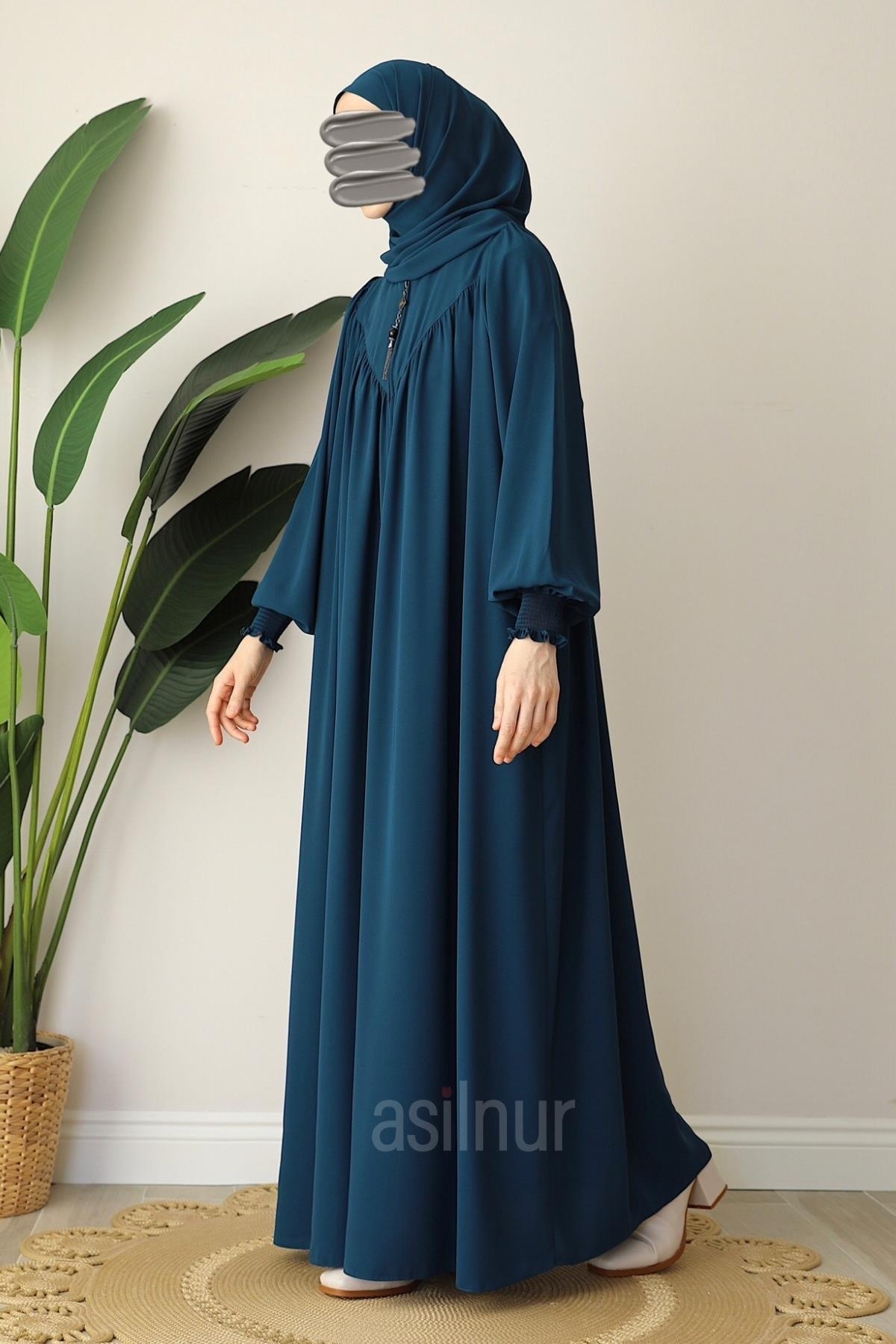 Elif Ferace Şallı Takım, 1. sınıf Mısır Medine ipeğinden üretilmiştir. Kol kısmında yer alan gipe lastik detayı sayesinde hem rahat kullanım sunar hem de modern bir görünüm kazandırır. Fermuarlı yapısıyla pratik giyilip çıkarılabilir. Yan cepleriyle kullanışlıdır. Takımın içinde yer alan şal, feraceyle tam uyumlu olup hediye olarak gönderilmektedir.