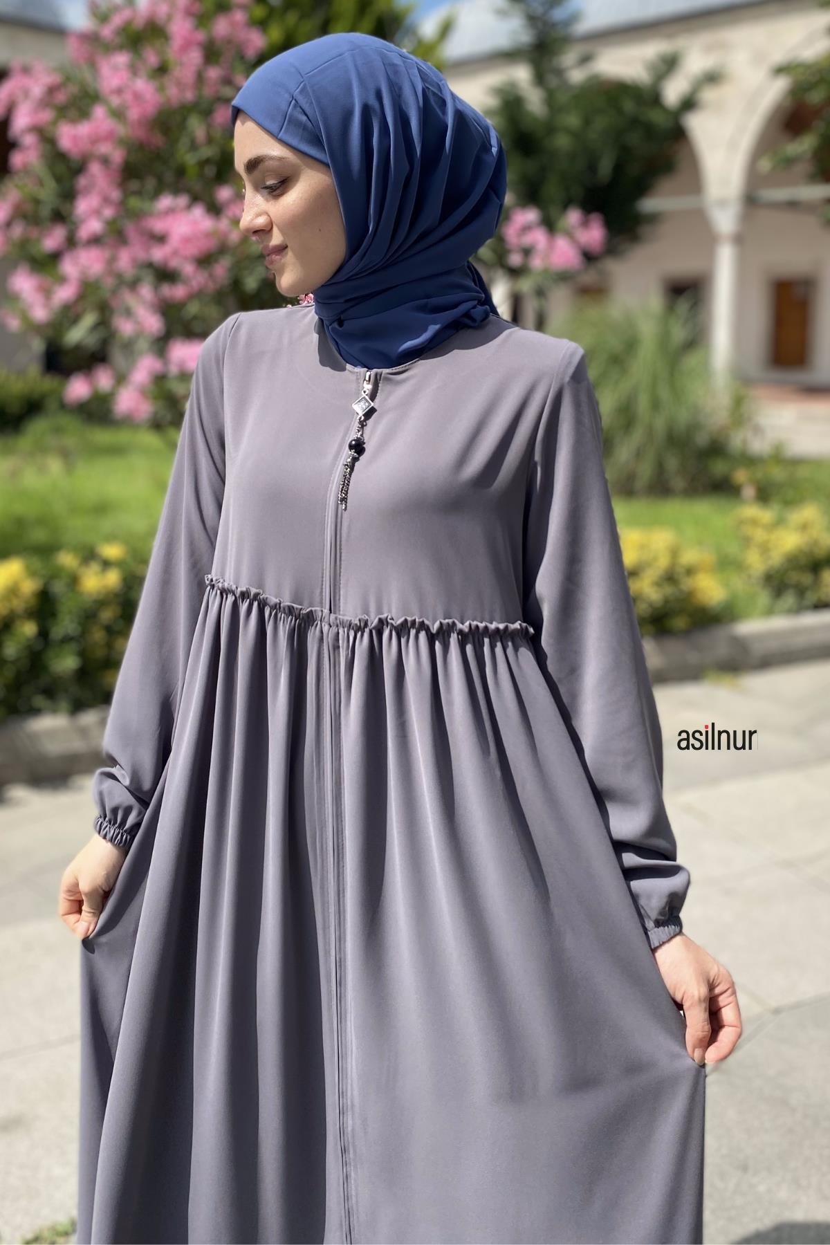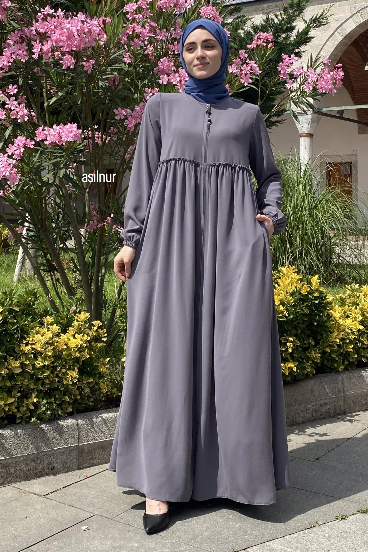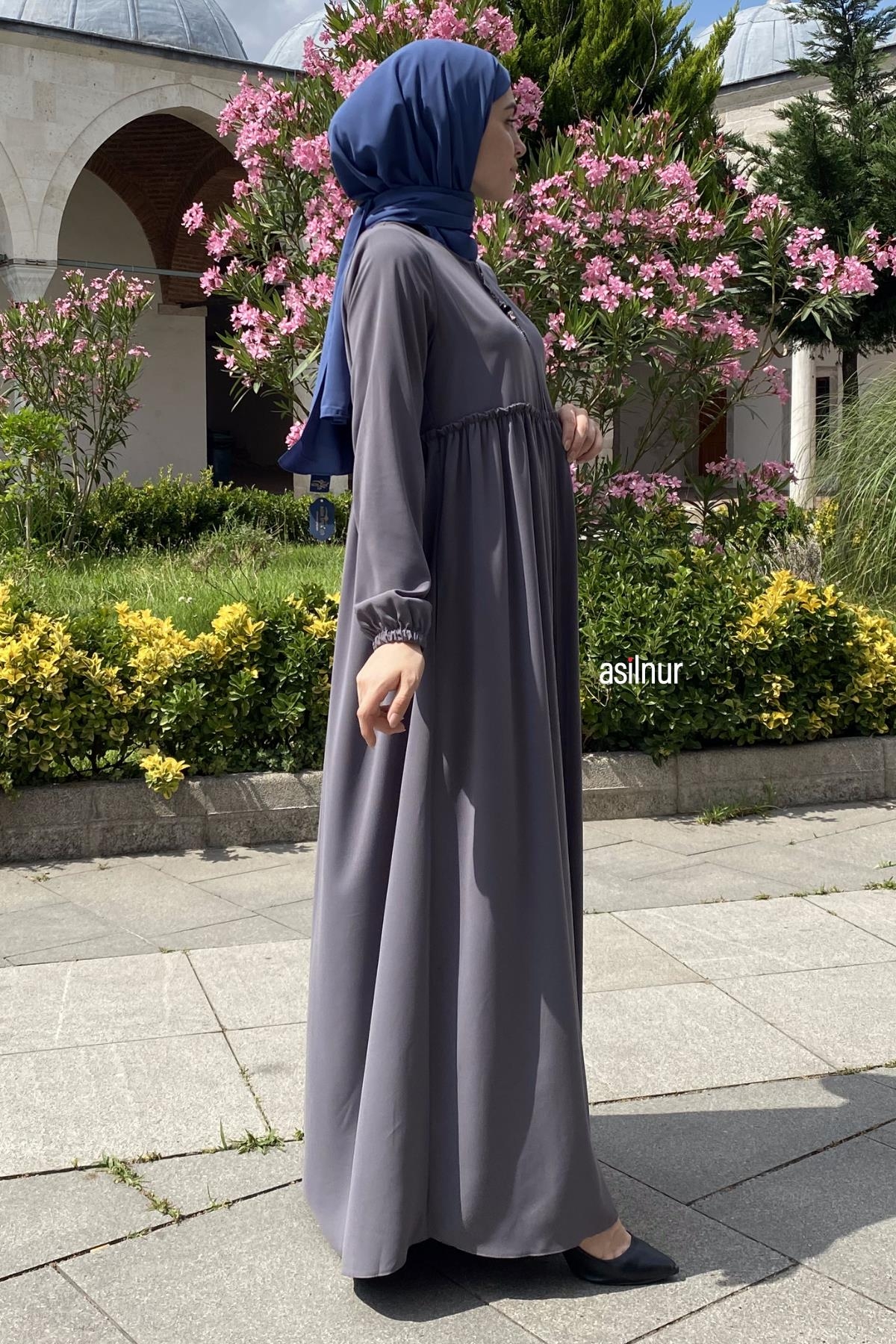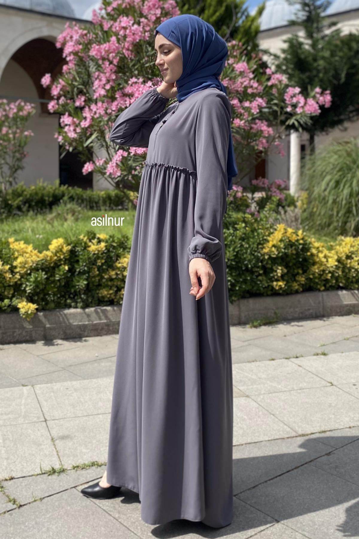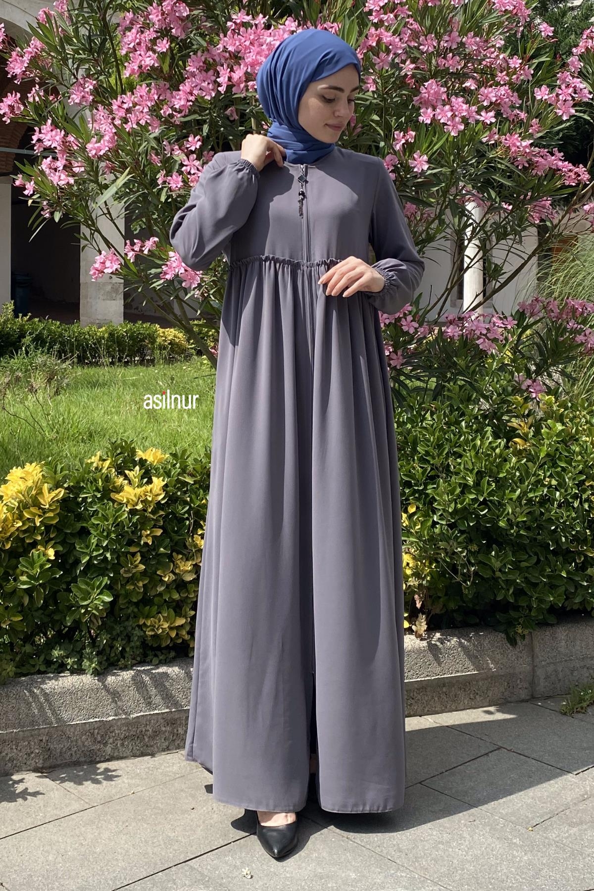 Erva Ferace Rabia krep kumaşıyla dört mevsim şıklık sunar. Tam kalıbı ve beli büzgülü tasarımıyla zarif bir siluet oluşturan bu model, lastikli manşetleriyle rahat bir kullanım sağlar.