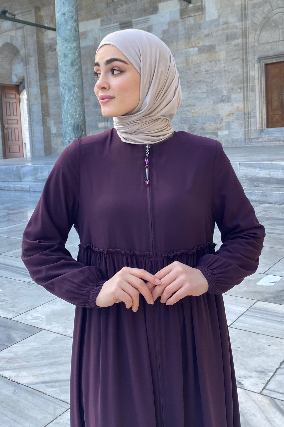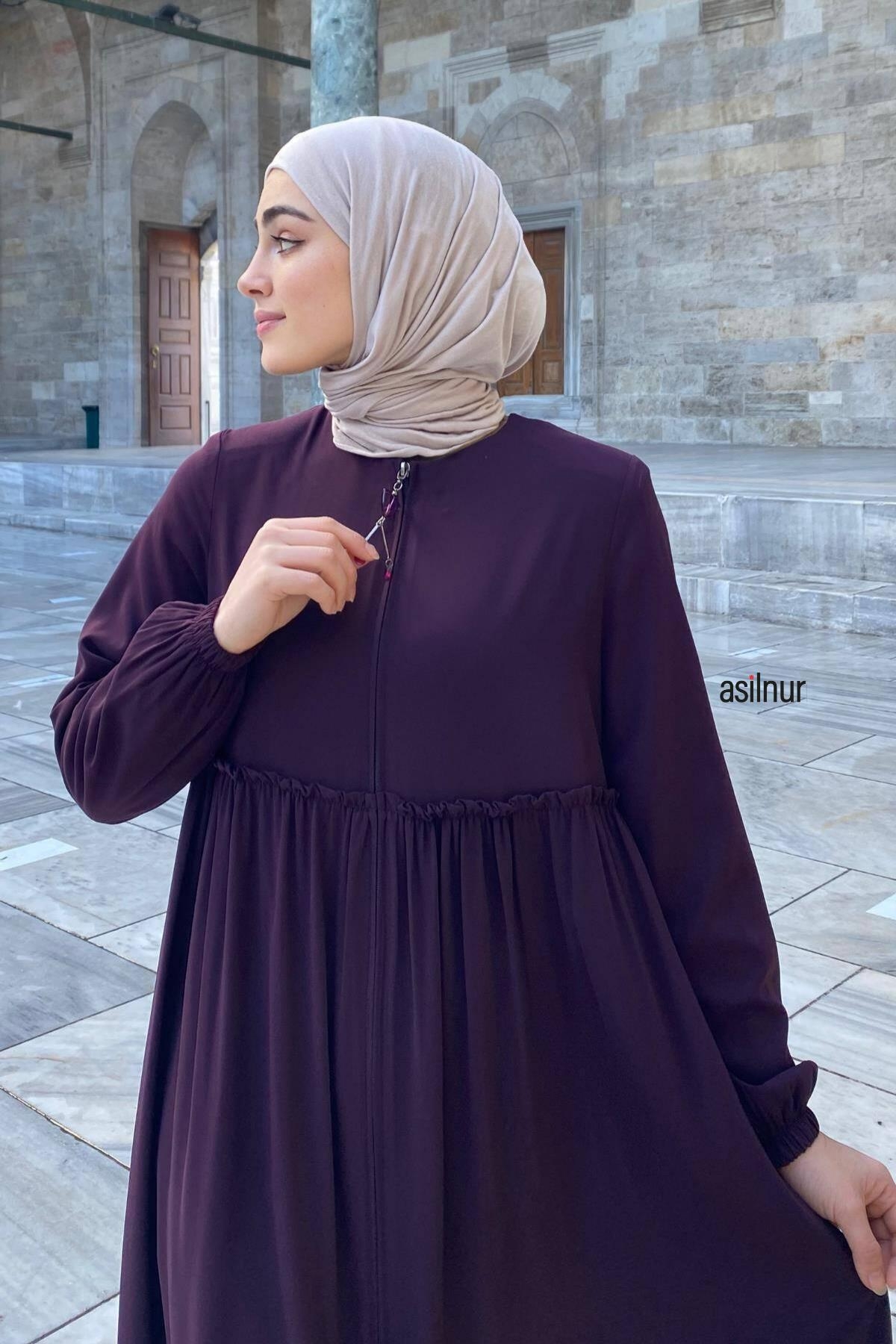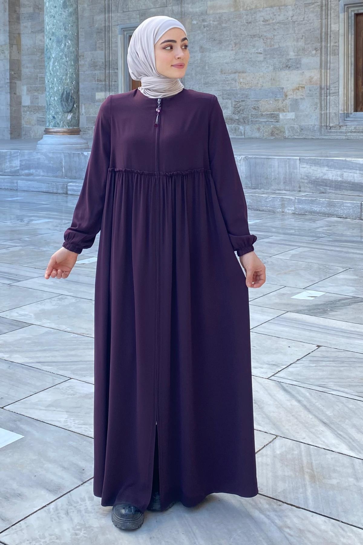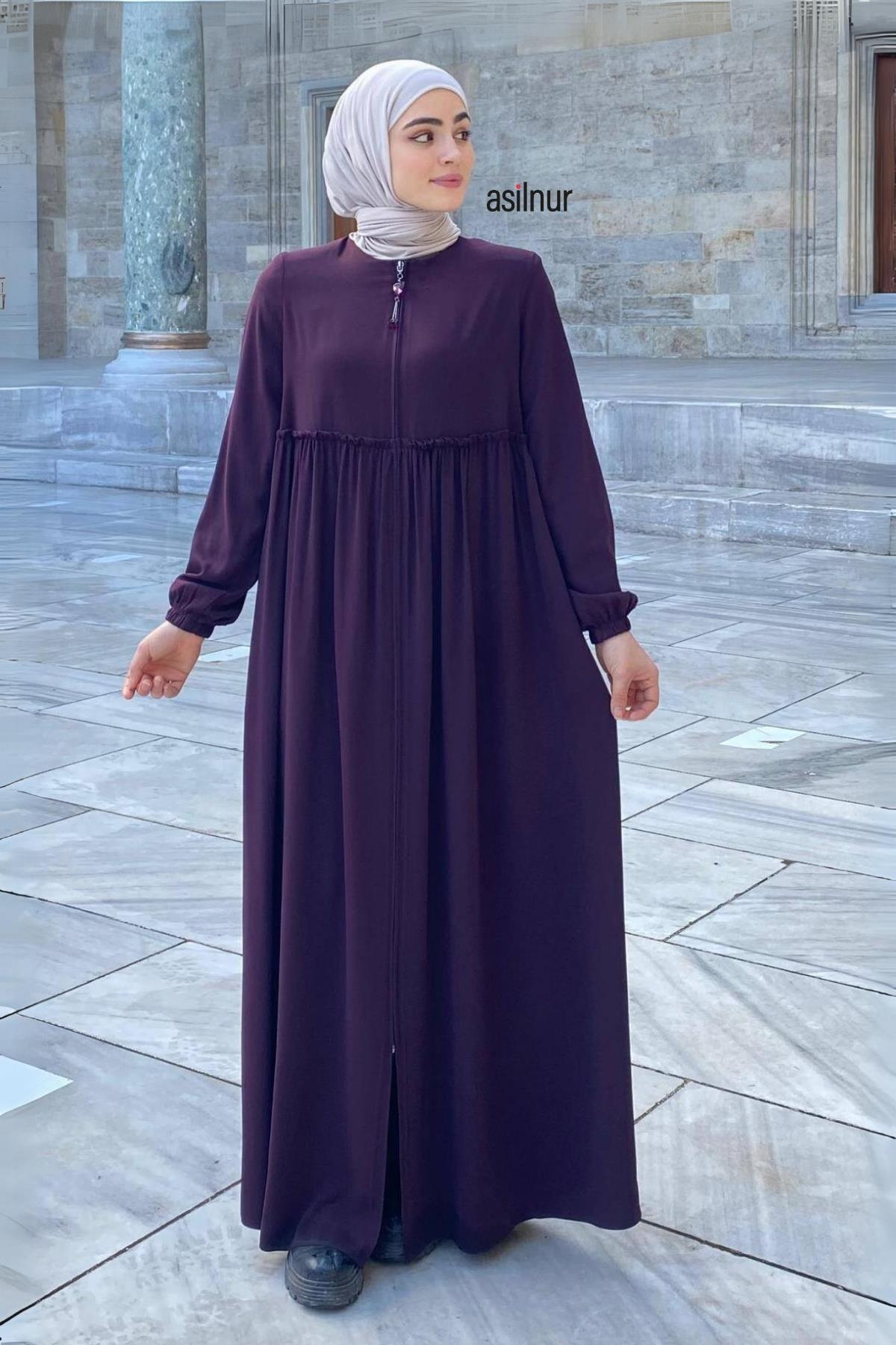 Erva Ferace Rabia krep kumaşıyla dört mevsim şıklık sunar. Tam kalıbı ve beli büzgülü tasarımıyla zarif bir siluet oluşturan bu model, lastikli manşetleriyle rahat bir kullanım sağlar.