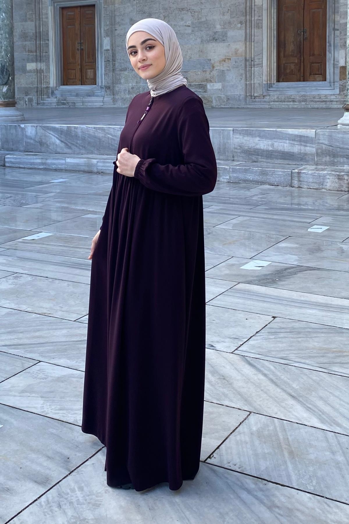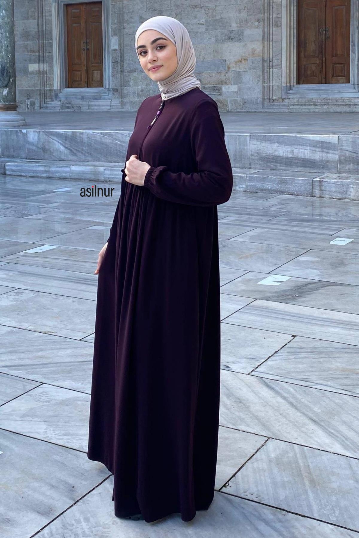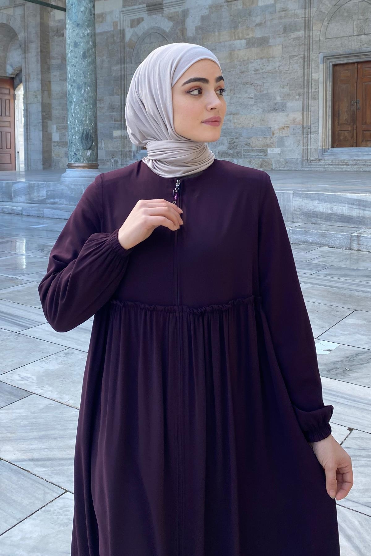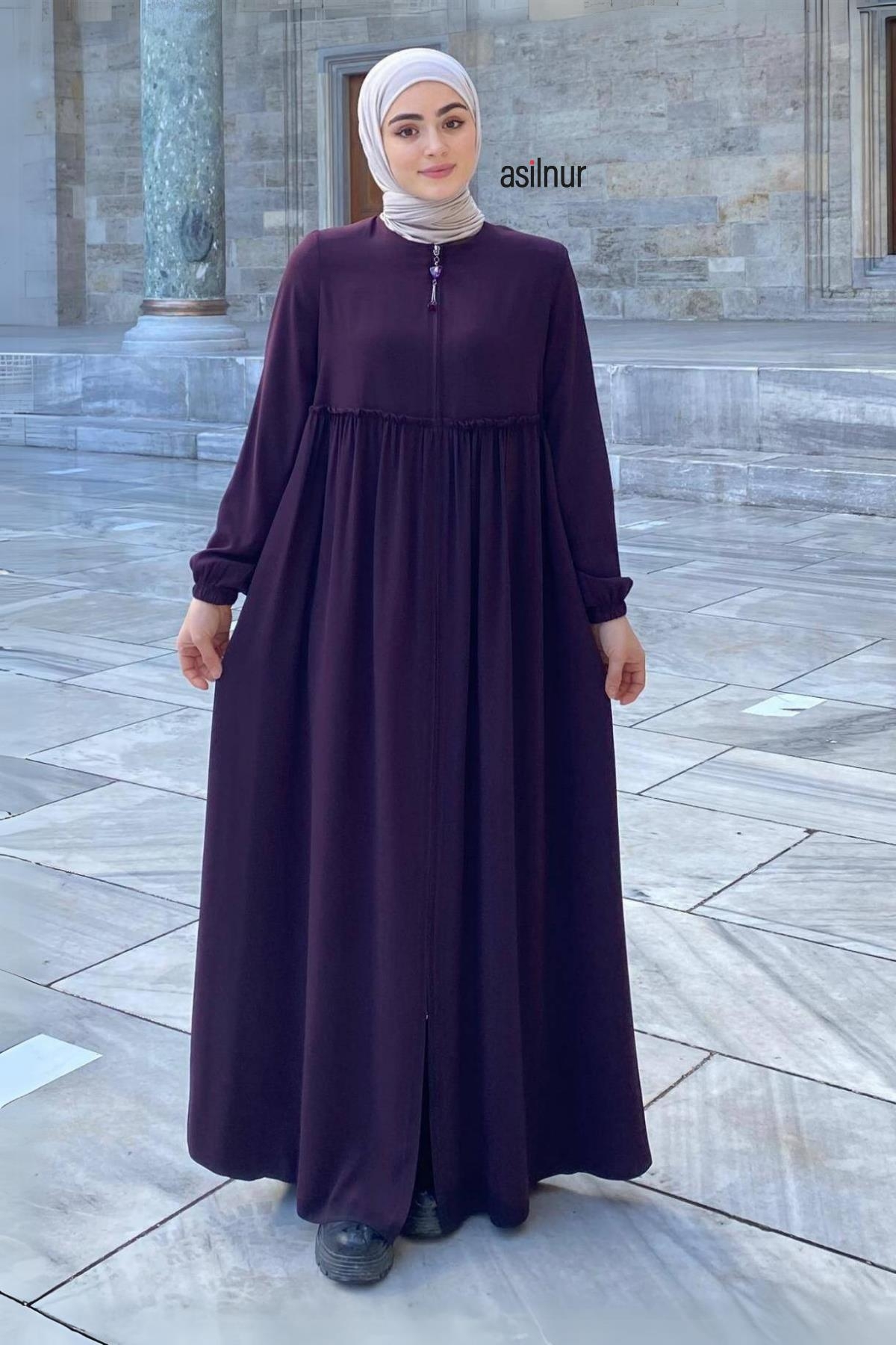 Erva Ferace Rabia krep kumaşıyla dört mevsim şıklık sunar. Tam kalıbı ve beli büzgülü tasarımıyla zarif bir siluet oluşturan bu model, lastikli manşetleriyle rahat bir kullanım sağlar.