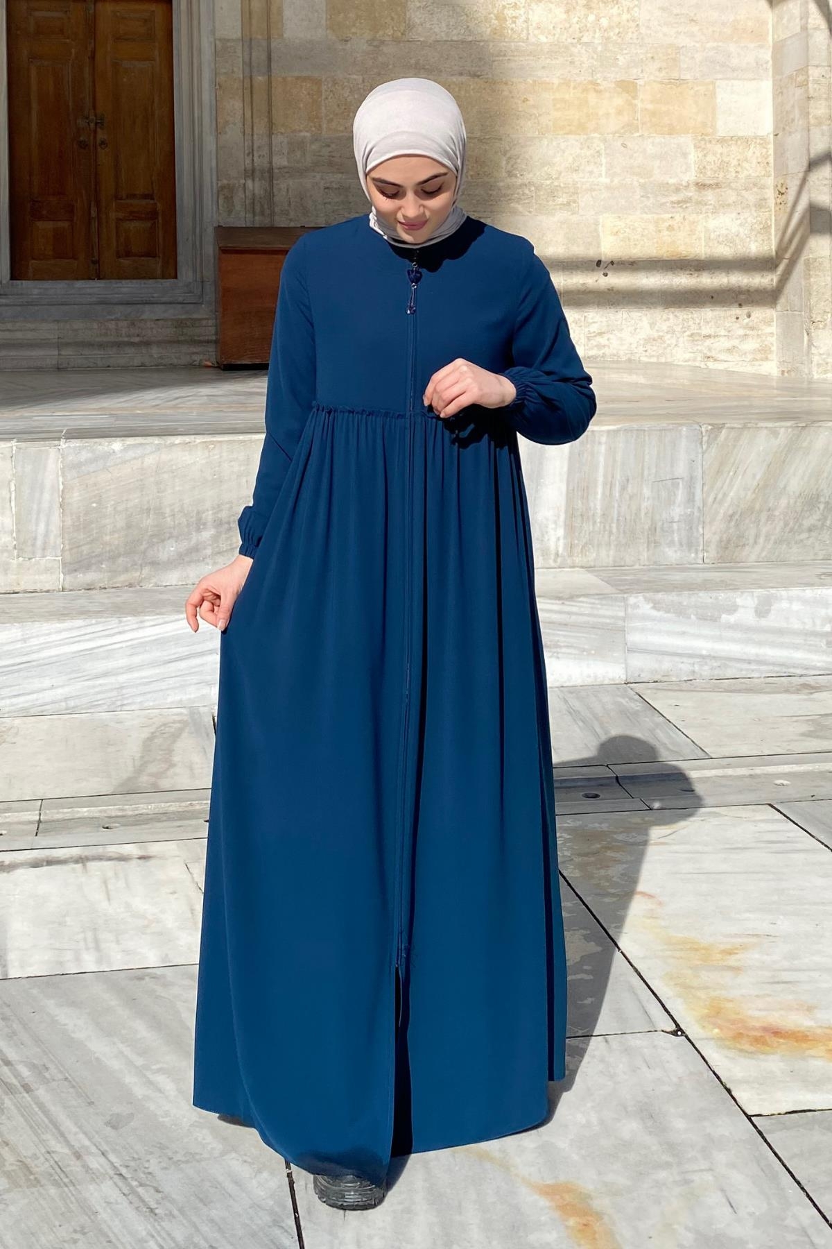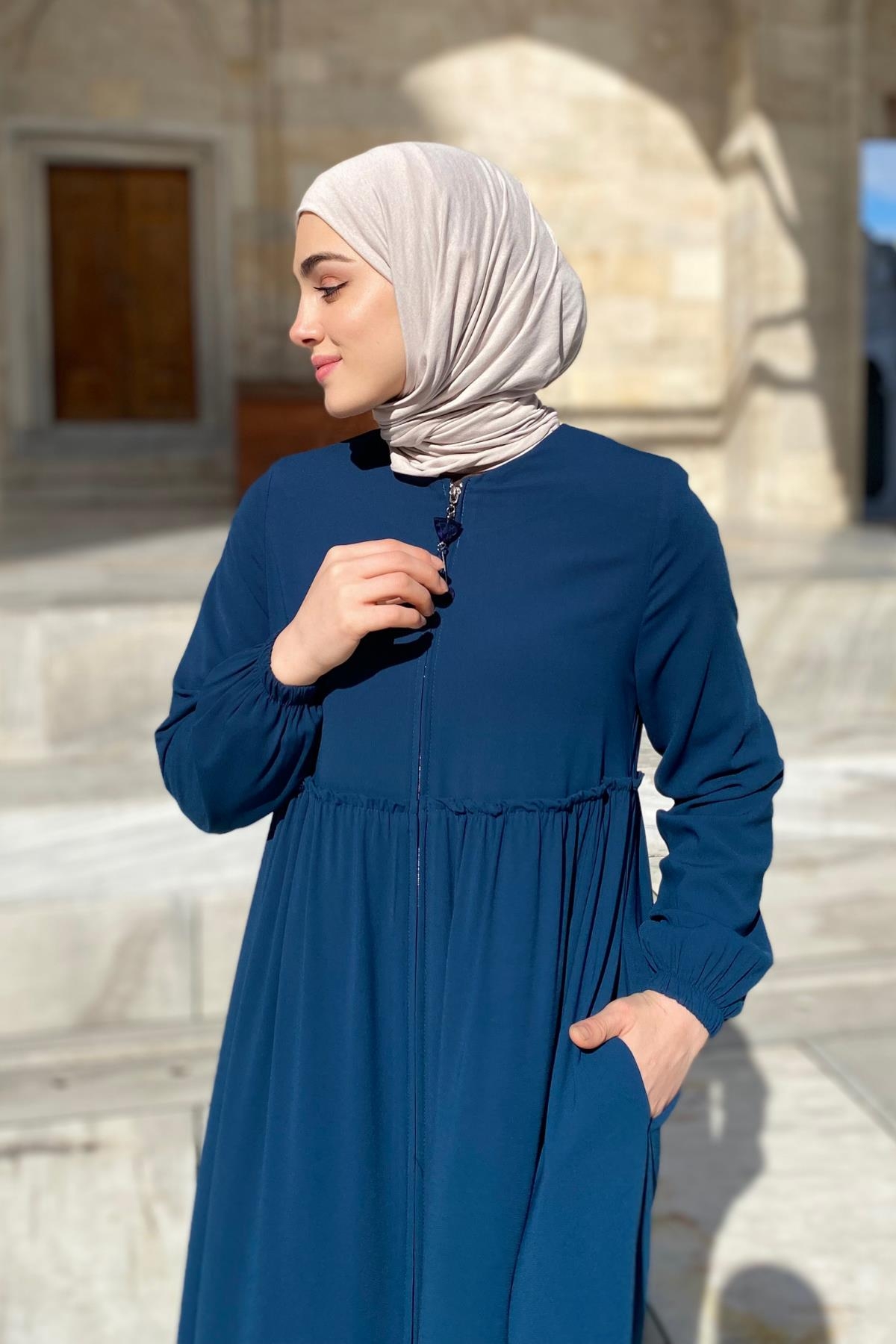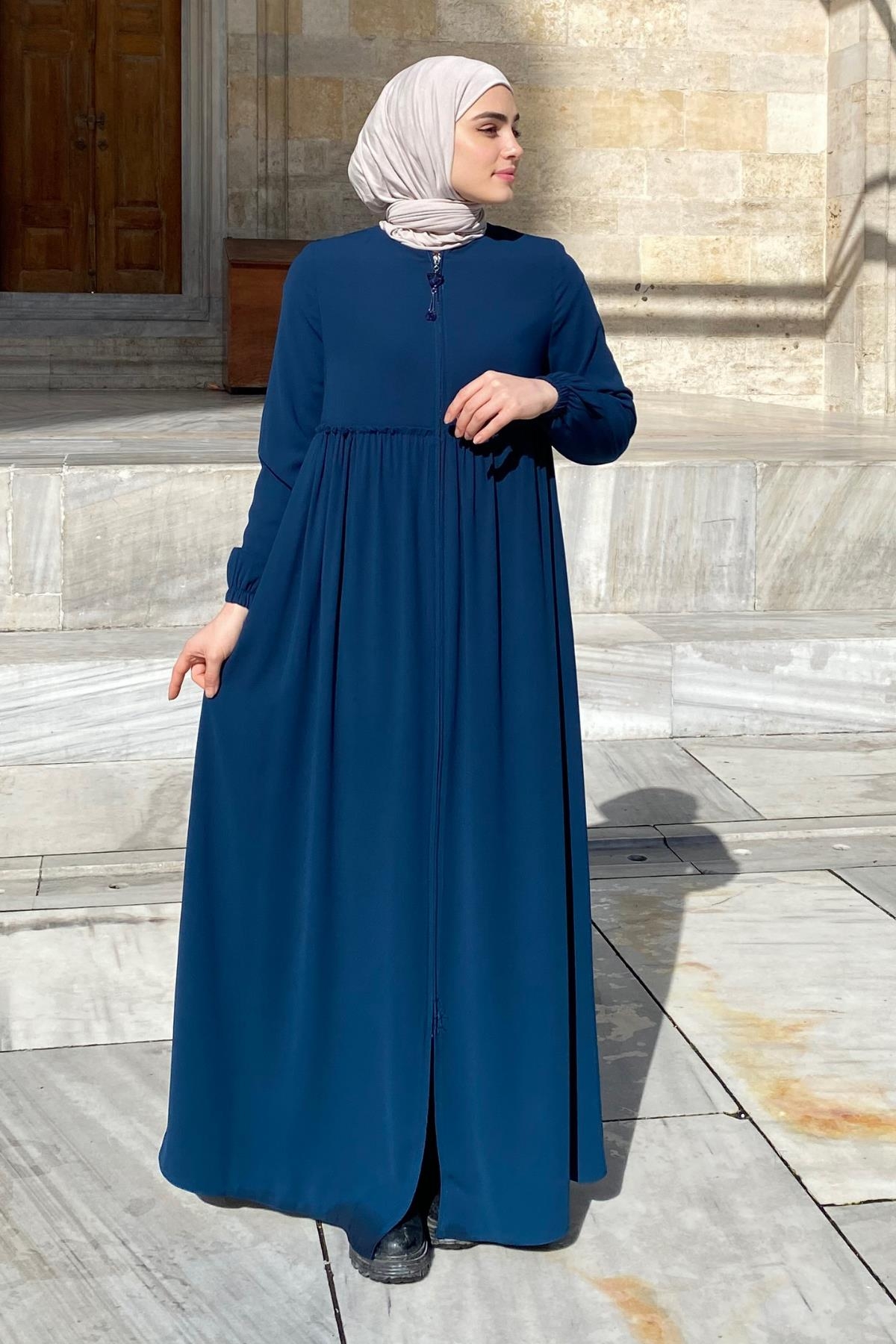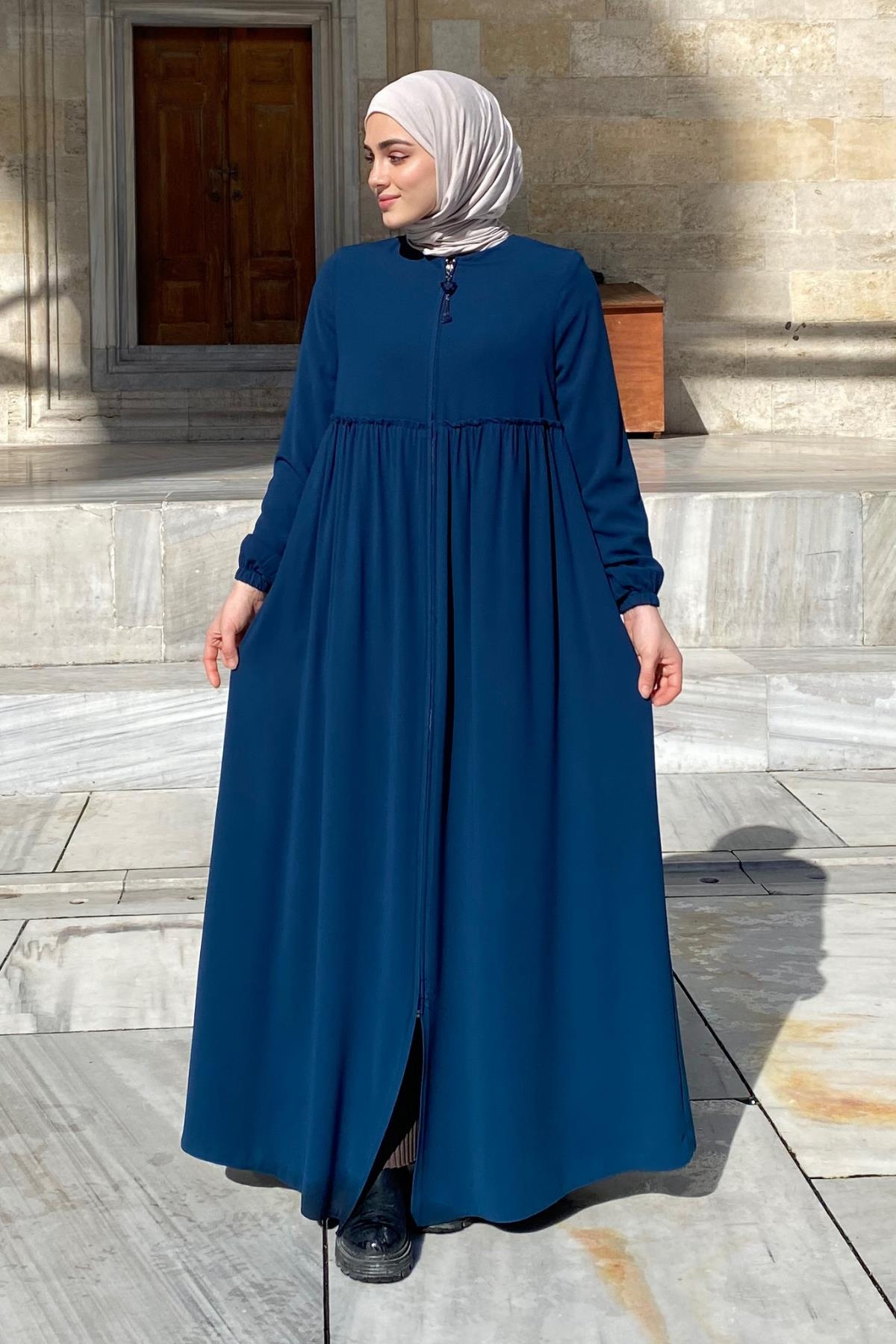 Erva Ferace Rabia krep kumaşıyla dört mevsim şıklık sunar. Tam kalıbı ve beli büzgülü tasarımıyla zarif bir siluet oluşturan bu model, lastikli manşetleriyle rahat bir kullanım sağlar.