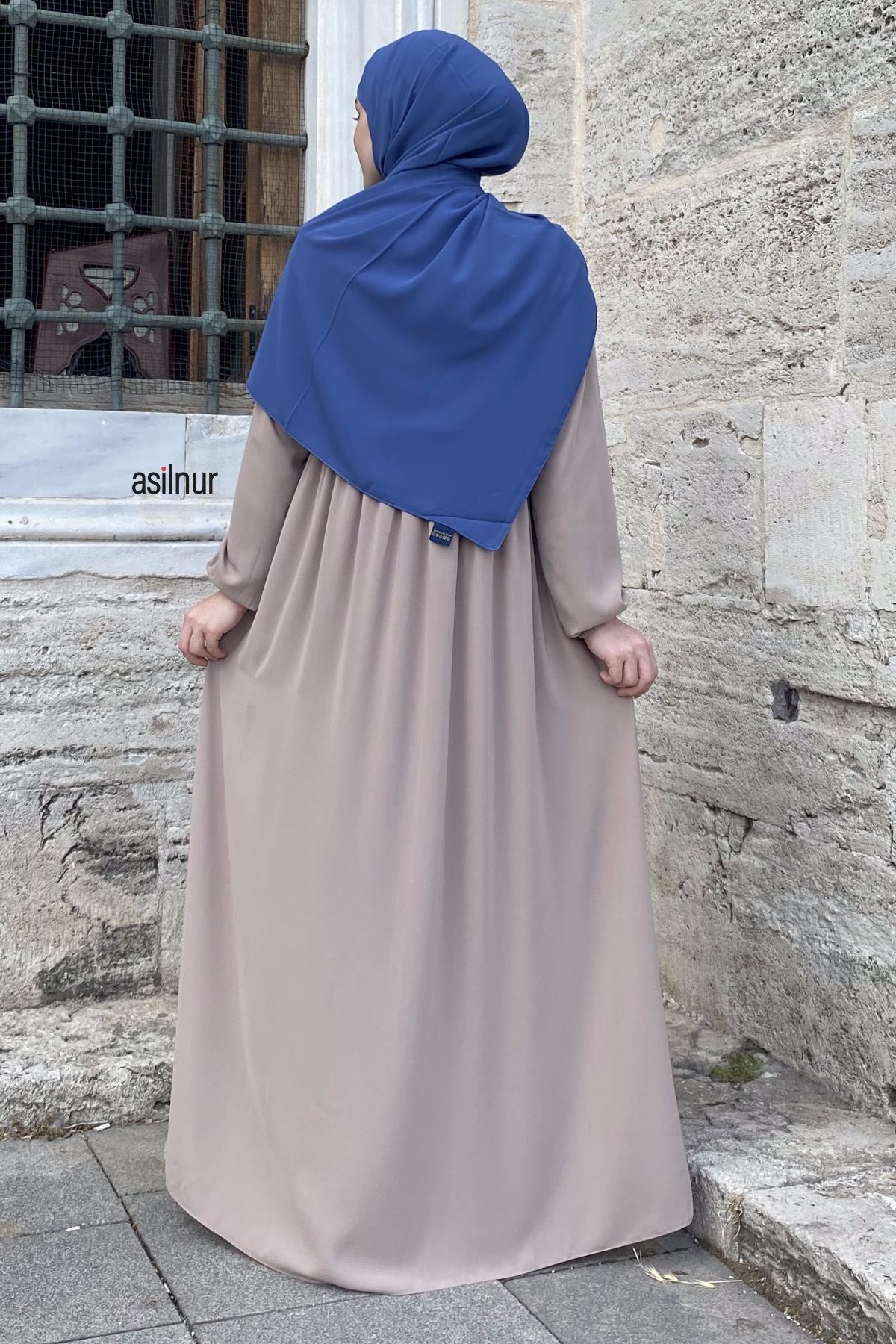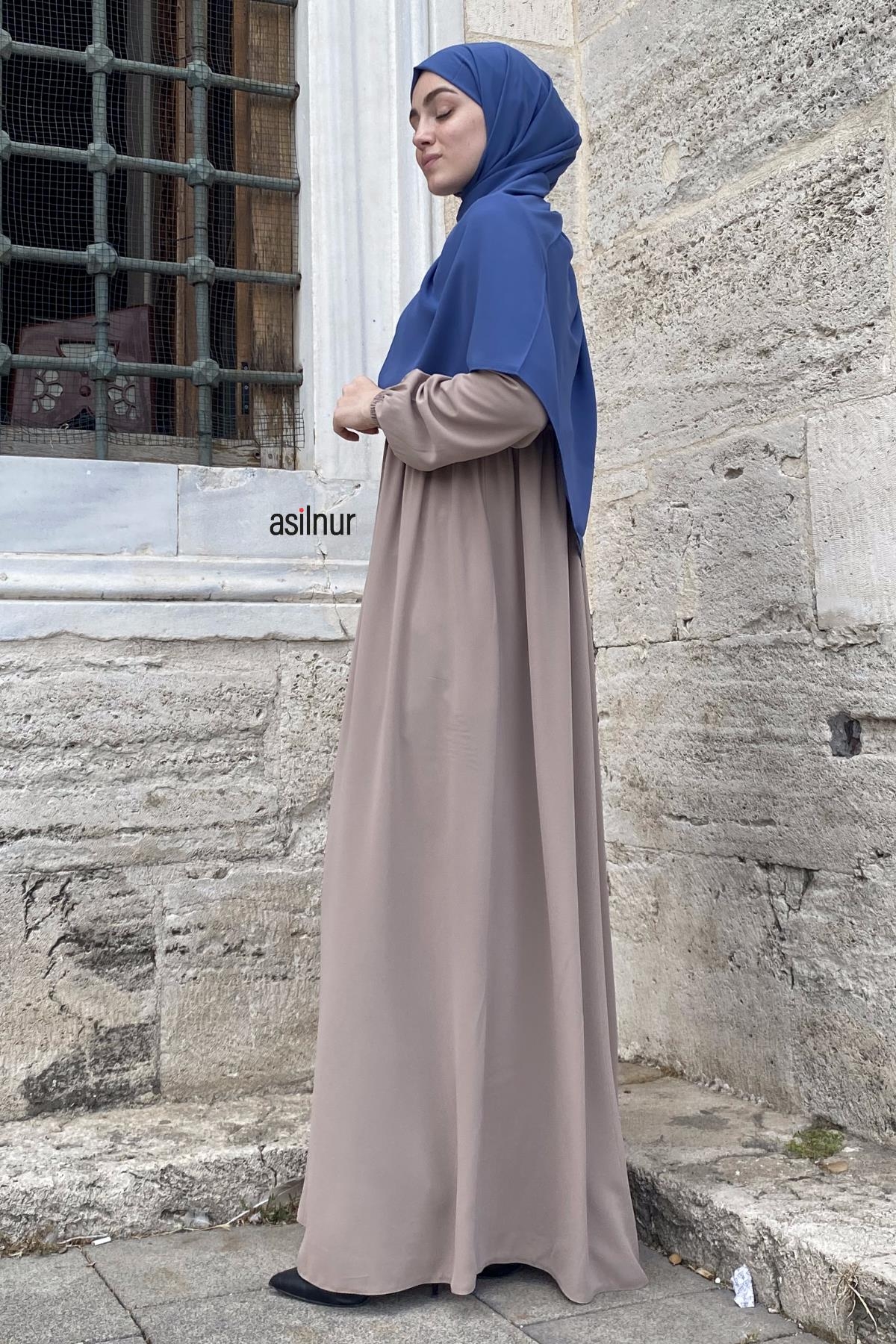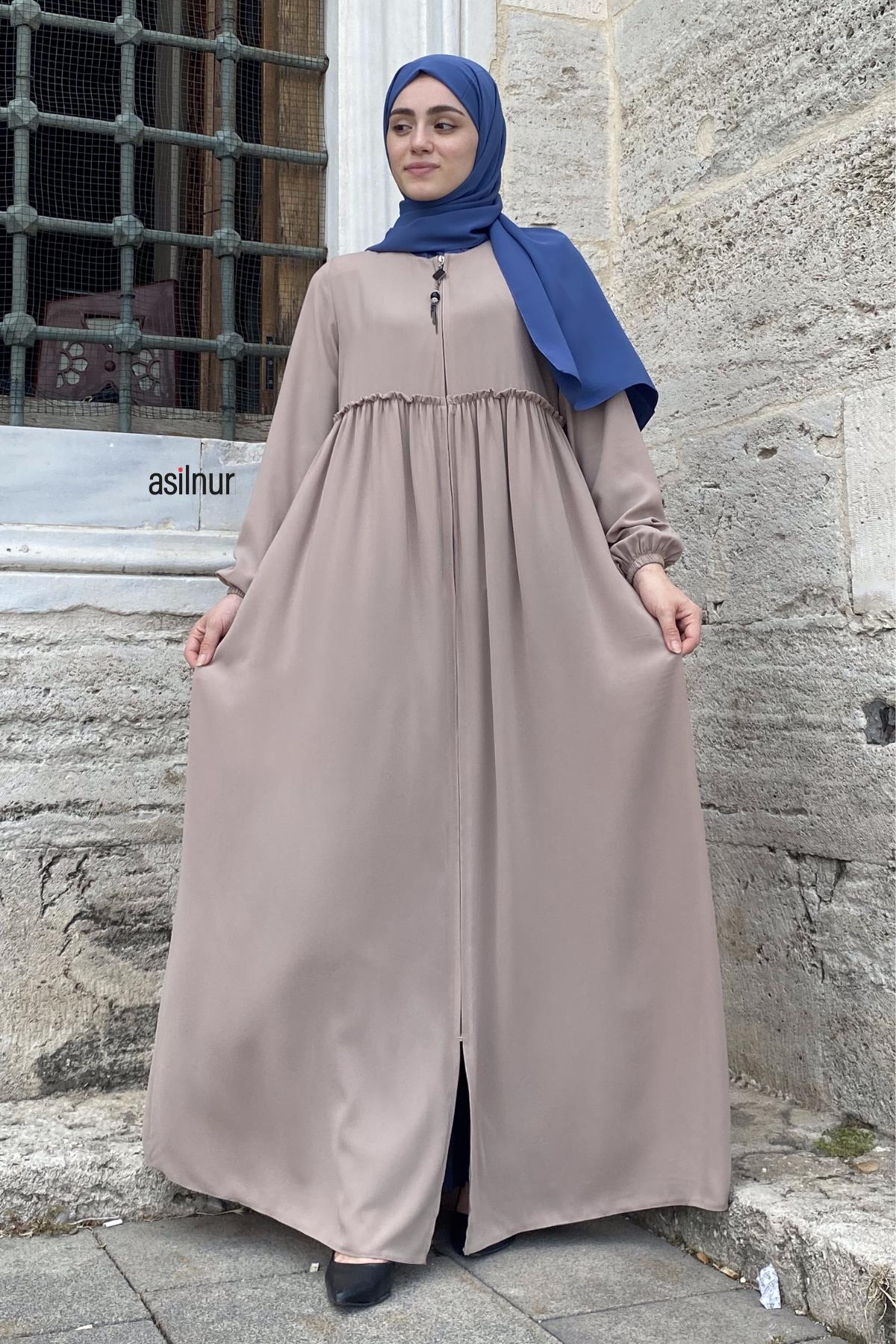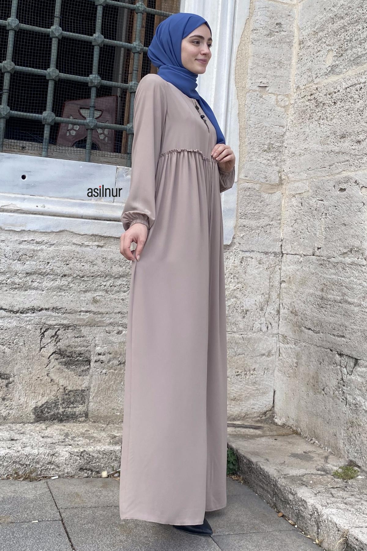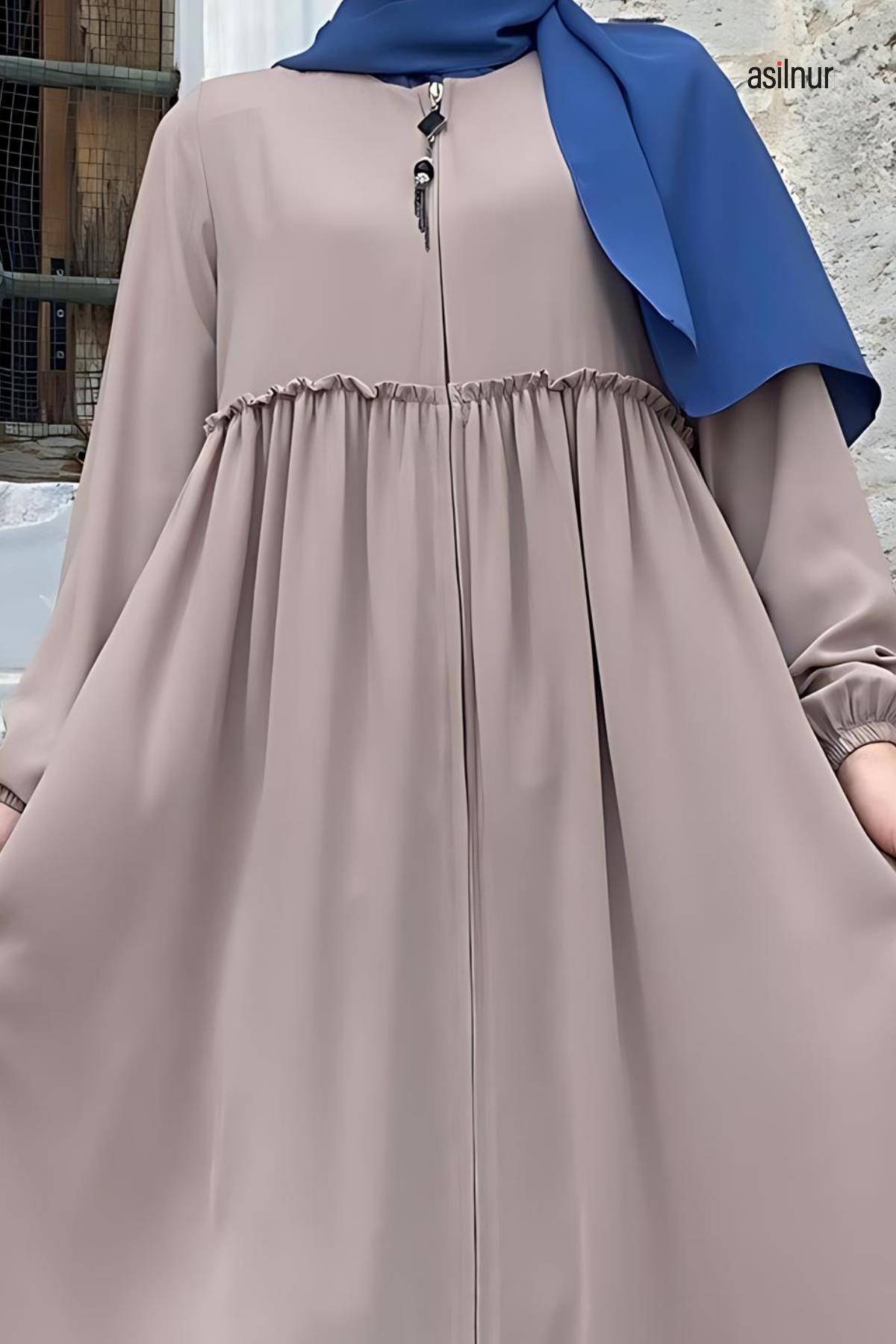 Erva Ferace Rabia krep kumaşıyla dört mevsim şıklık sunar. Tam kalıbı ve beli büzgülü tasarımıyla zarif bir siluet oluşturan bu model, lastikli manşetleriyle rahat bir kullanım sağlar.