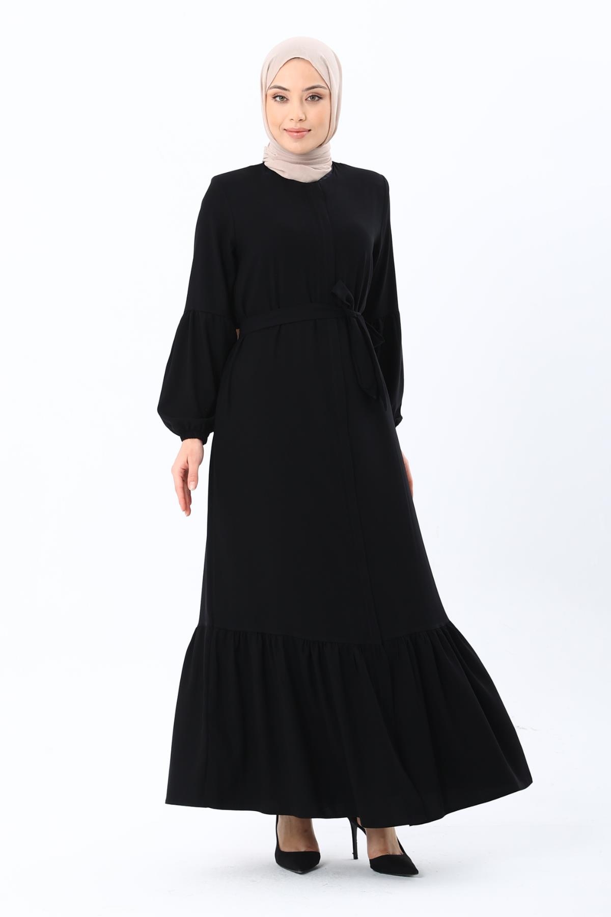 Lale Ferace Rabia Krep kumaşıyla dört mevsim kullanım için tasarlanmıştır. Tam kalıbı ve bisiklet yaka detayıyla zarif bir duruş sunarken, lastikli kol yapısı ve gizli fermuarıyla pratikliği artırır.