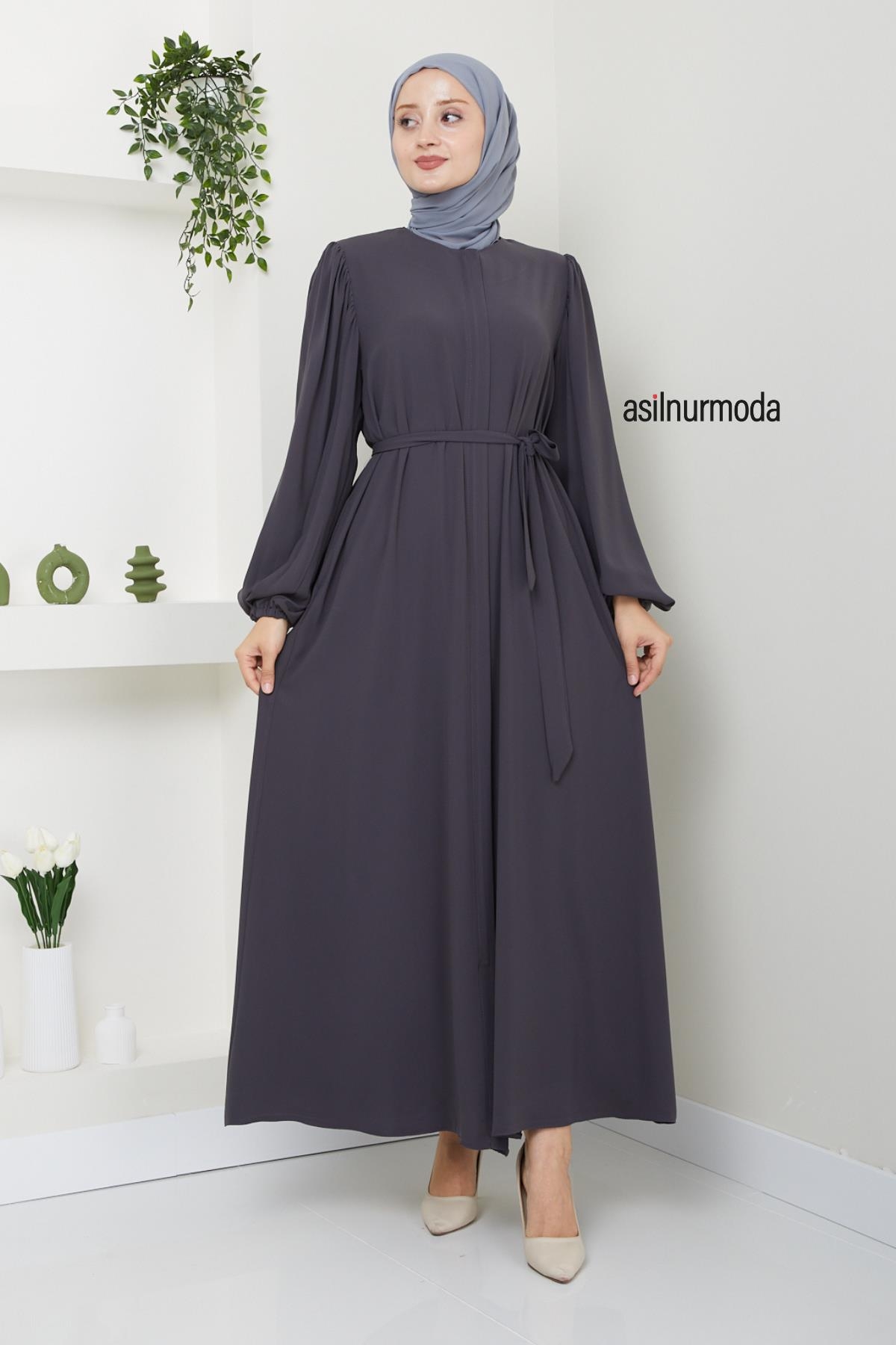 Hale Omuz Pileli Balon Kol Ferace, Rabia Krep kumaşıyla dört mevsim kullanıma uygun, şık ve rahat bir tercihtir. Omuzdaki pile detayları ve balon kol tasarımıyla zarif bir görünüm sunarken, lastikli manşetler ve fermuar detayıyla günlük kullanımda konfor sağlar.