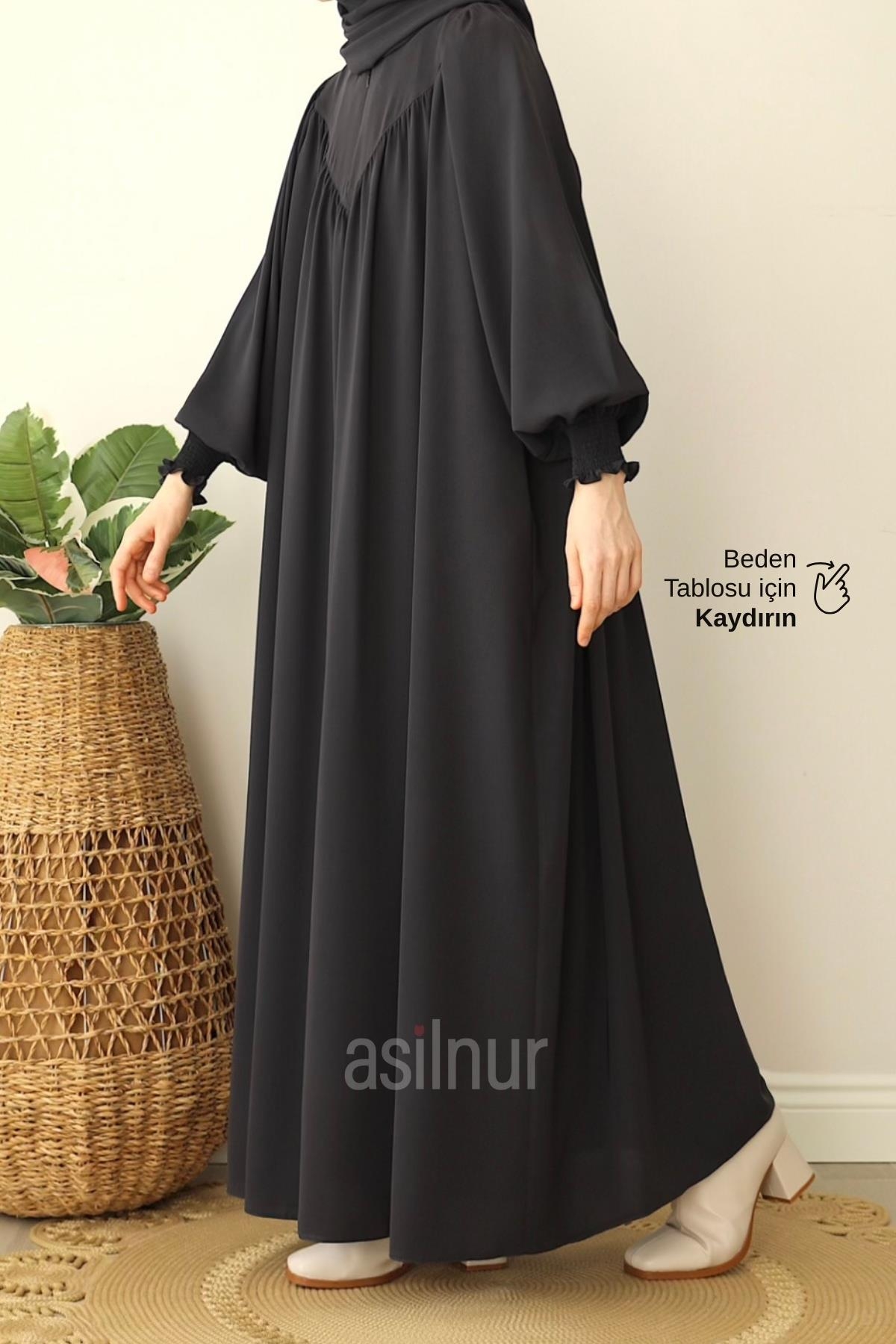İrem Elbise, göğüs kısmındaki V şeklinde büzgü detayıyla zarif bir görünüm sunarken Medine İpeği kumaşı sayesinde dört mevsim şıklığınızı tamamlar.