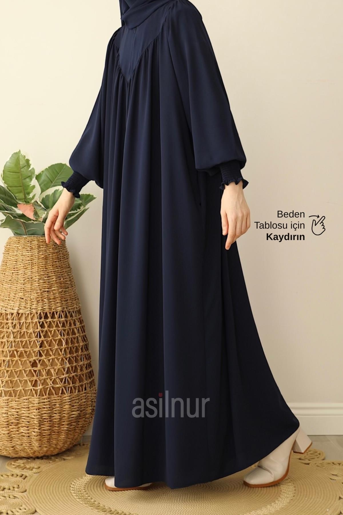 İrem Elbise, göğüs kısmındaki V şeklinde büzgü detayıyla zarif bir görünüm sunarken Medine İpeği kumaşı sayesinde dört mevsim şıklığınızı tamamlar.