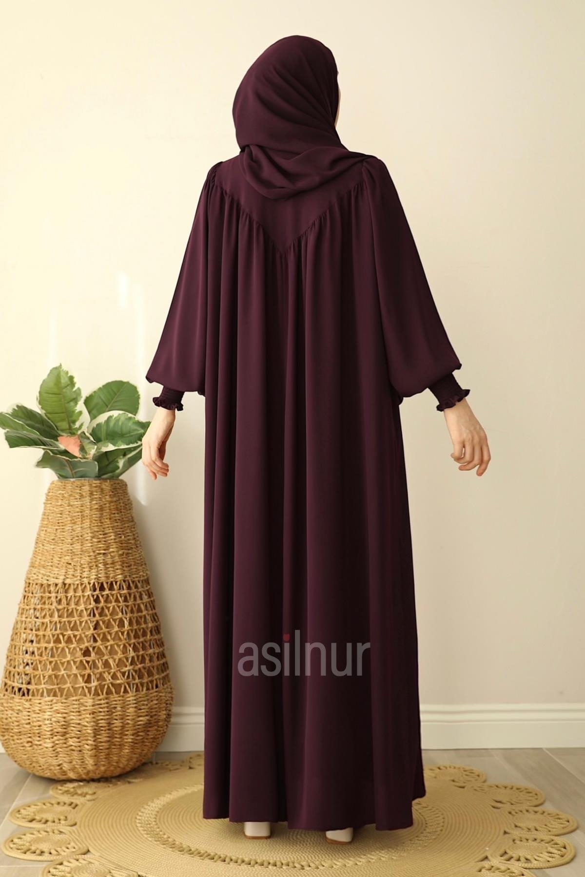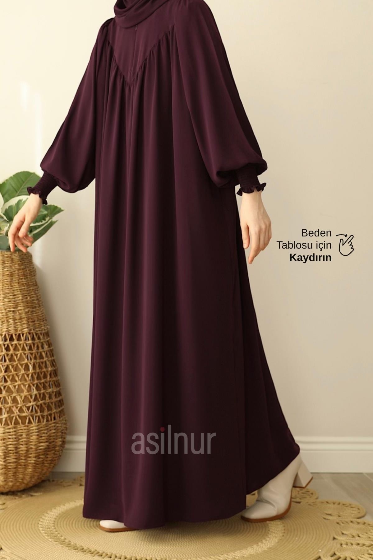 İrem Elbise, göğüs kısmındaki V şeklinde büzgü detayıyla zarif bir görünüm sunarken Medine İpeği kumaşı sayesinde dört mevsim şıklığınızı tamamlar.