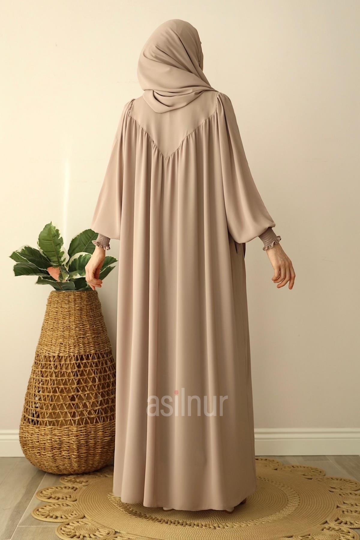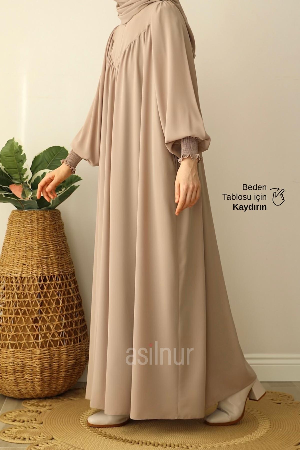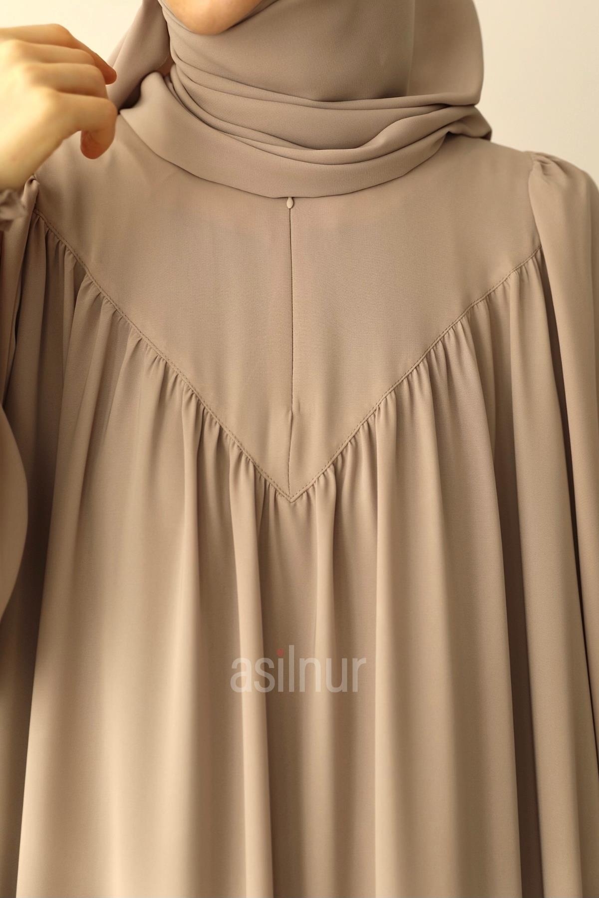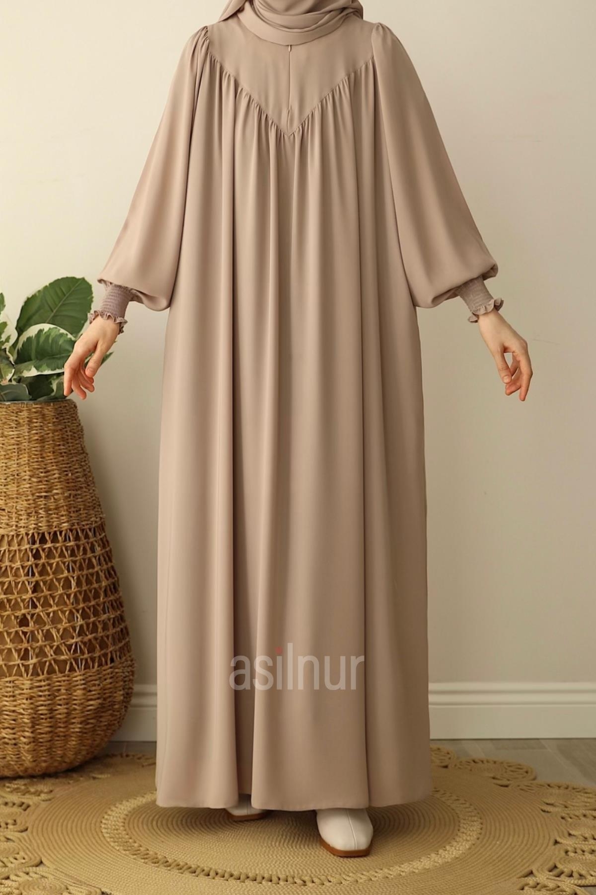 İrem Elbise, göğüs kısmındaki V şeklinde büzgü detayıyla zarif bir görünüm sunarken Medine İpeği kumaşı sayesinde dört mevsim şıklığınızı tamamlar.