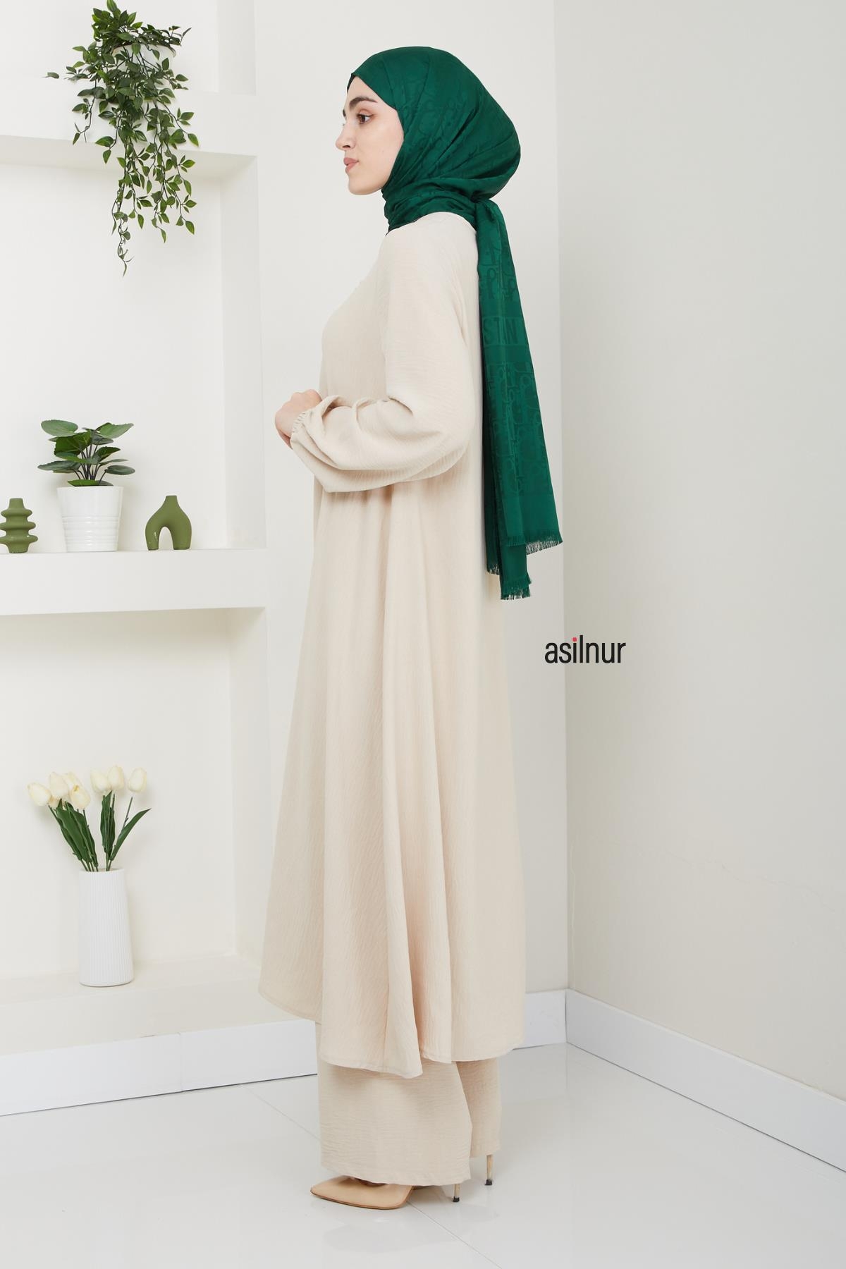Mevlana İkili Takım, Ayrobin kumaşının hafifliği ve dört mevsim kullanım avantajıyla zarif bir seçenek sunar. Üst parçasındaki geniş etek detayı Mevlana kesiminin özgün şıklığını yansıtır.