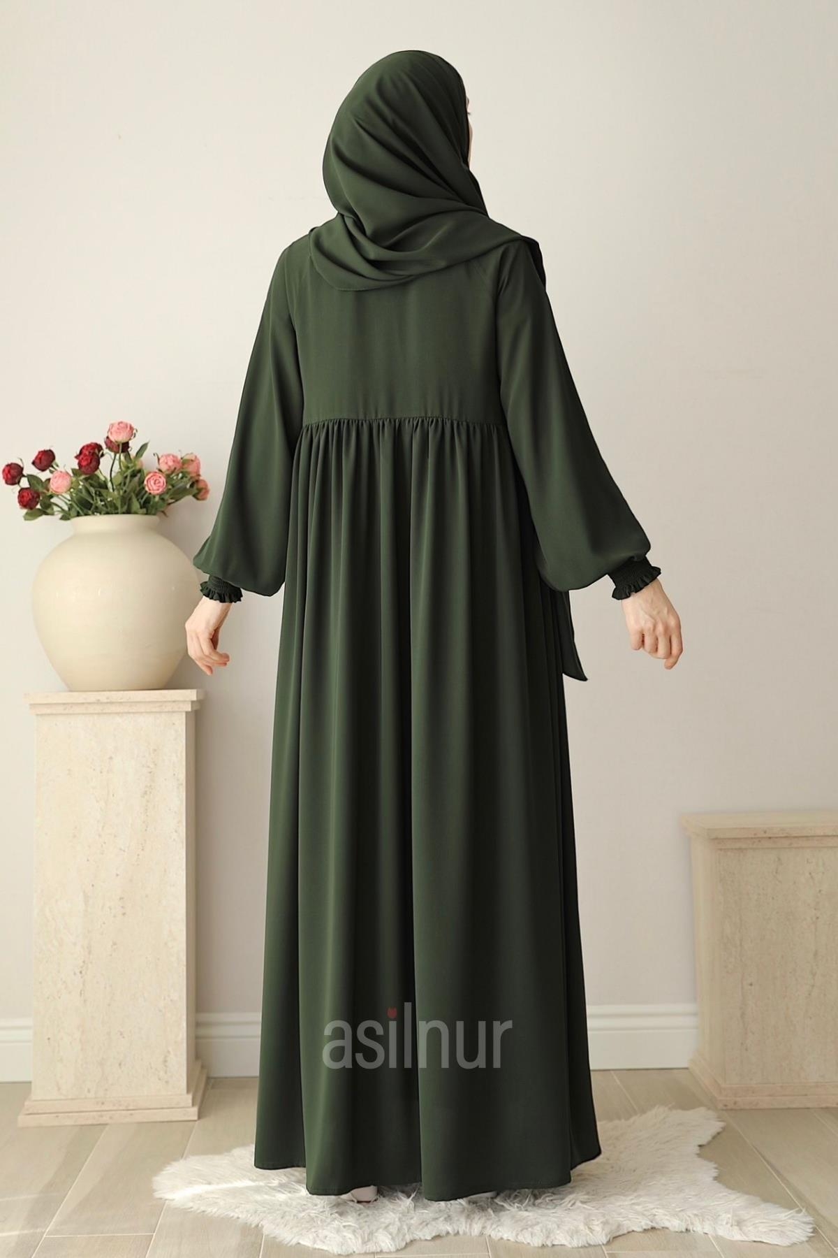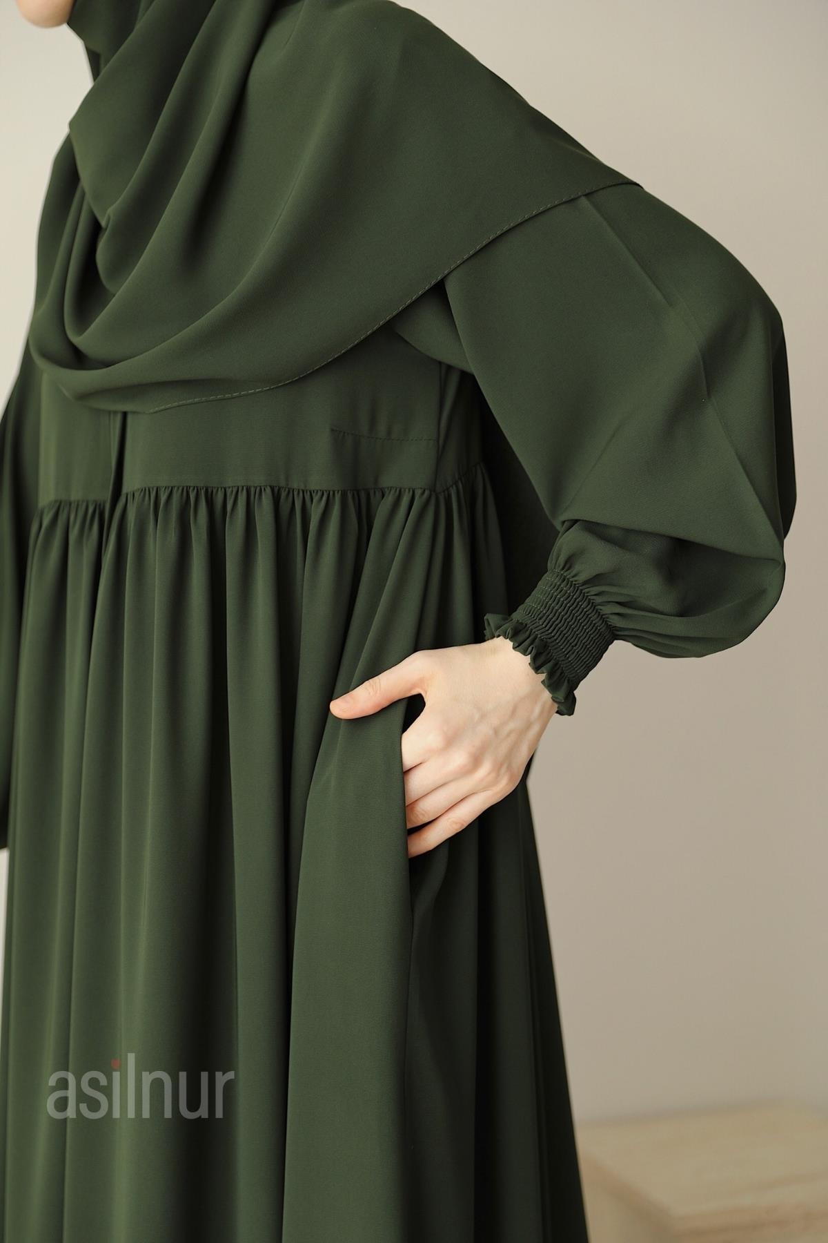Nisa Ferace Şal Hediyeli Takım, 1. Sınıf Mısır Medine ipeği kumaşıyla dört mevsim kullanım için idealdir. Rahat kalıbı, gipe lastik kolları, cep ve fermuar detaylarıyla konforlu bir şıklık sunar. Ürünle birlikte gelen aynı renk şal hediyesiyle kombininiz tamamlanır.