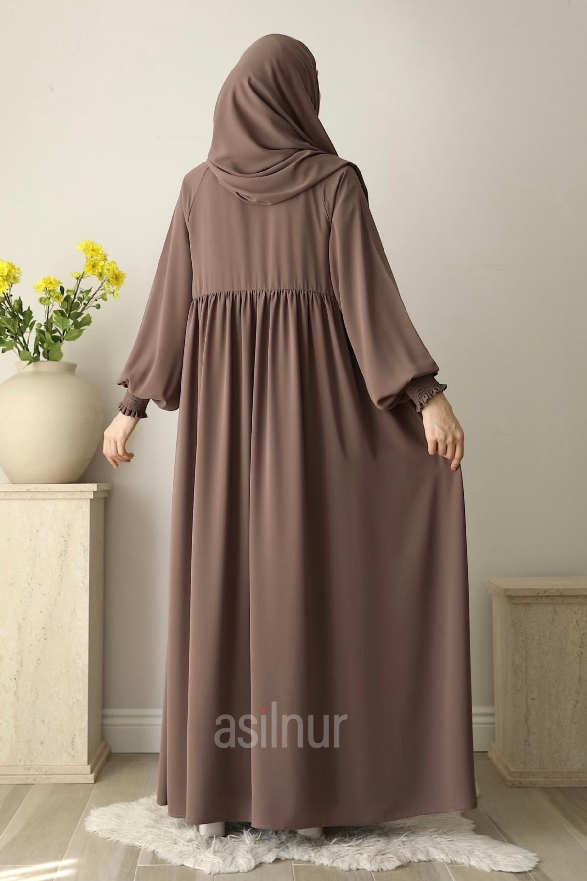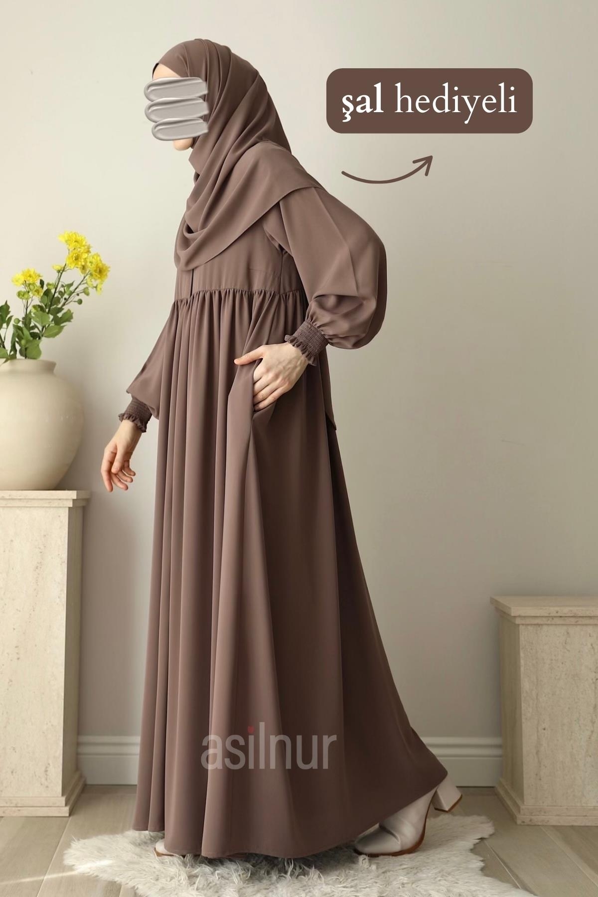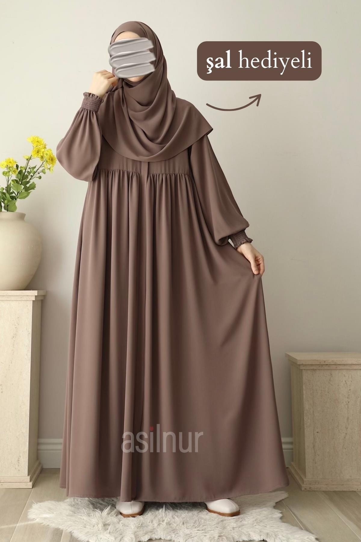 Nisa Ferace Şal Hediyeli Takım, 1. Sınıf Mısır Medine ipeği kumaşıyla dört mevsim kullanım için idealdir. Rahat kalıbı, gipe lastik kolları, cep ve fermuar detaylarıyla konforlu bir şıklık sunar. Ürünle birlikte gelen aynı renk şal hediyesiyle kombininiz tamamlanır.
