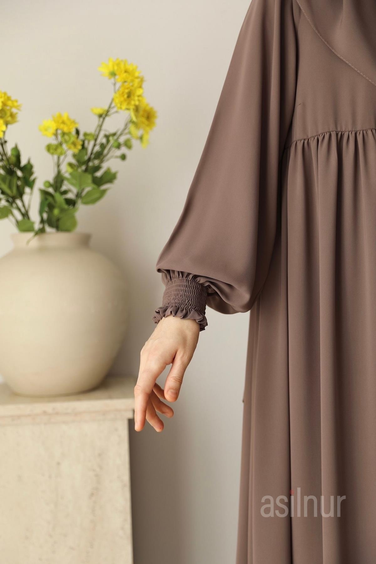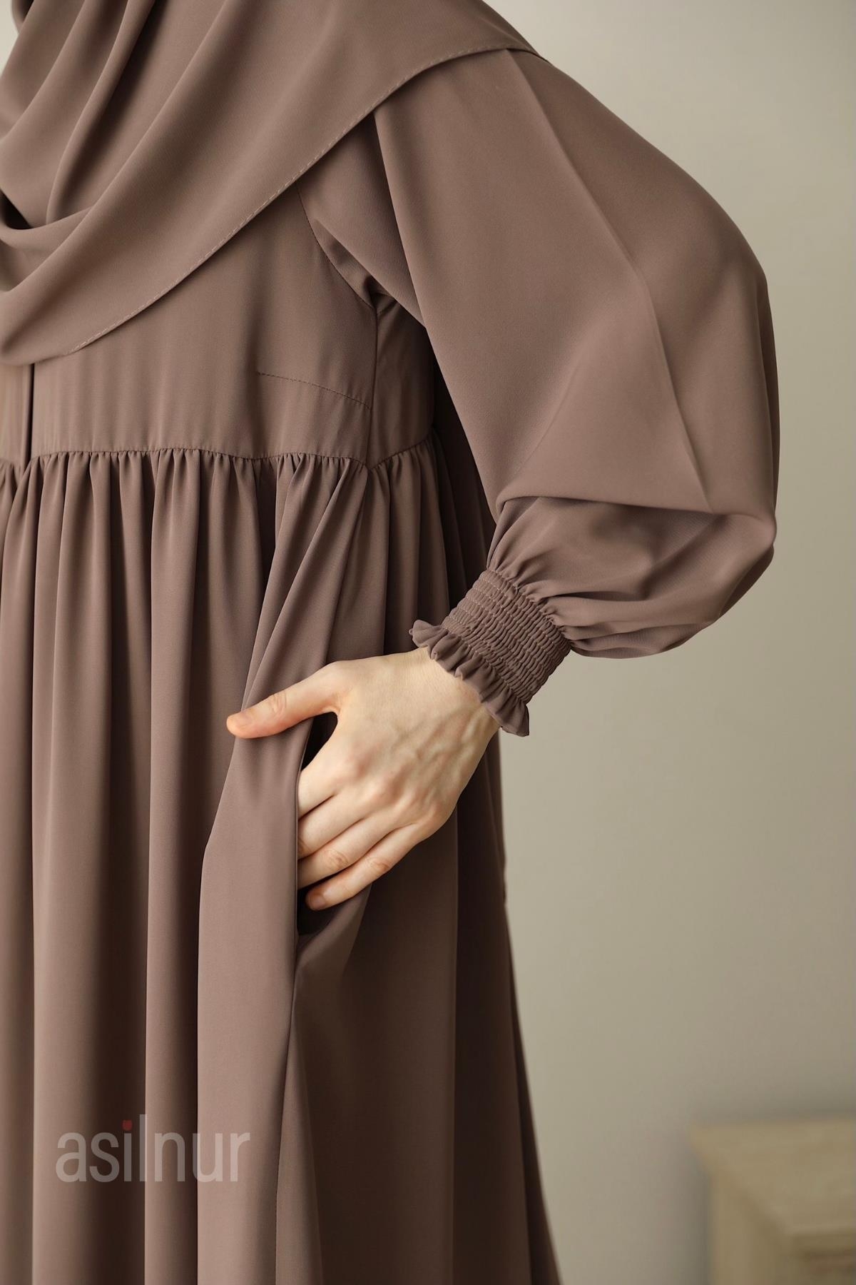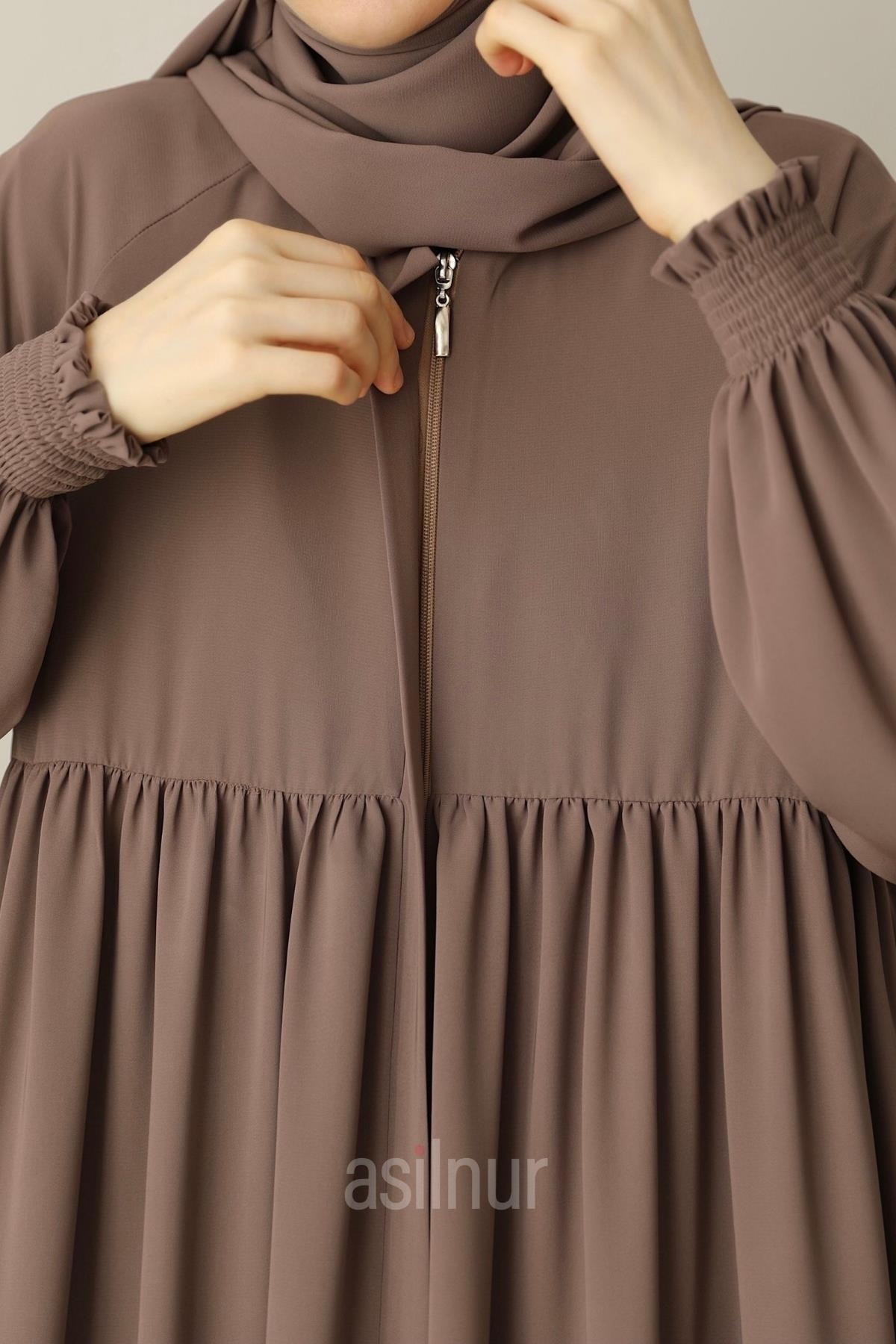 Nisa Ferace Şal Hediyeli Takım, 1. Sınıf Mısır Medine ipeği kumaşıyla dört mevsim kullanım için idealdir. Rahat kalıbı, gipe lastik kolları, cep ve fermuar detaylarıyla konforlu bir şıklık sunar. Ürünle birlikte gelen aynı renk şal hediyesiyle kombininiz tamamlanır.