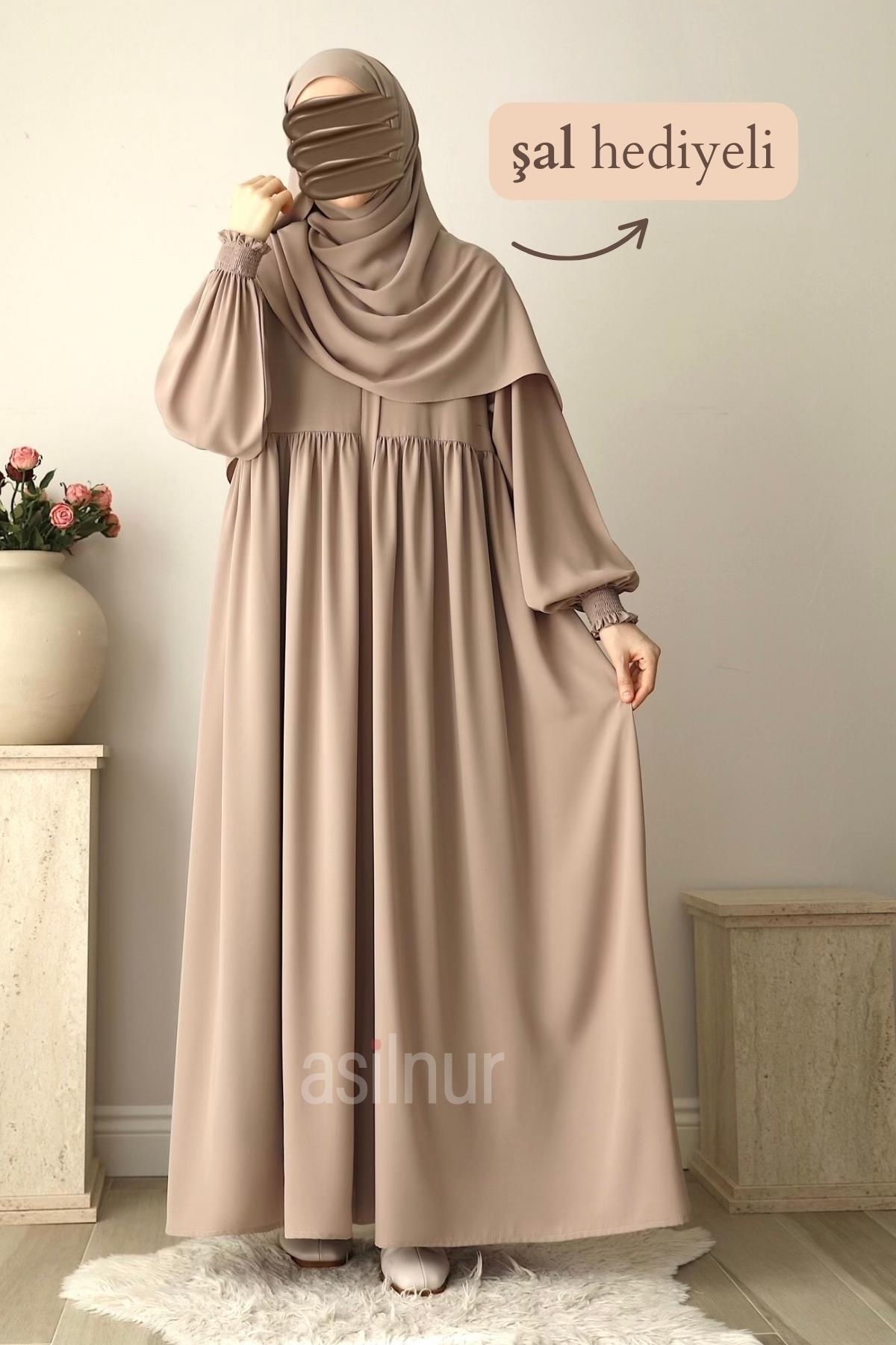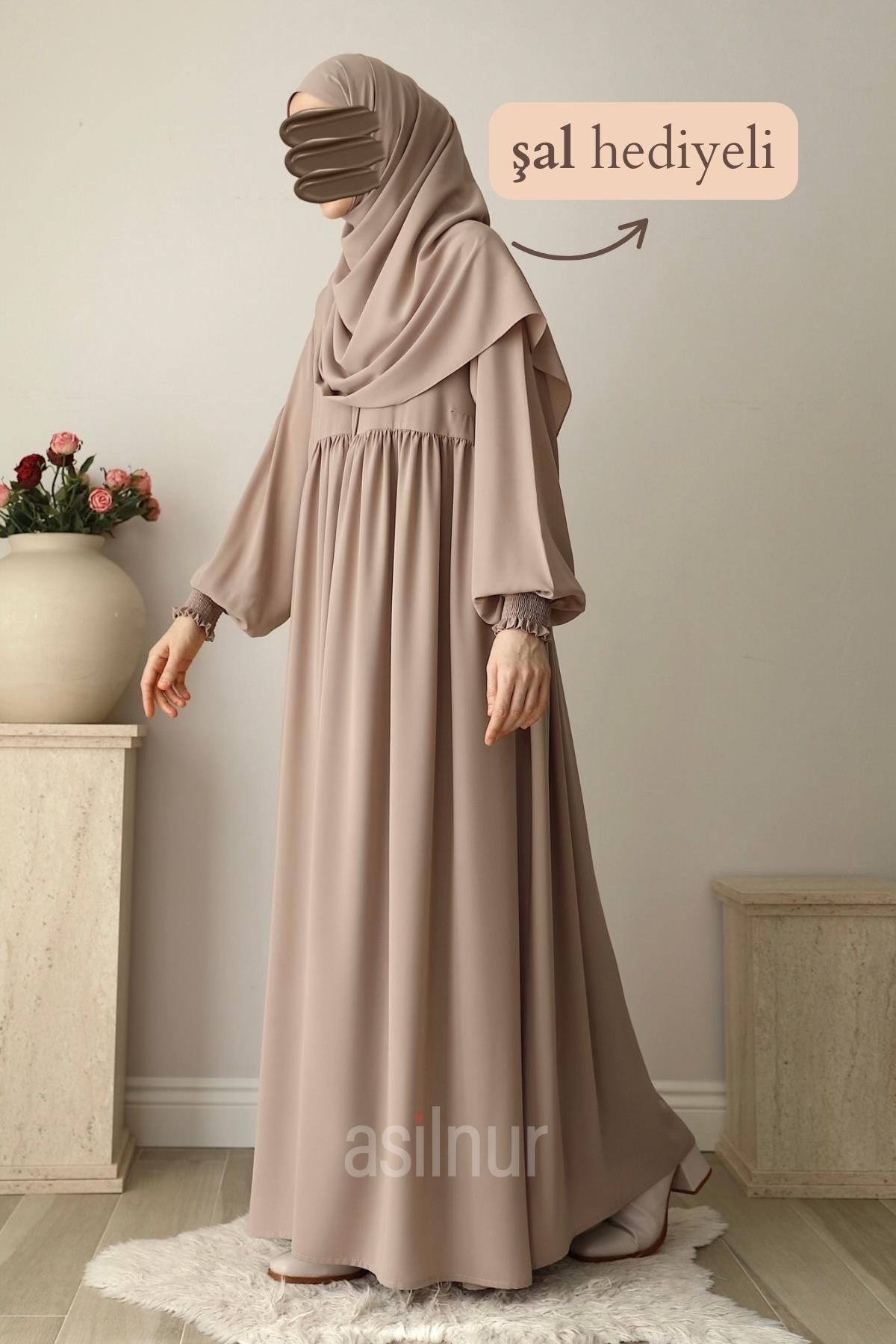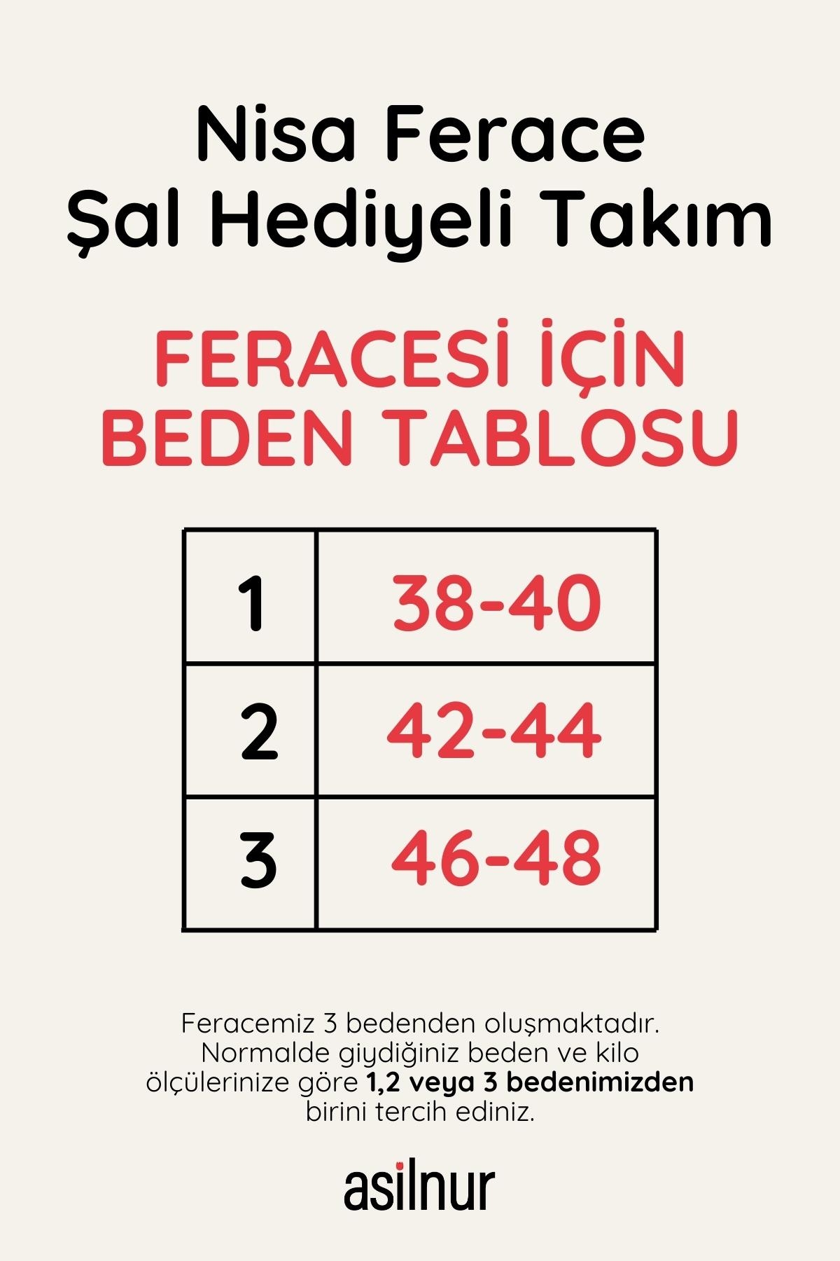 Nisa Ferace Şal Hediyeli Takım, 1. Sınıf Mısır Medine ipeği kumaşıyla dört mevsim kullanım için idealdir. Rahat kalıbı, gipe lastik kolları, cep ve fermuar detaylarıyla konforlu bir şıklık sunar. Ürünle birlikte gelen aynı renk şal hediyesiyle kombininiz tamamlanır.