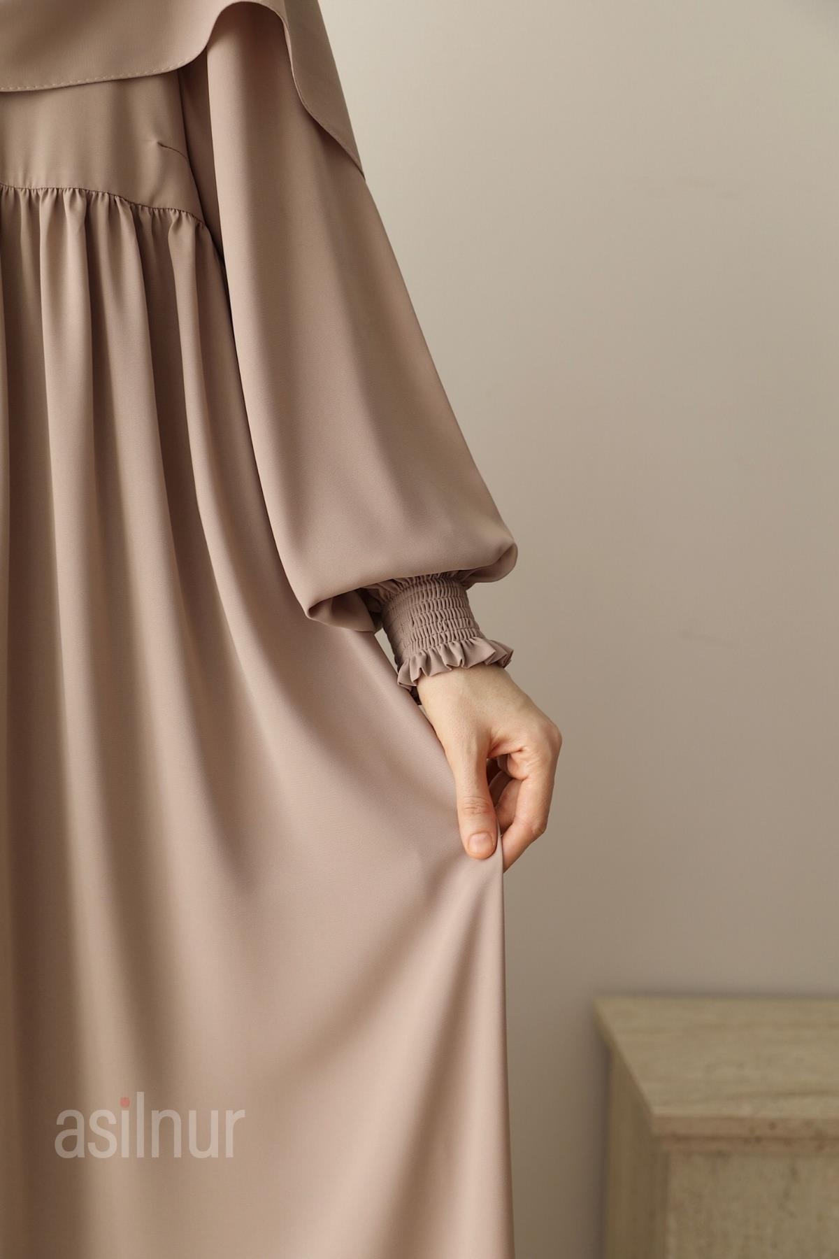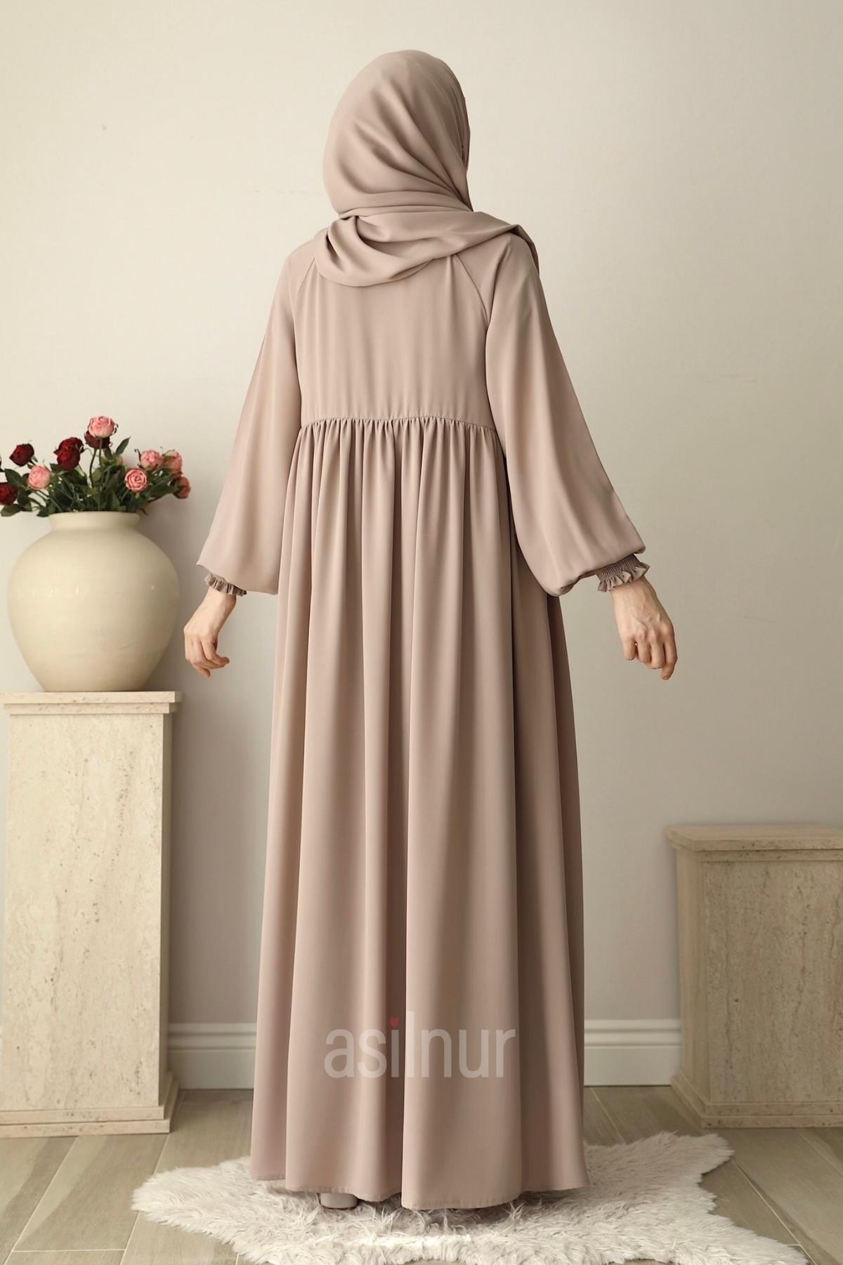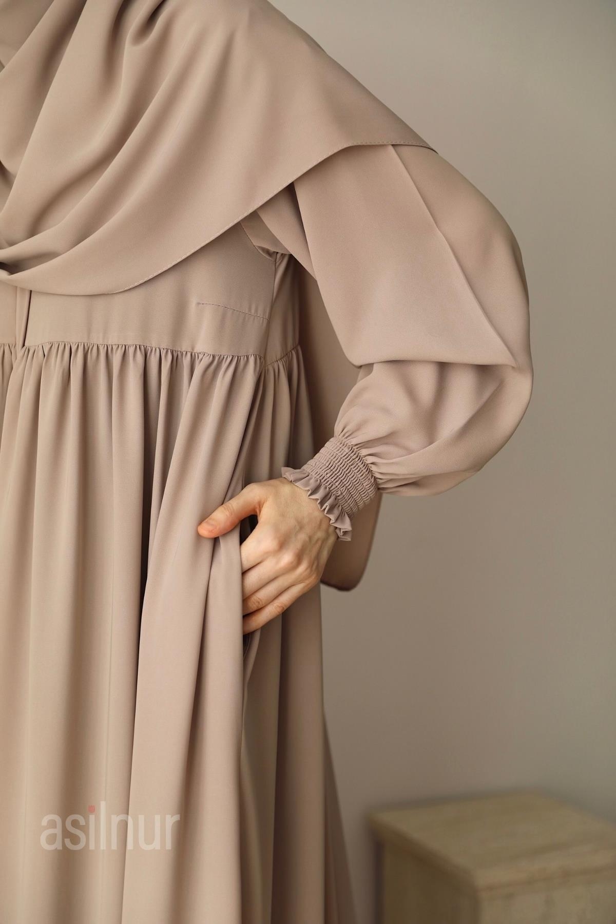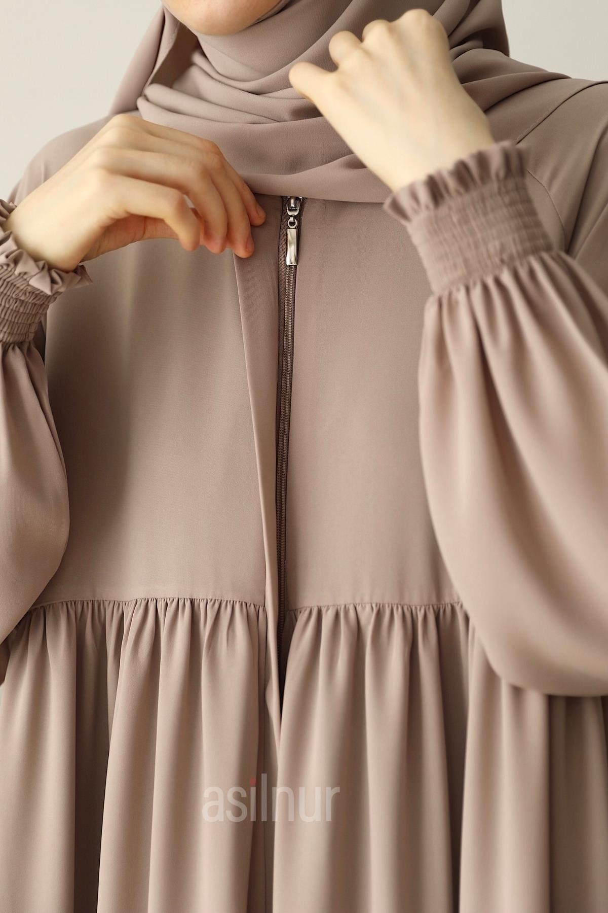 Nisa Ferace Şal Hediyeli Takım, 1. Sınıf Mısır Medine ipeği kumaşıyla dört mevsim kullanım için idealdir. Rahat kalıbı, gipe lastik kolları, cep ve fermuar detaylarıyla konforlu bir şıklık sunar. Ürünle birlikte gelen aynı renk şal hediyesiyle kombininiz tamamlanır.