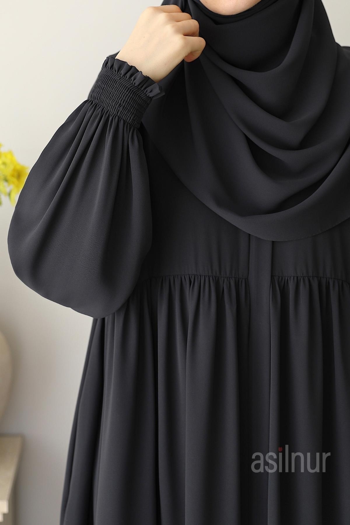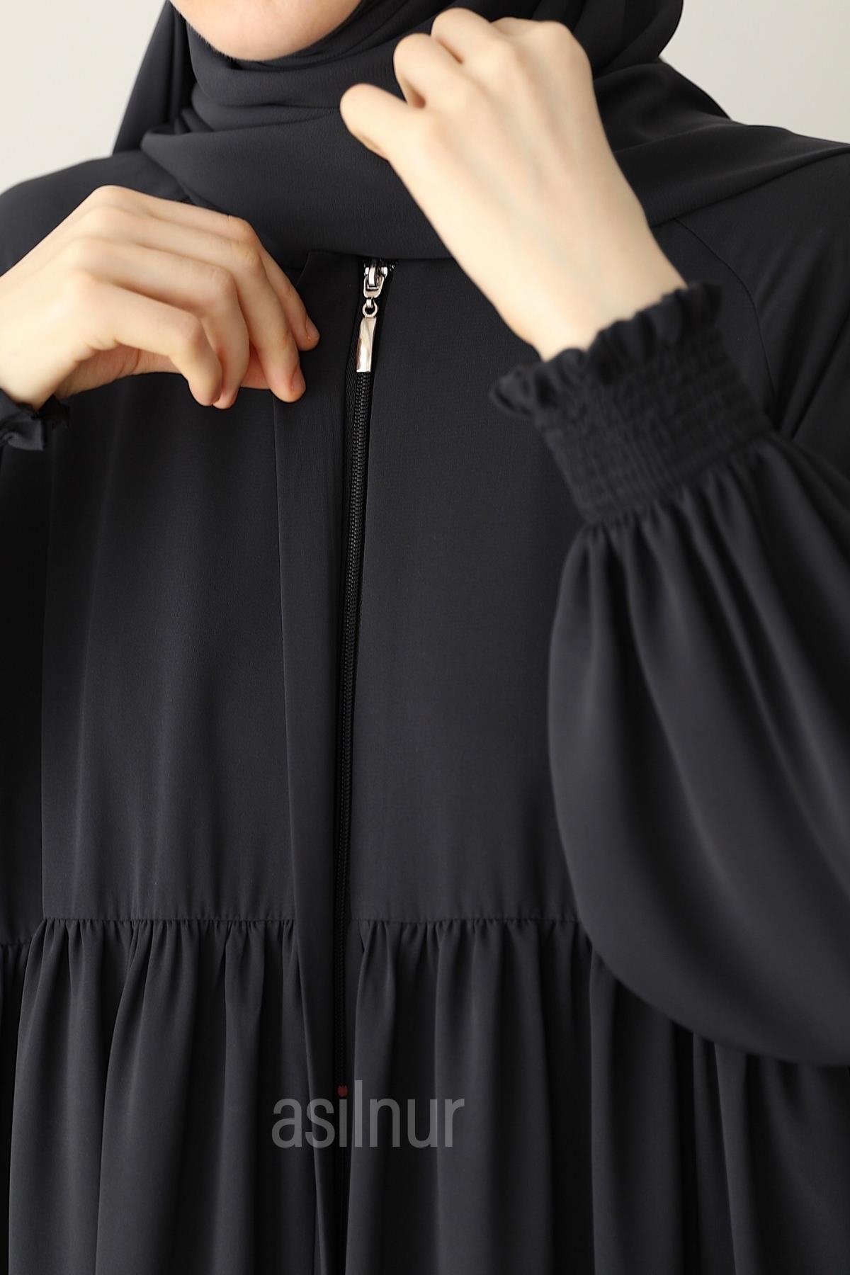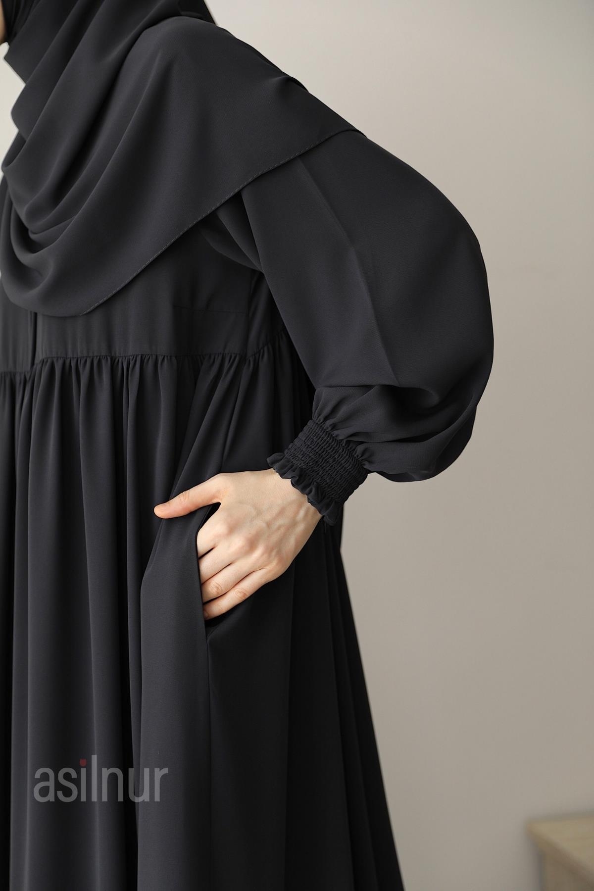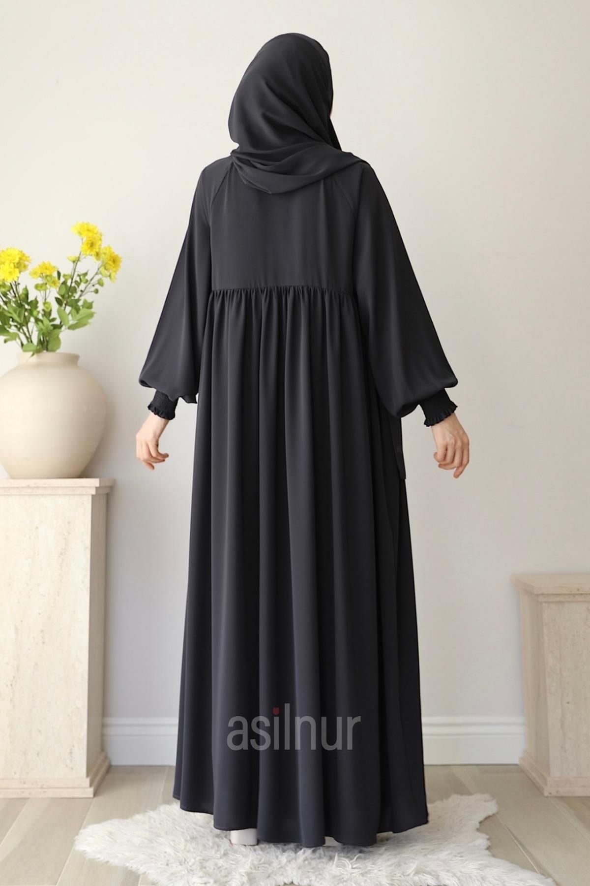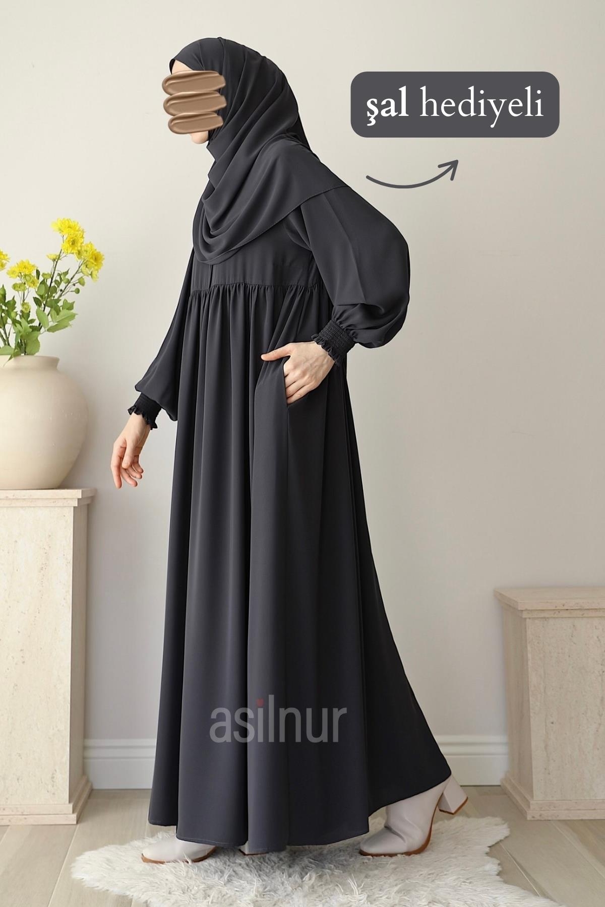 Nisa Ferace Şal Hediyeli Takım, 1. Sınıf Mısır Medine ipeği kumaşıyla dört mevsim kullanım için idealdir. Rahat kalıbı, gipe lastik kolları, cep ve fermuar detaylarıyla konforlu bir şıklık sunar. Ürünle birlikte gelen aynı renk şal hediyesiyle kombininiz tamamlanır.