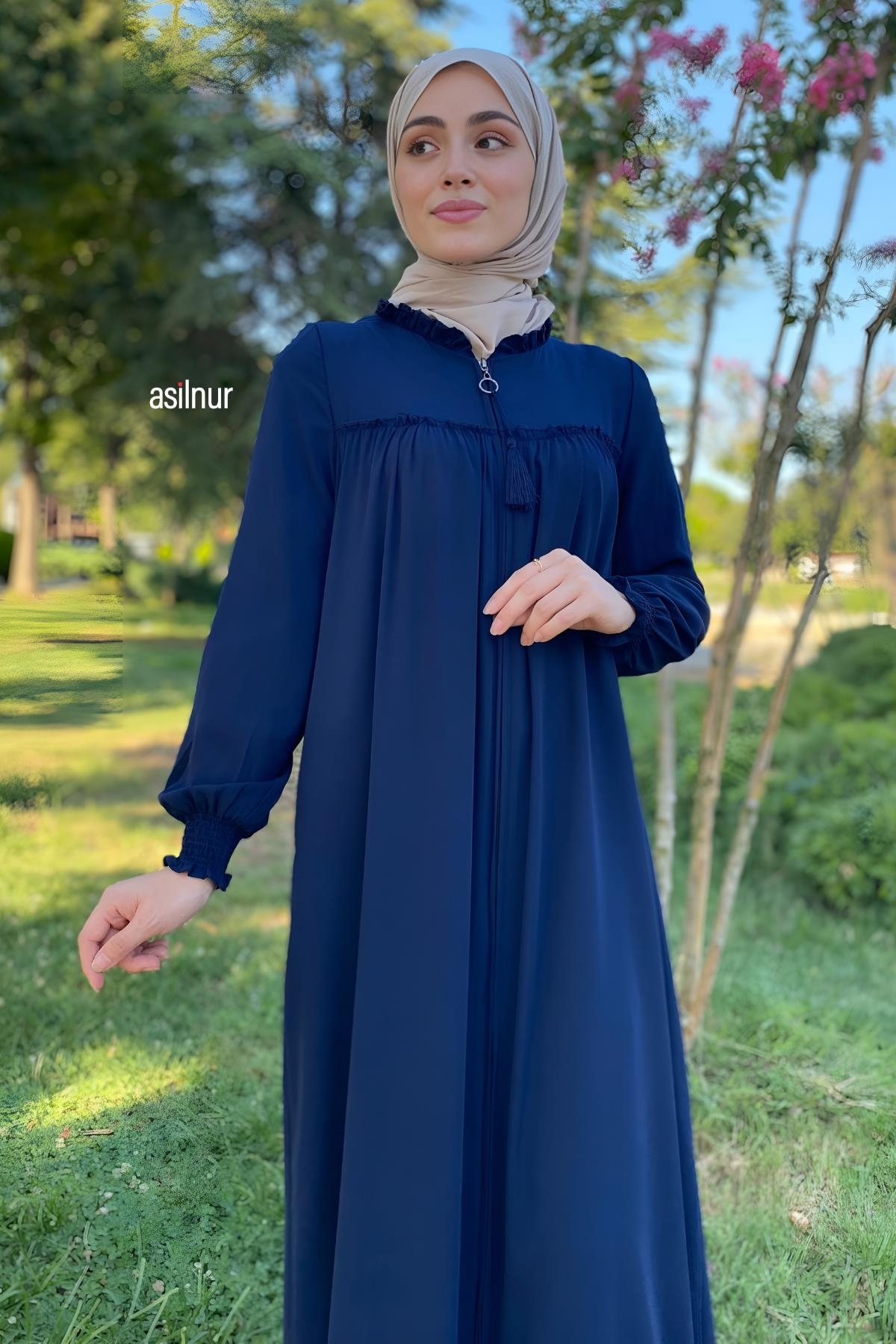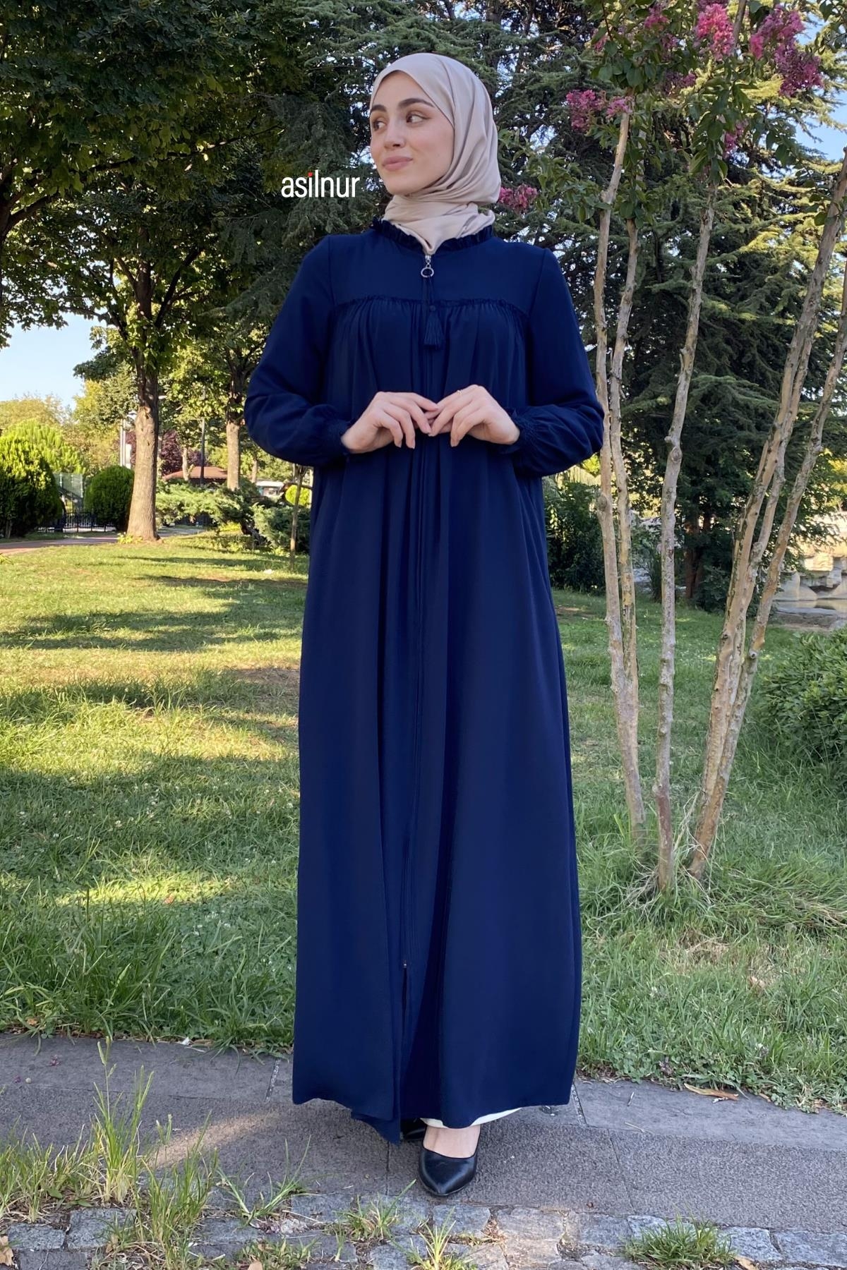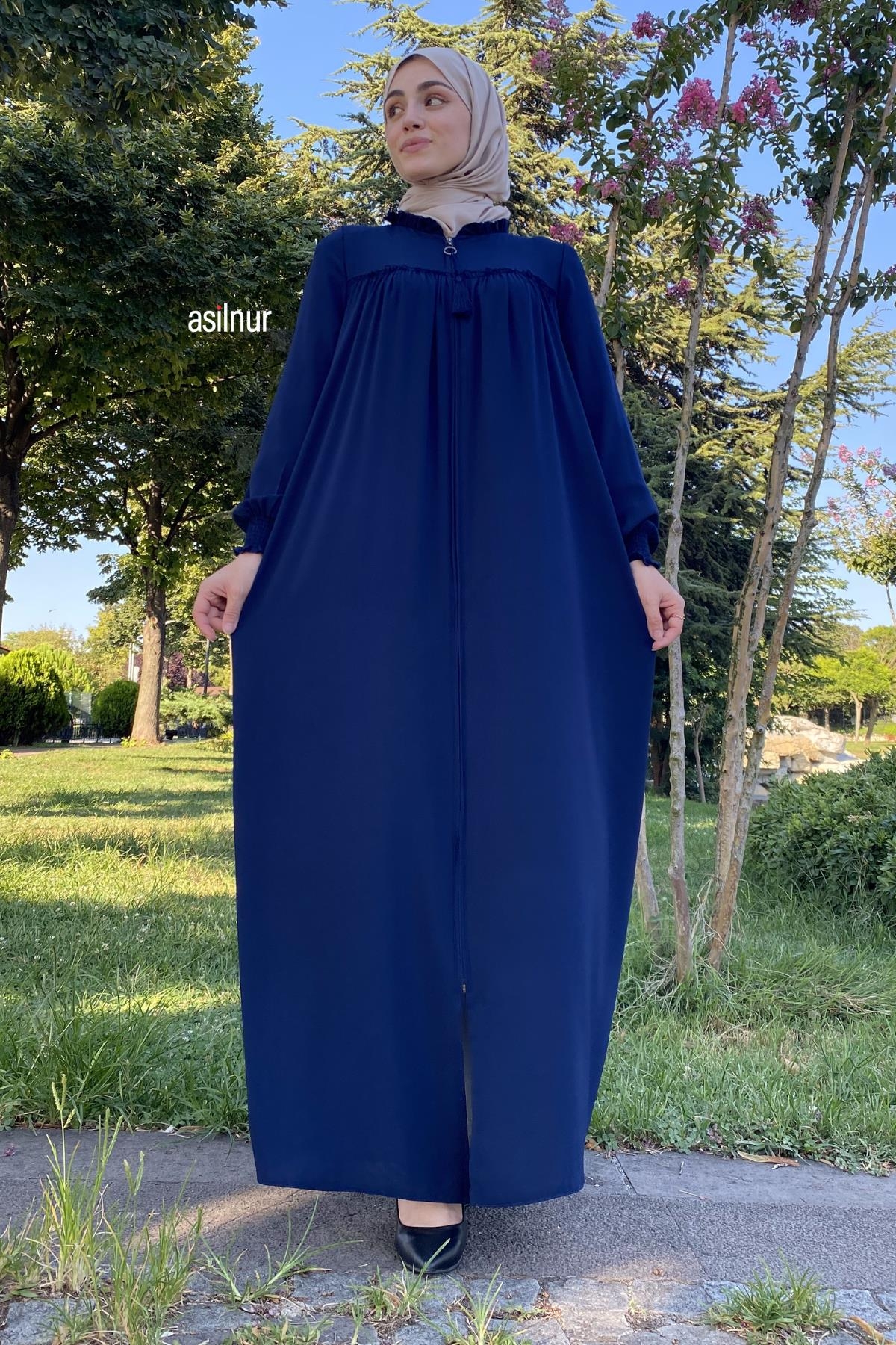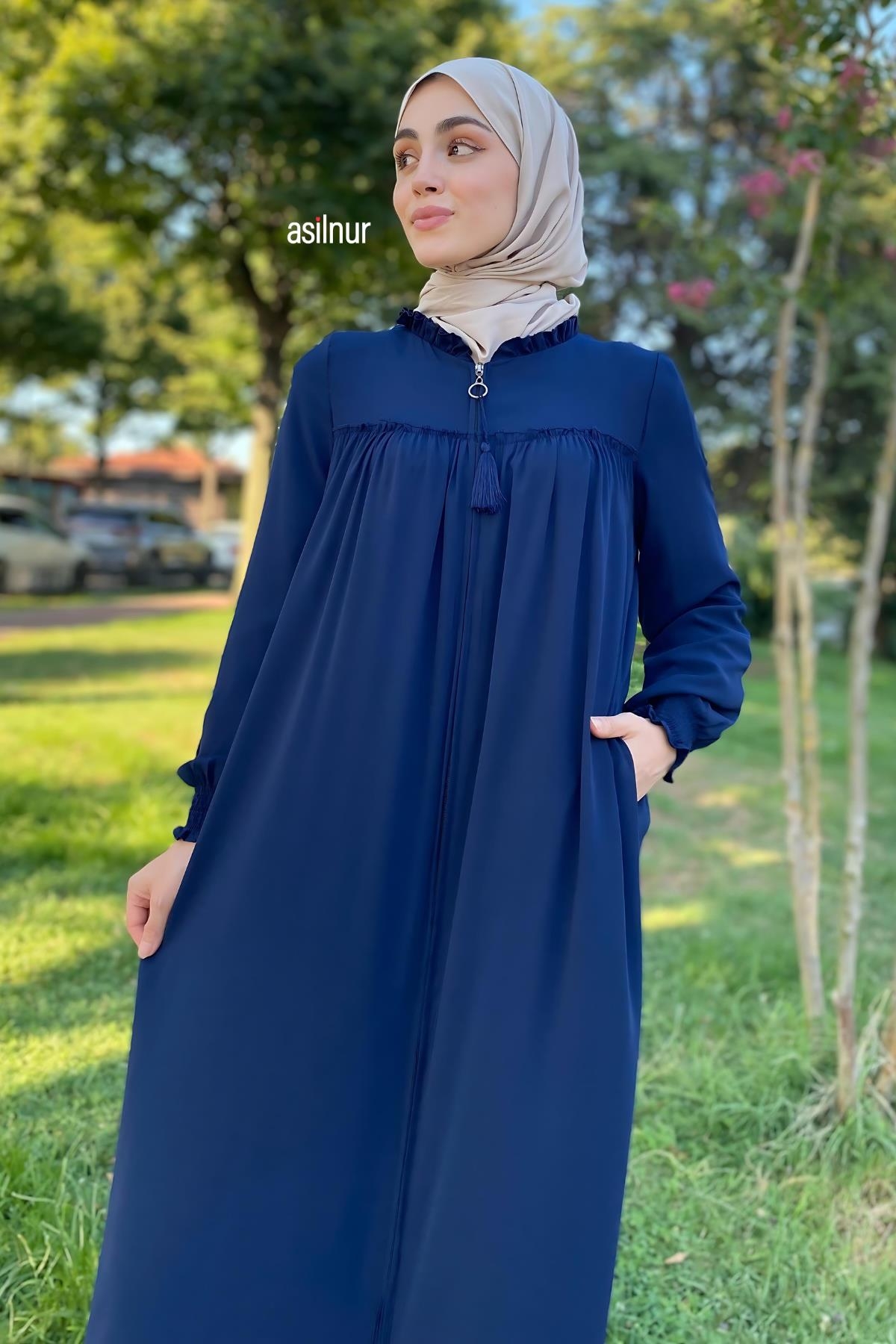 Tam kalıbı, bisiklet yaka tasarımı ve robalı detaylarıyla klasik bir duruş sergileyen bu model, lastikli manşetleri ve fermuar detayı ile rahat bir kullanım sunar. Cep detayı sayesinde günlük kullanıma uygun, zarif bir feracedir.