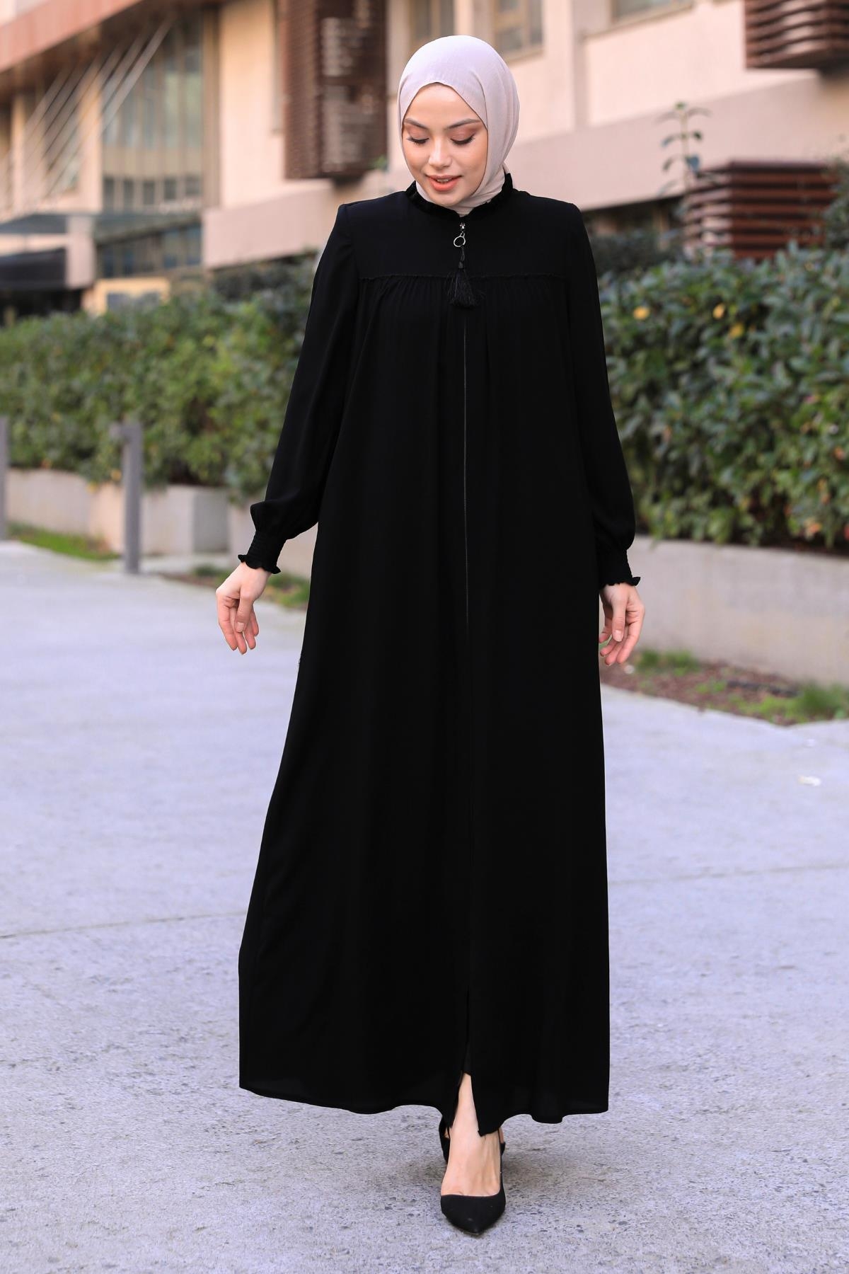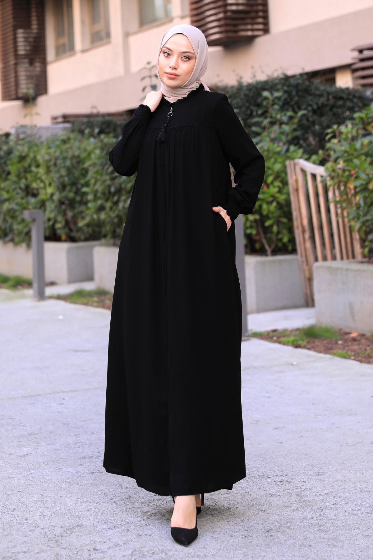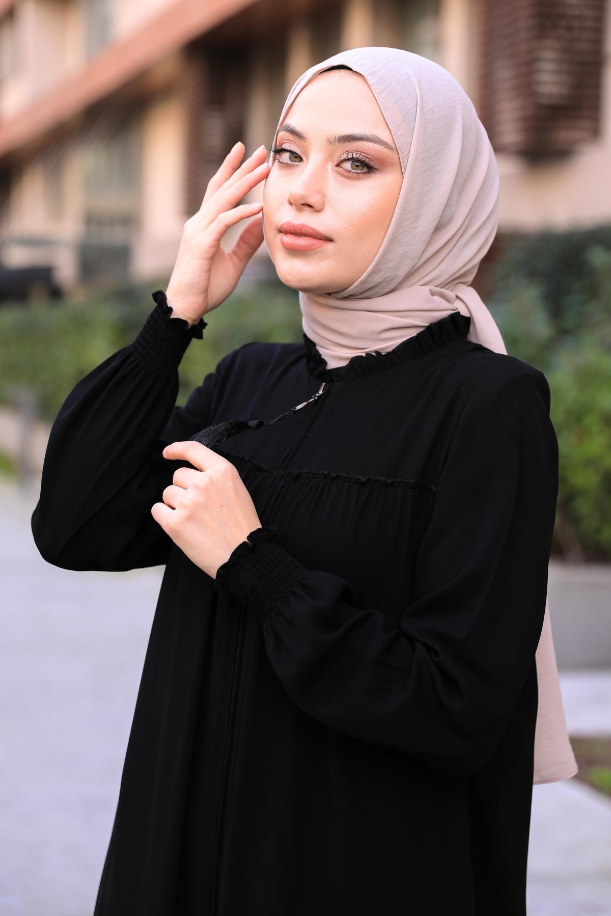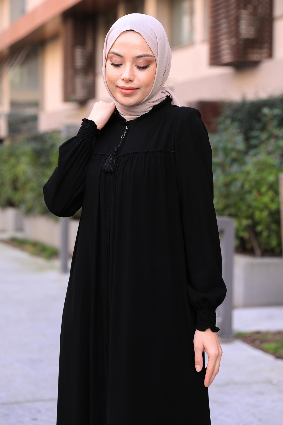Tam kalıbı, bisiklet yaka tasarımı ve robalı detaylarıyla klasik bir duruş sergileyen bu model, lastikli manşetleri ve fermuar detayı ile rahat bir kullanım sunar. Cep detayı sayesinde günlük kullanıma uygun, zarif bir feracedir.