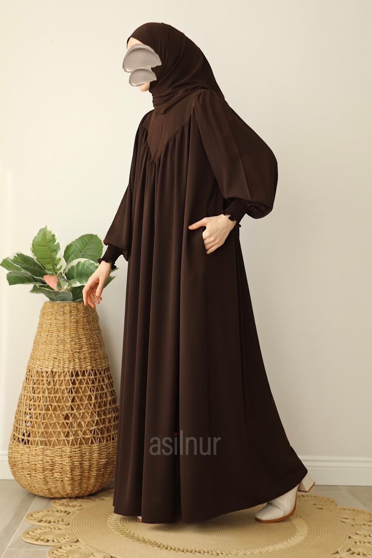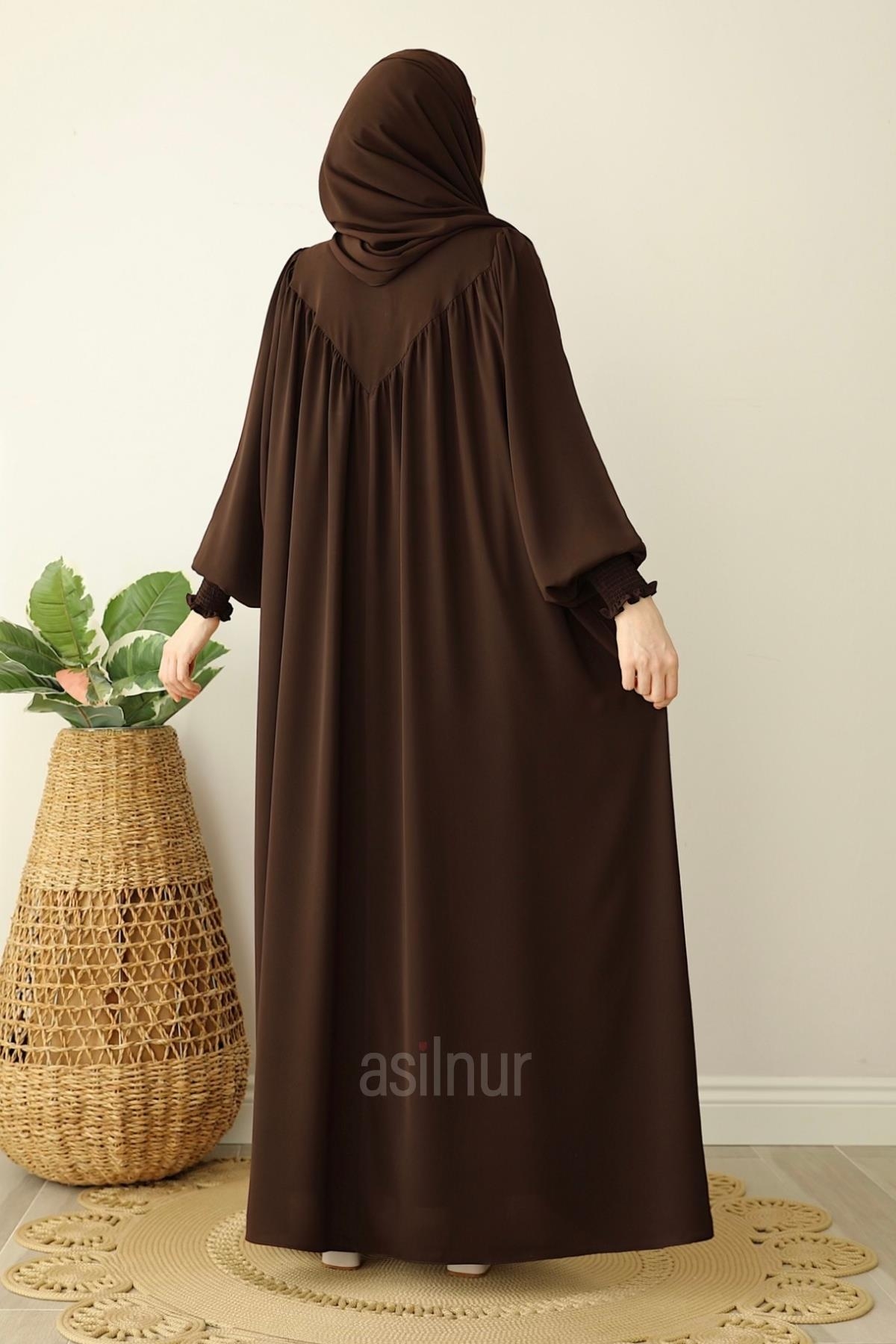 Sema Elbise Şal Hediyeli Takım, Medine ipeği kumaşıyla hafif, dökümlü ve dört mevsim kullanıma uygundur. Gipe lastikli kolları rahat bir kullanım sunarken cep detayı ve göğüste yer alan küçük fermuar elbiseye hem fonksiyonel hem şık bir dokunuş katar.