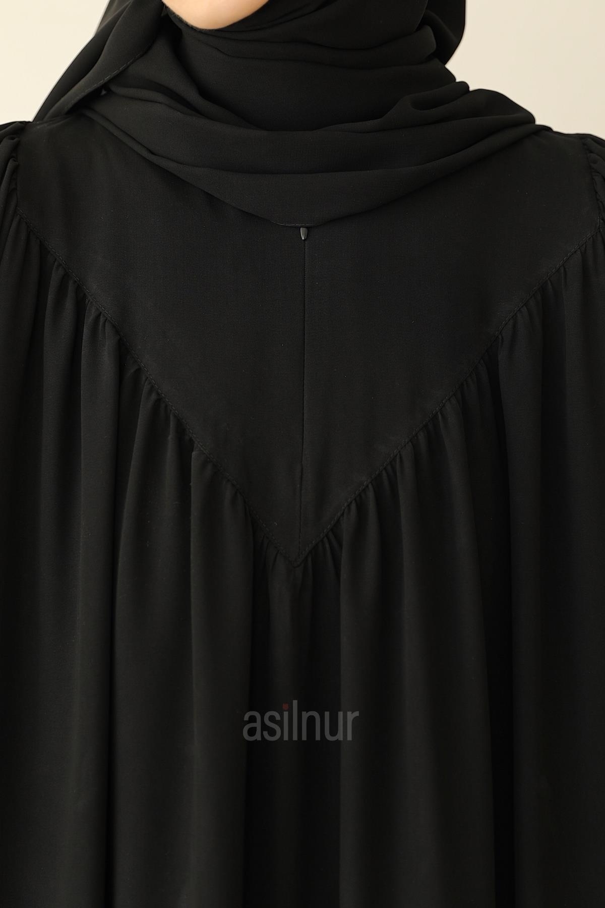 Sema Elbise Şal Hediyeli Takım, Medine ipeği kumaşıyla hafif, dökümlü ve dört mevsim kullanıma uygundur. Gipe lastikli kolları rahat bir kullanım sunarken cep detayı ve göğüste yer alan küçük fermuar elbiseye hem fonksiyonel hem şık bir dokunuş katar.