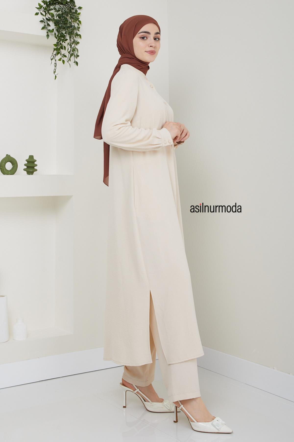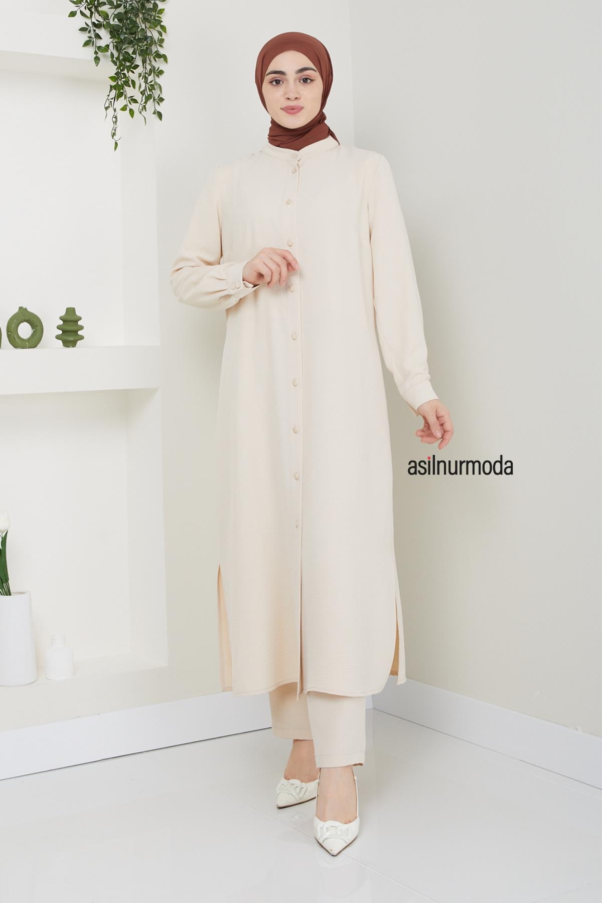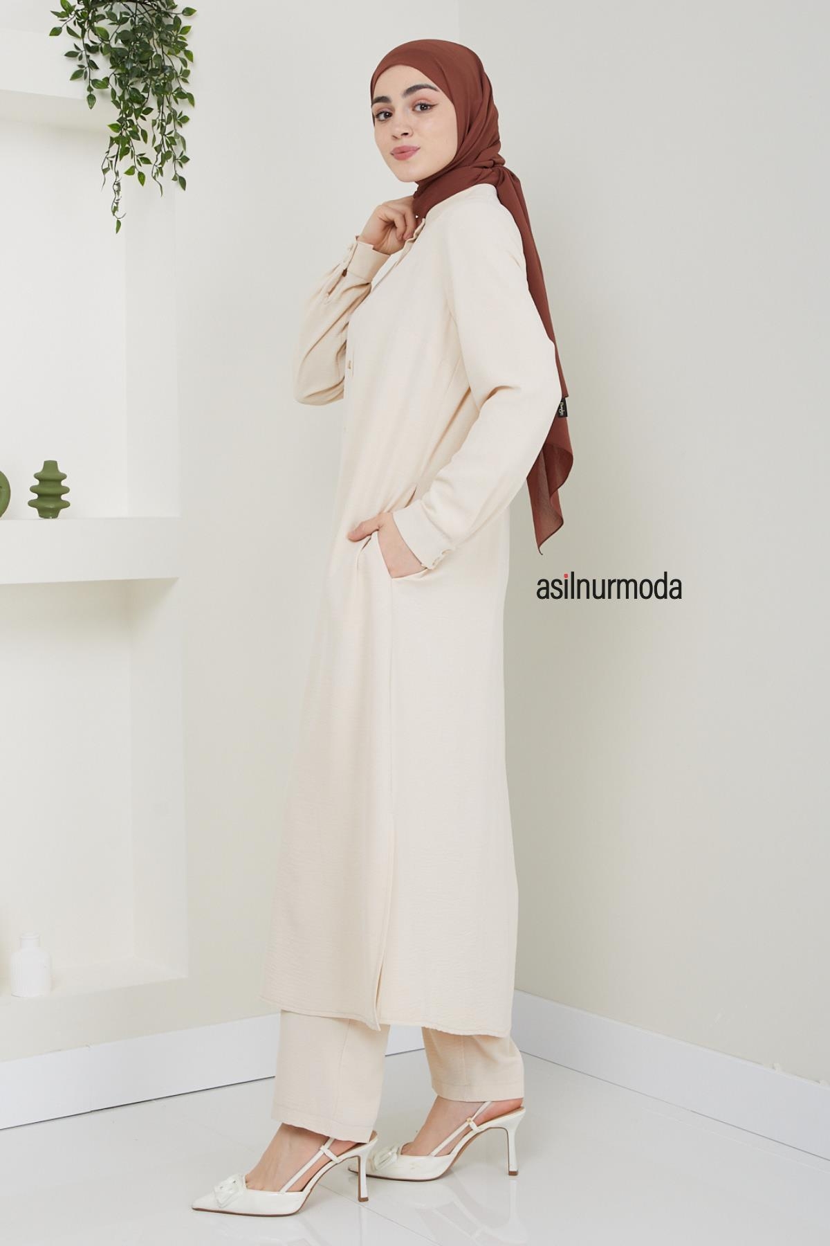 Düğmeli İkili Takım hafif Ayrobin kumaşıyla dört mevsim boyunca konforlu bir kullanım sunar. Rahat kalıbı, hakim yaka tasarımı ve düğmeli kol detaylarıyla şıklığı ve sadeliği bir araya getirir.