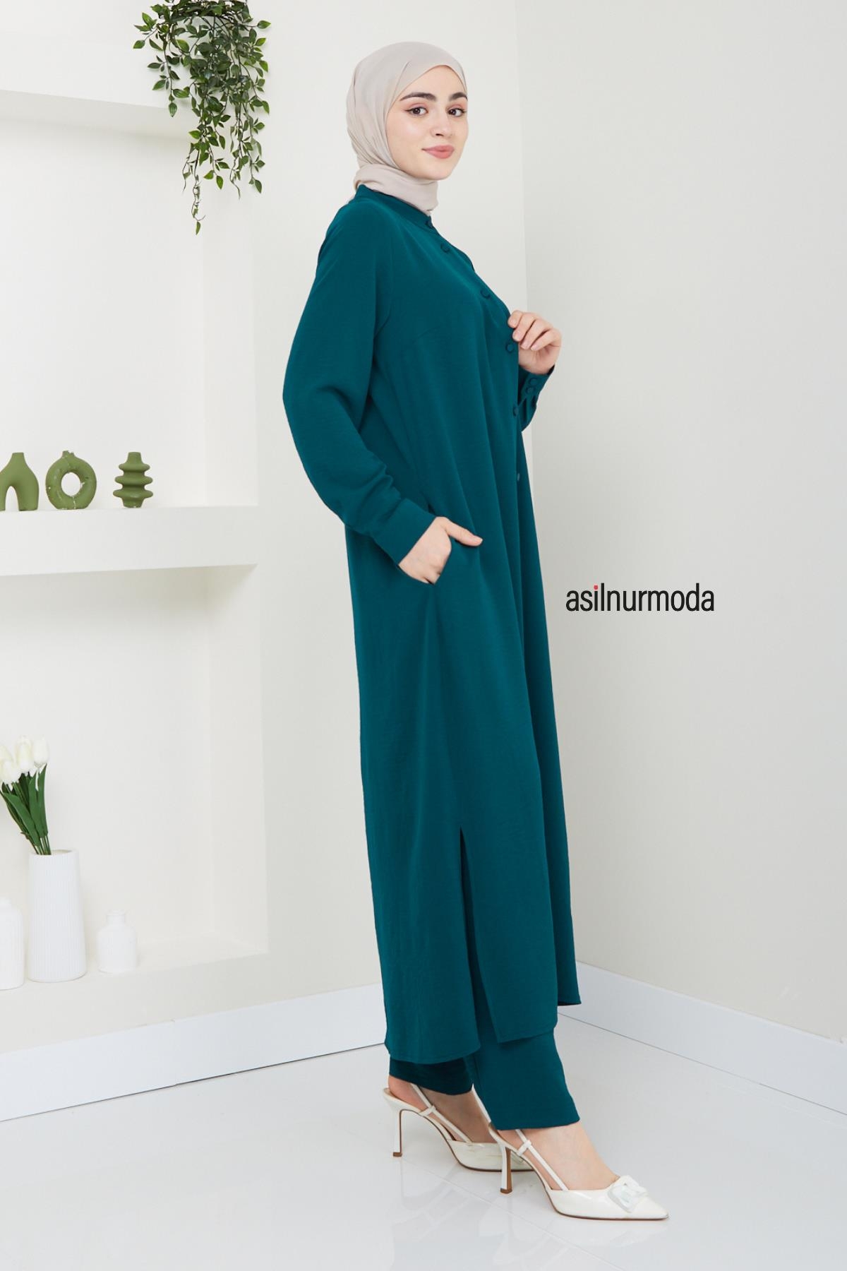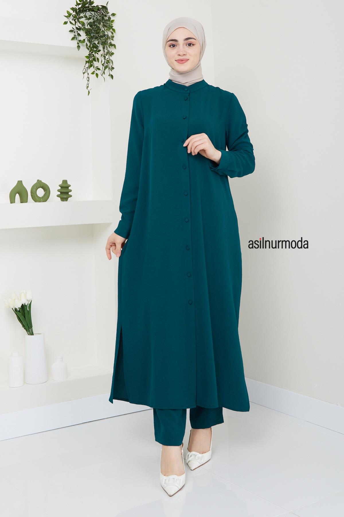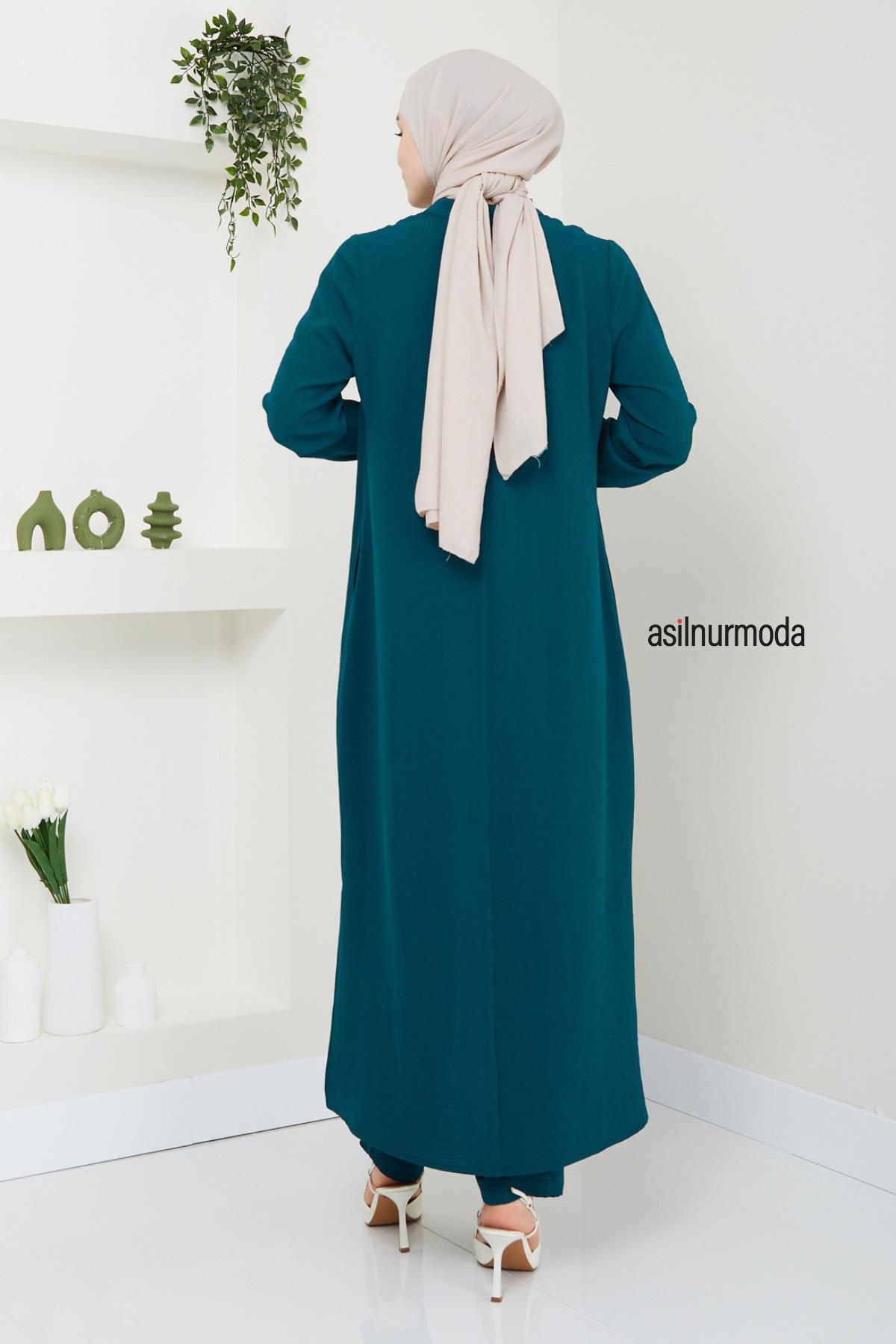 Düğmeli İkili Takım hafif Ayrobin kumaşıyla dört mevsim boyunca konforlu bir kullanım sunar. Rahat kalıbı, hakim yaka tasarımı ve düğmeli kol detaylarıyla şıklığı ve sadeliği bir araya getirir.
