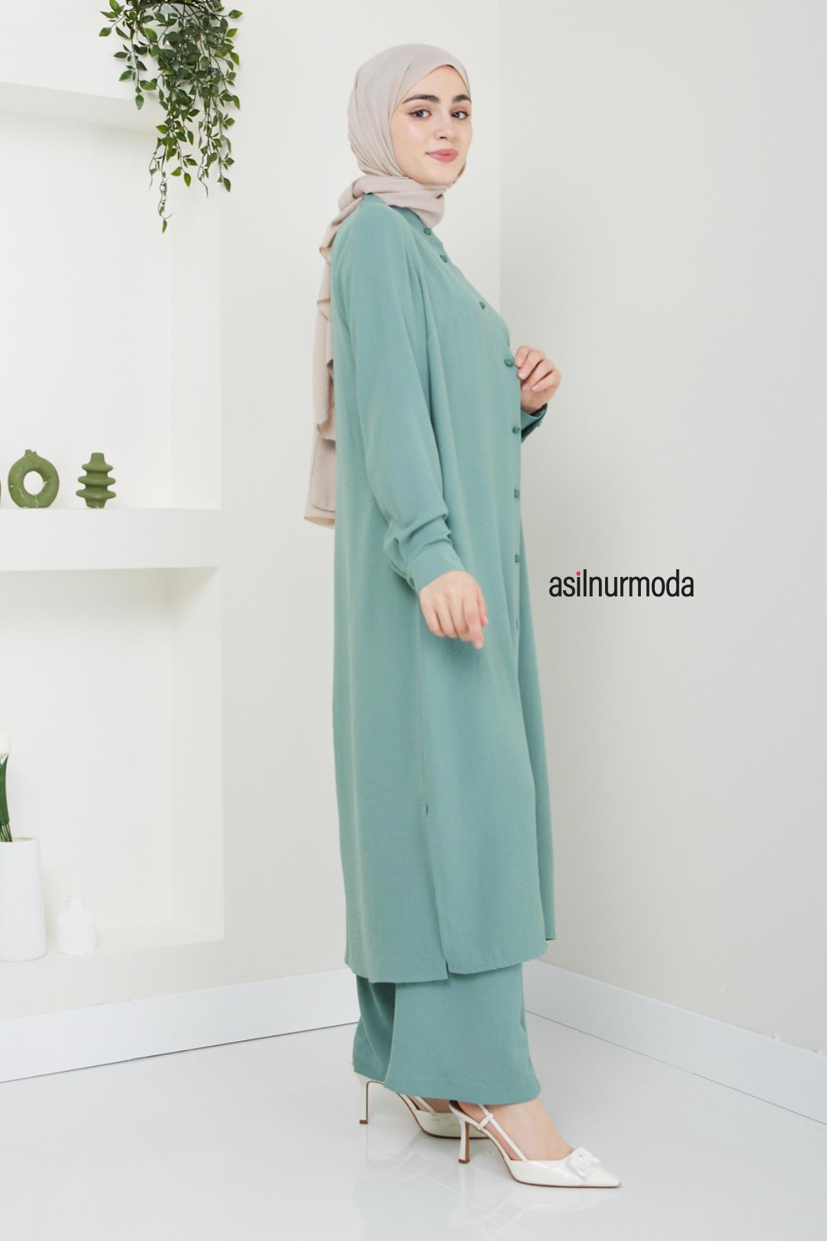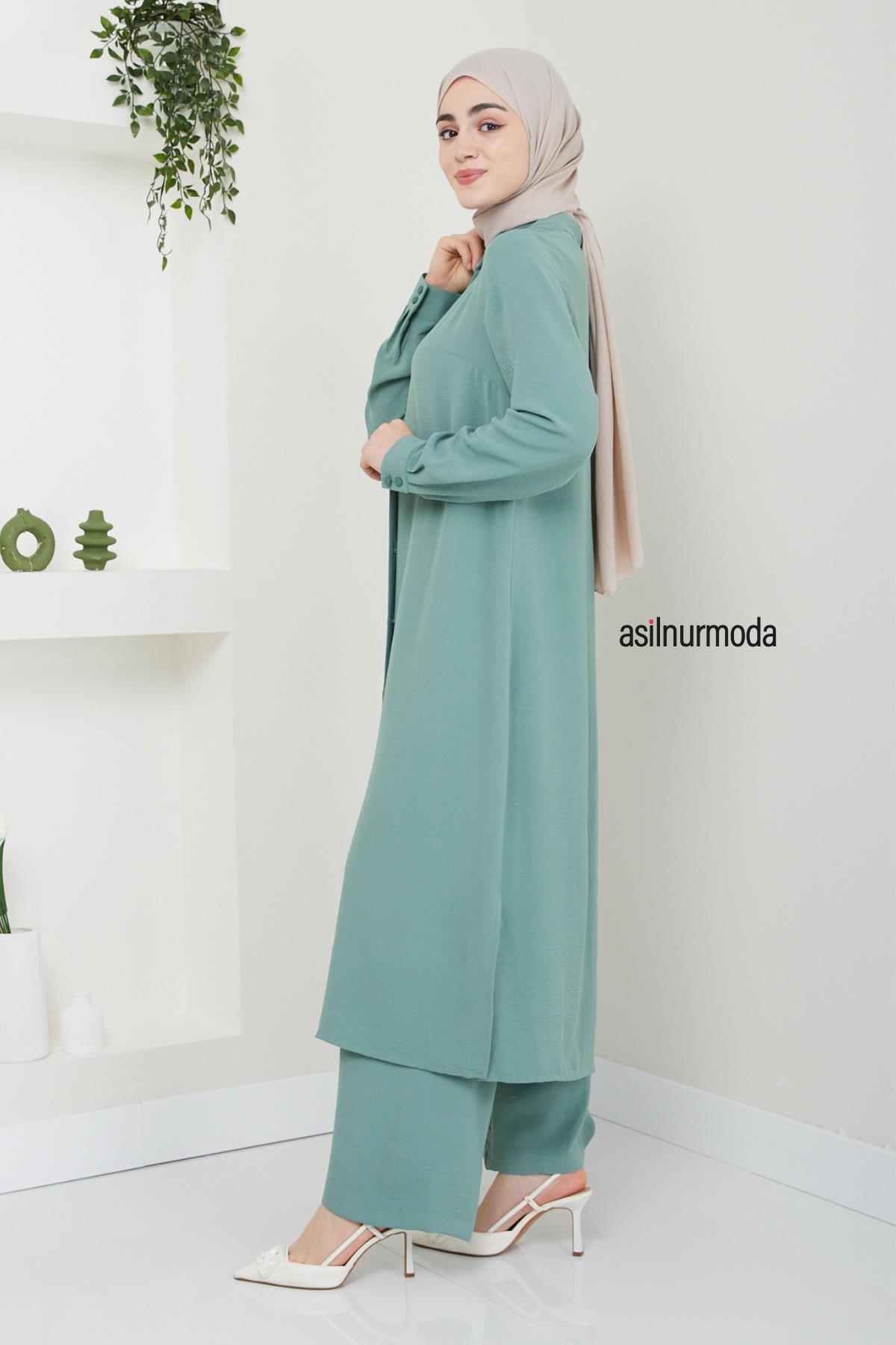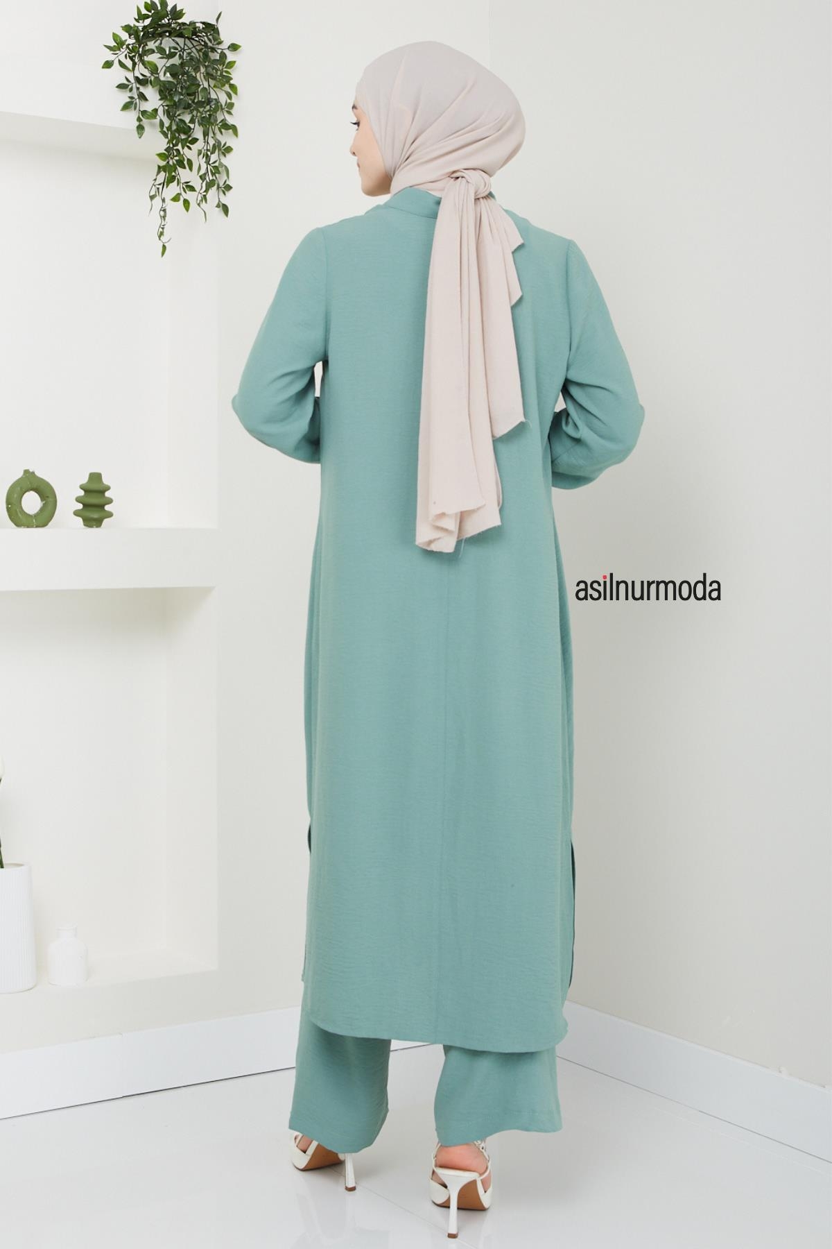 Düğmeli İkili Takım hafif Ayrobin kumaşıyla dört mevsim boyunca konforlu bir kullanım sunar. Rahat kalıbı, hakim yaka tasarımı ve düğmeli kol detaylarıyla şıklığı ve sadeliği bir araya getirir.