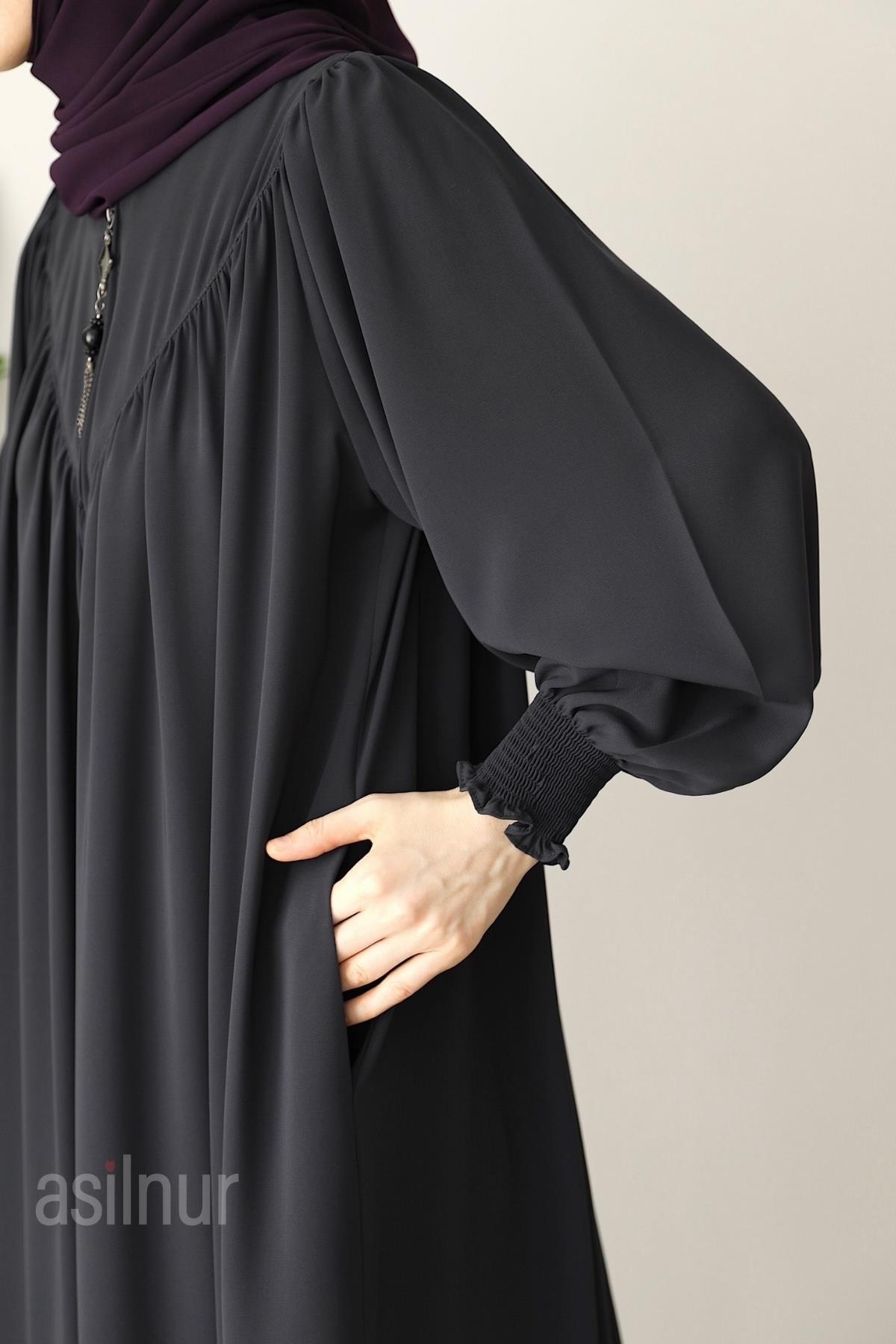 Vera Ferace göğüs kısmındaki V şeklinde büzgü detayıyla zarif bir duruş sergilerken Medine İpeği kumaşı sayesinde dört mevsim boyunca şıklığınızı tamamlar.