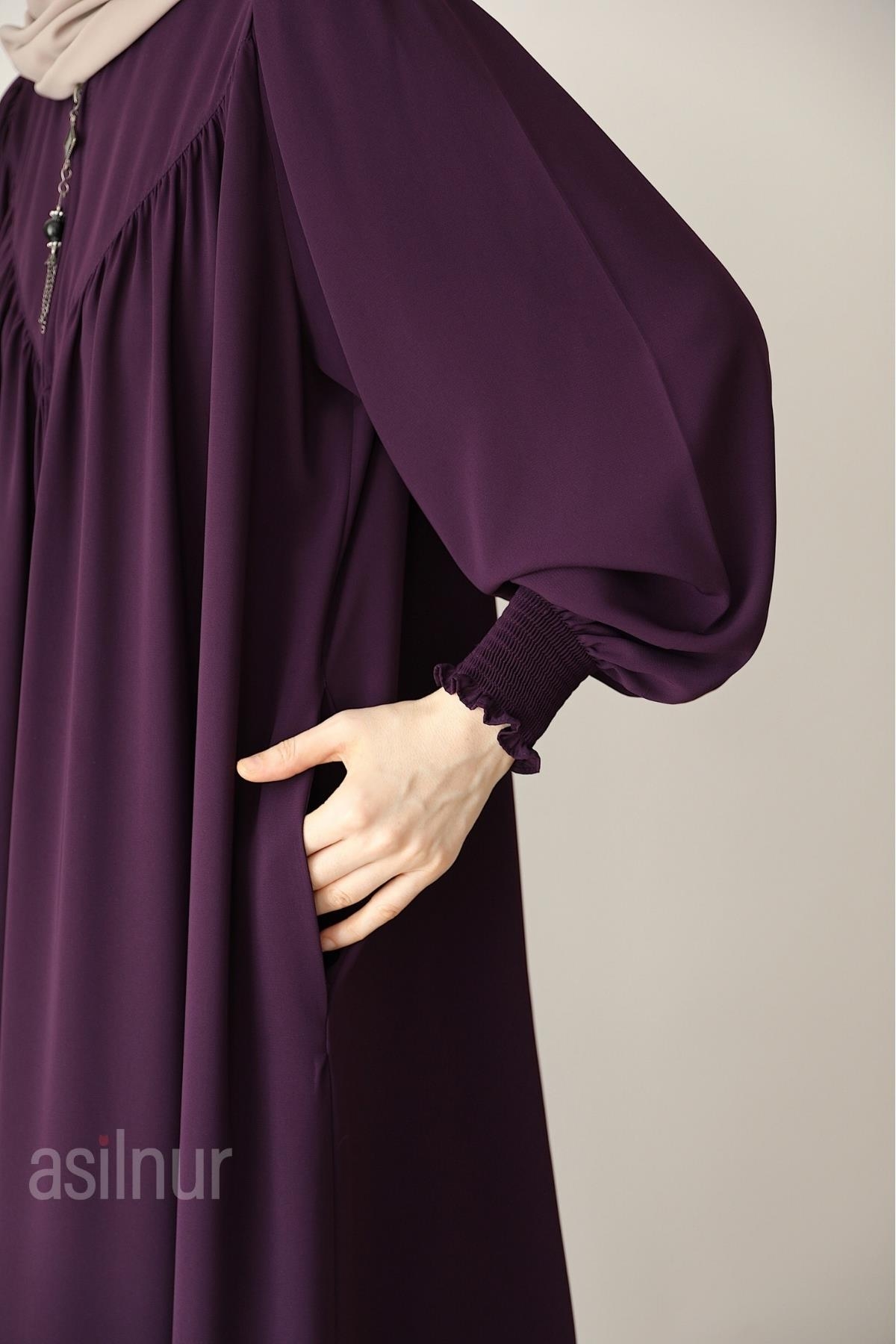 Vera Ferace göğüs kısmındaki V şeklinde büzgü detayıyla zarif bir duruş sergilerken Medine İpeği kumaşı sayesinde dört mevsim boyunca şıklığınızı tamamlar.
