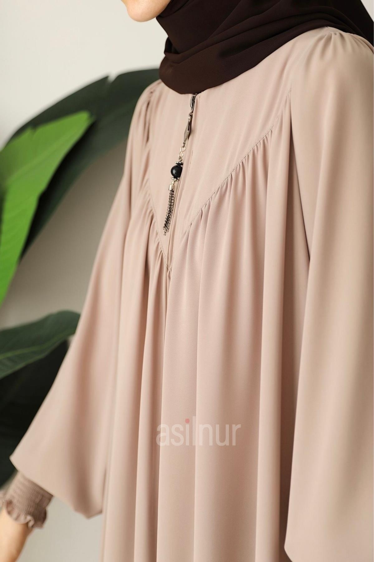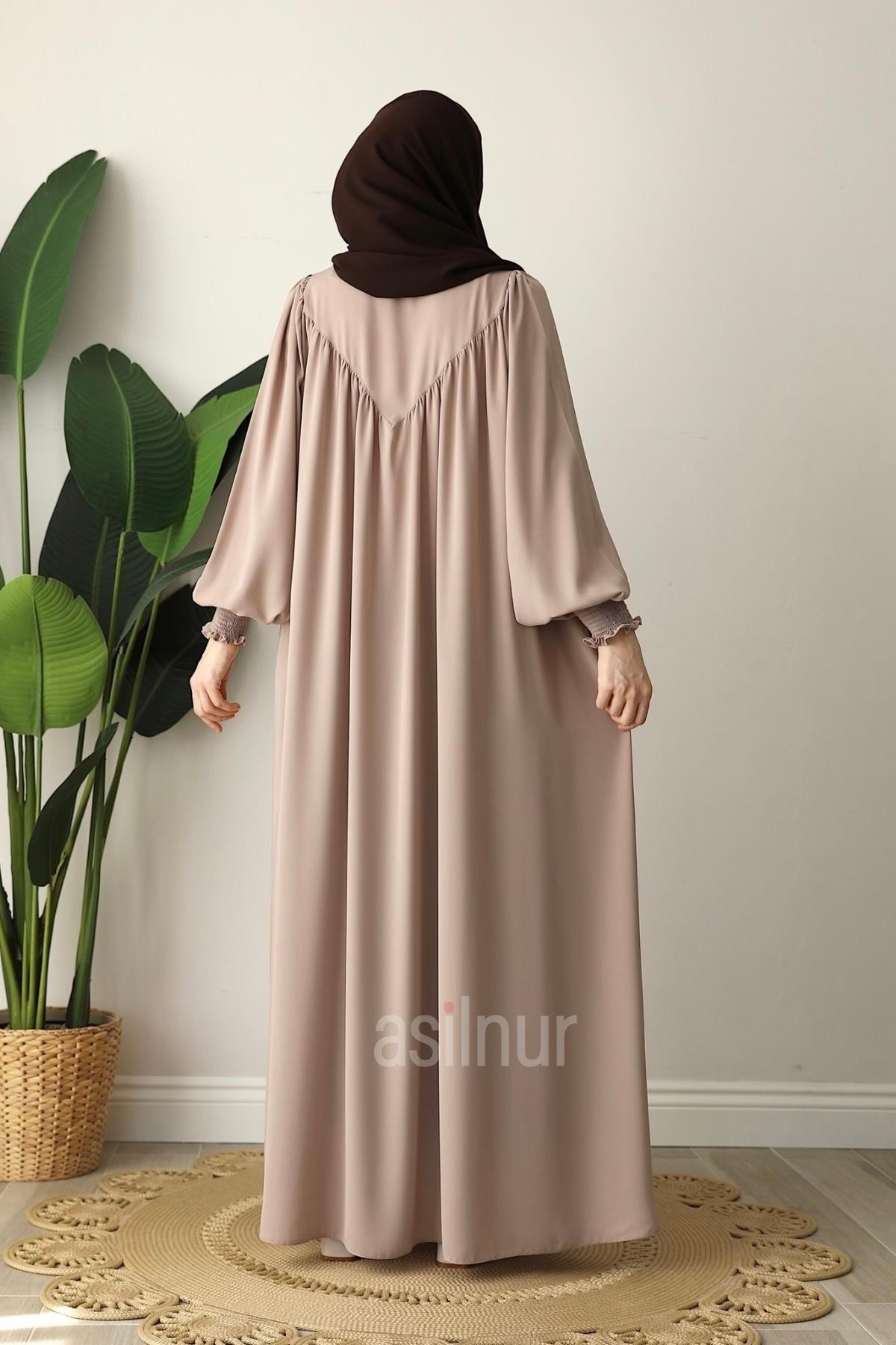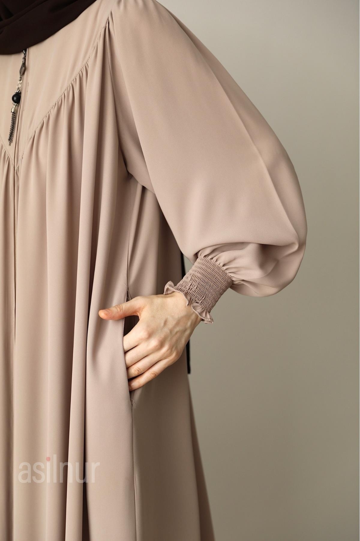 Vera Ferace göğüs kısmındaki V şeklinde büzgü detayıyla zarif bir duruş sergilerken Medine İpeği kumaşı sayesinde dört mevsim boyunca şıklığınızı tamamlar.