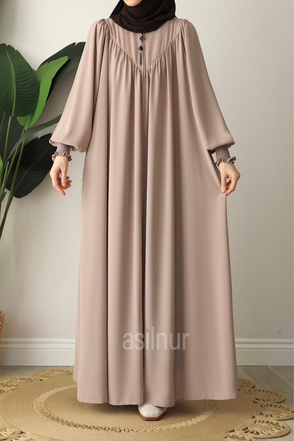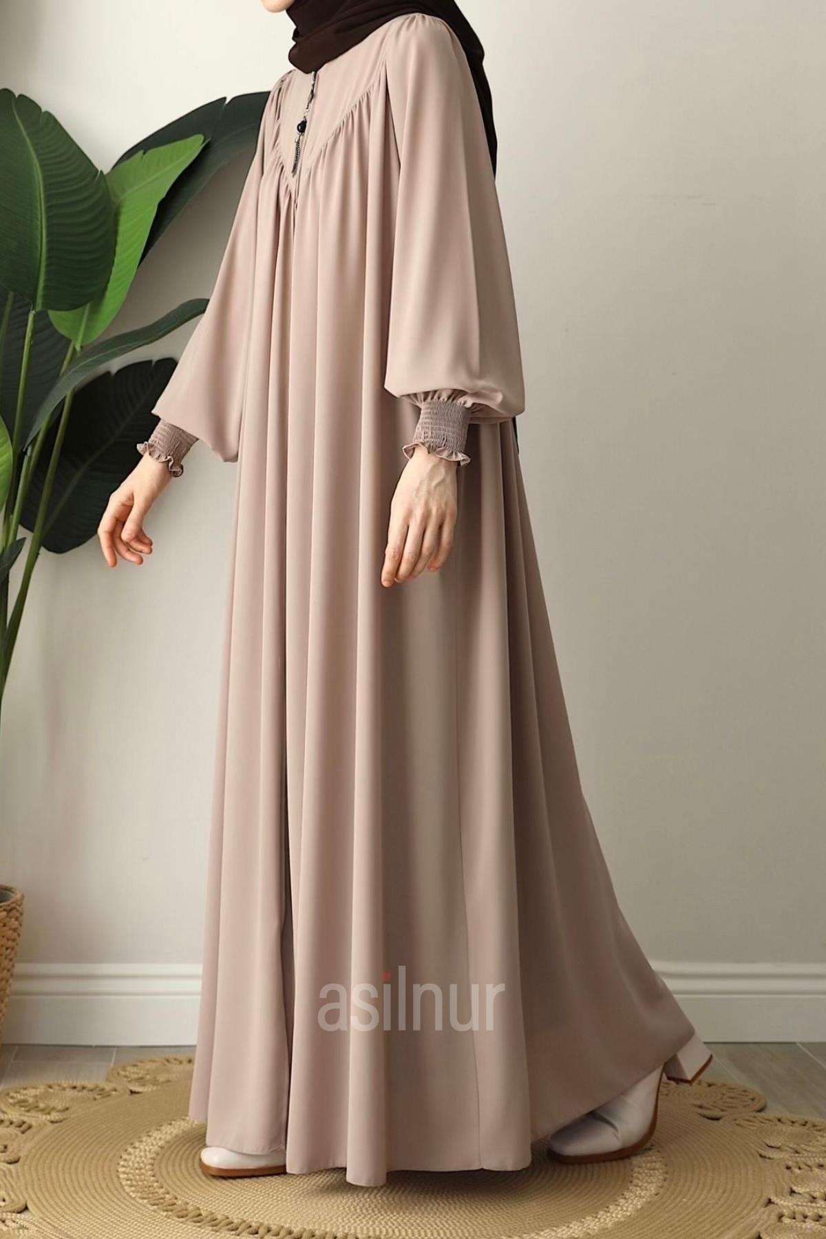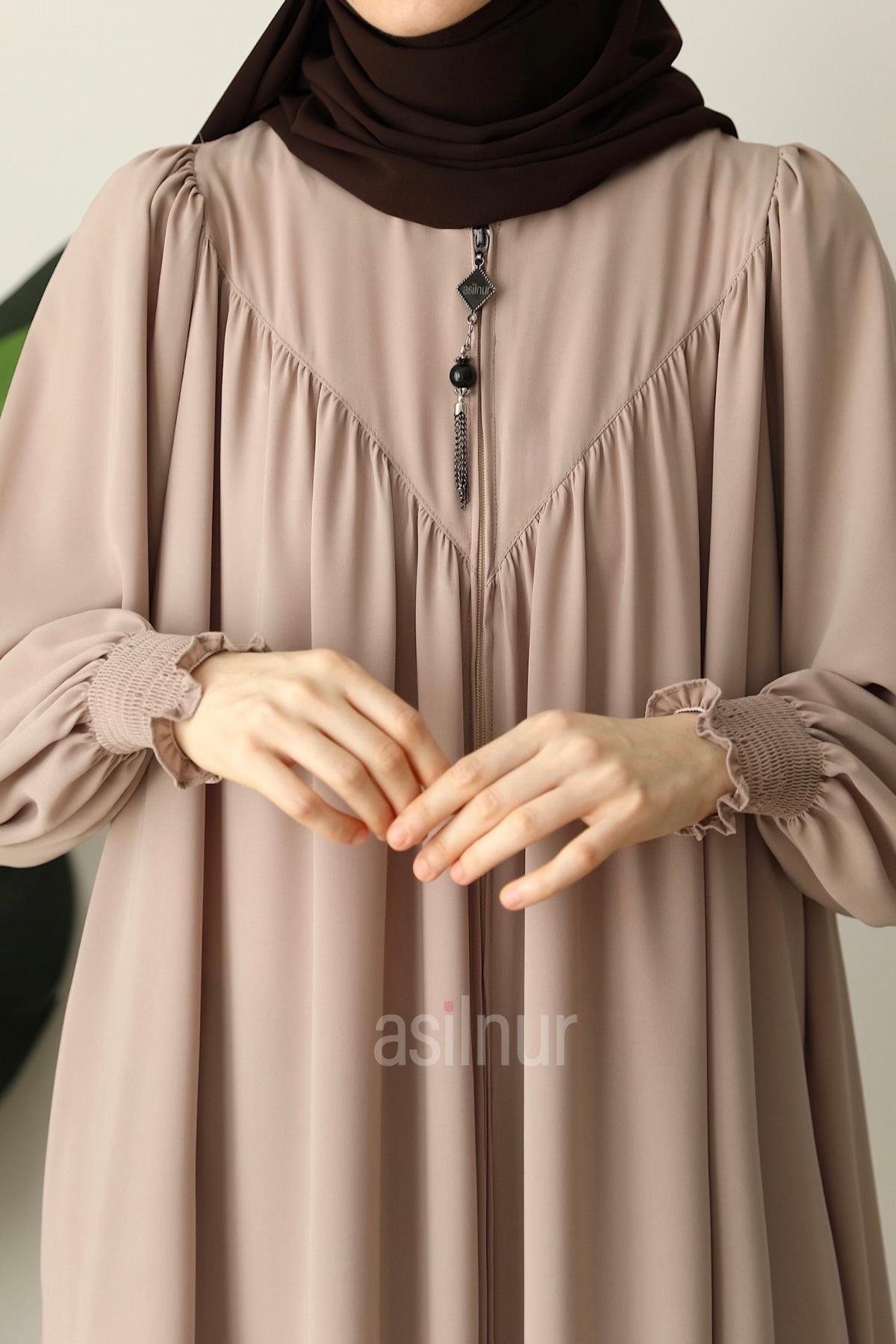 Vera Ferace göğüs kısmındaki V şeklinde büzgü detayıyla zarif bir duruş sergilerken Medine İpeği kumaşı sayesinde dört mevsim boyunca şıklığınızı tamamlar.