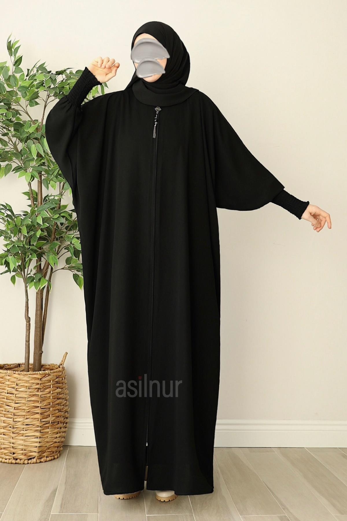 Ebru Yarasa Kollu Ferace Medine İpeği kumaşıyla dört mevsim kullanıma uygundur ve rahat kalıptır.